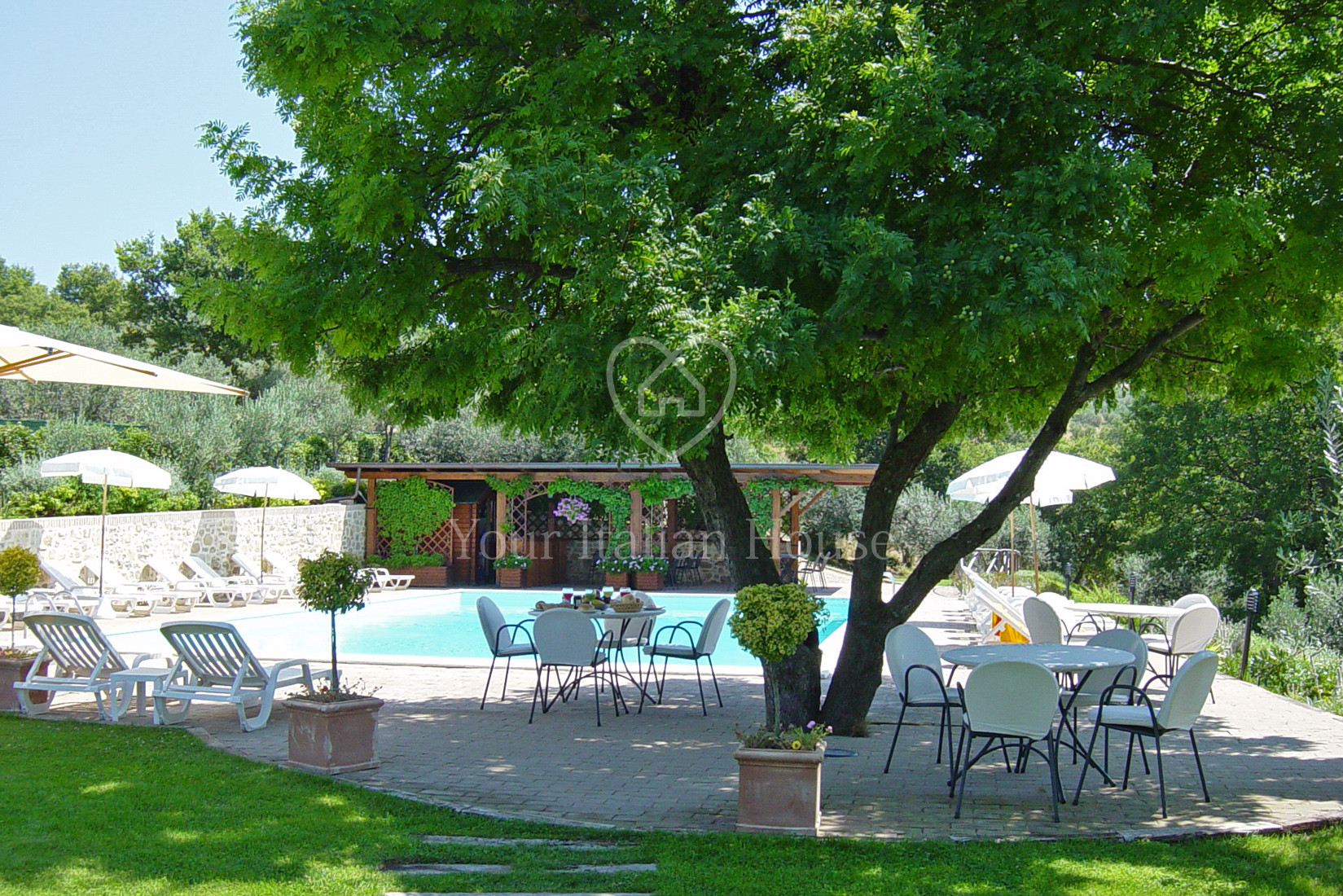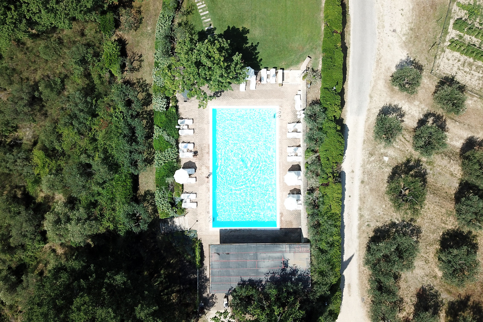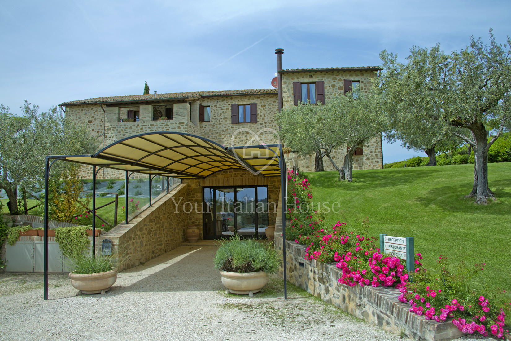 Very close to the beautiful city of Assisi, on one of the most beautiful, uncontaminated and scenic hills of the Assisi area, stands a wonderful farmhouse, currently used as an accommodation business. On the floor below the street we have a large reception room, a professional kitchen, three bathrooms, a basement and the two technical rooms of the warehouse/pantry and the storage room. On the ground floor there are 4 apartments: two three-room apartments and two two-room apartments. On the first floor there are 4 other apartments, all two-room apartments, whose external access staircase leads to a beautiful covered terrace, from which you can enjoy the wonderful view of the valley or the olive trees behind. The property has a surface area of approximately 800 sqm. All the flooring was expertly made with tagina ceramic when the entire property was built from scratch in 1997. The materials and furnishings reflect the simplicity and amenity of the place, blending perfectly with the surrounding nature. The property includes a 15 x 8 meter swimming pool, with a solarium area and a lawn in front whose slightly uphill construction was specifically designed to guarantee silence for the nearby residential property. The surrounding land is 2.7 hectares, with approximately 500 olive trees. Worth mentioning is the presence, in a reserved area, of a 20 KW photovoltaic system.