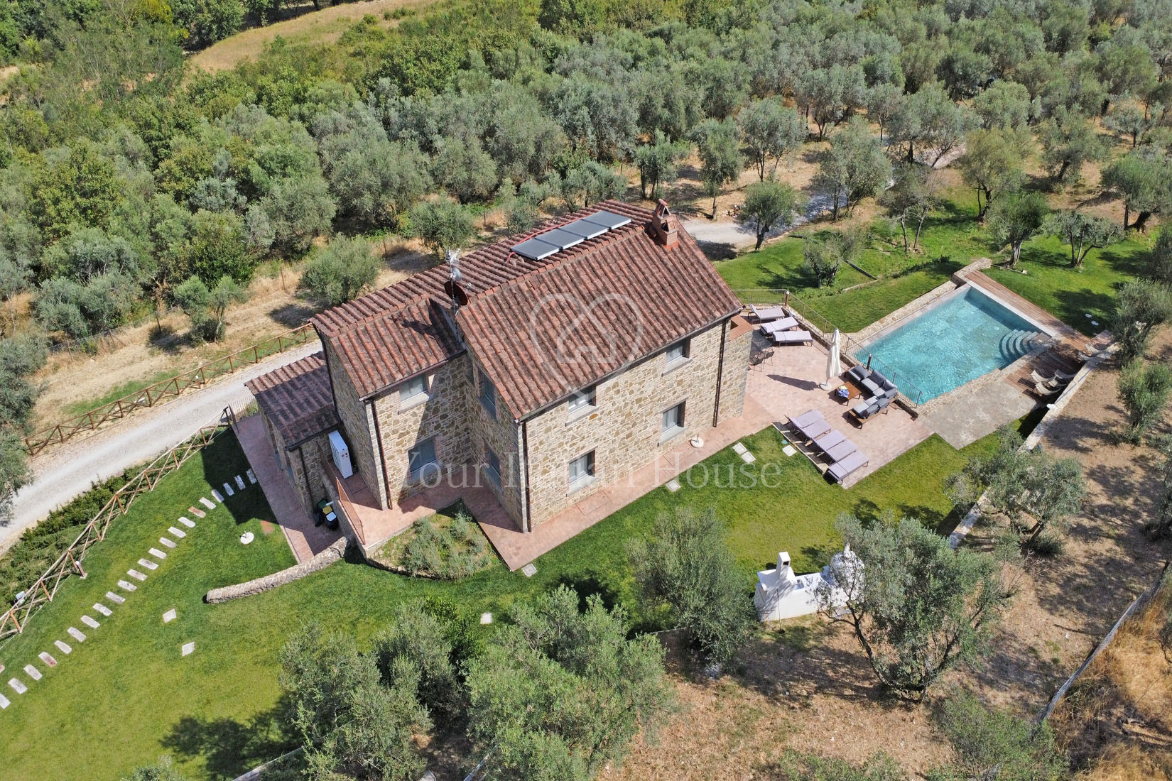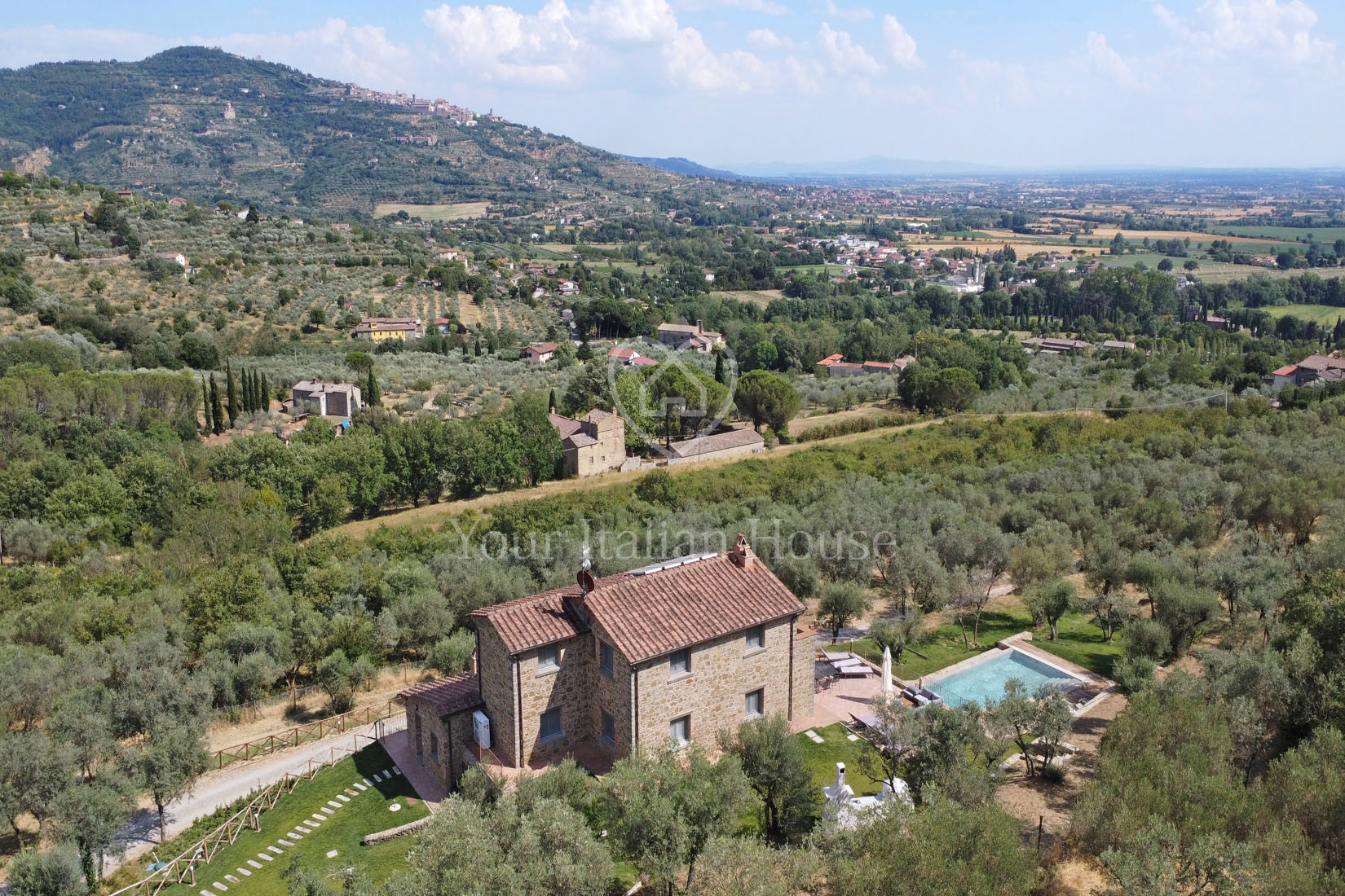 For sale gorgeous stone house of approx. 300 sqm in Cortona, Tuscany, with a total of 5 bedrooms, 6 bathrooms, 2.6 ha of land with olive grove and panoramic travertine pool.
