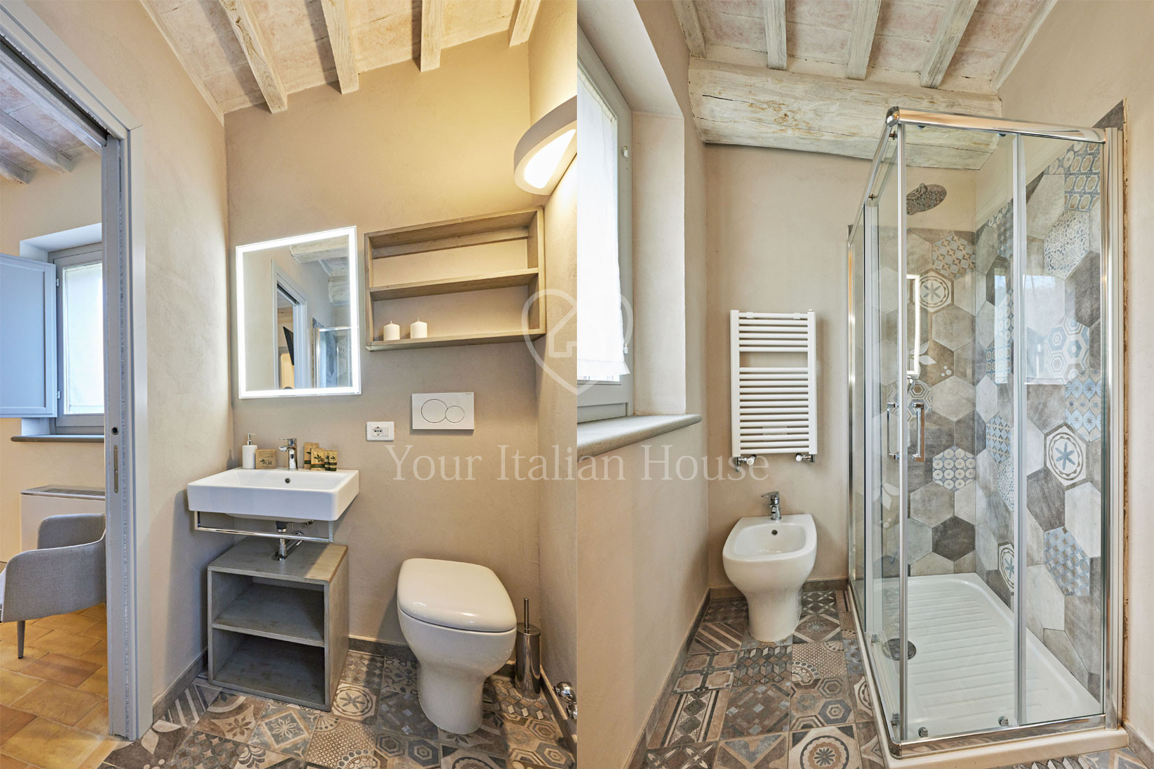 On the second floor there are 3 bedrooms with private bathroom and a romantic loggia with pool view, which leads to the external staircase.