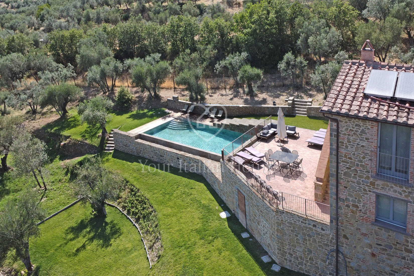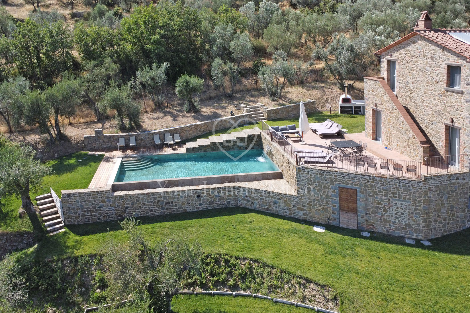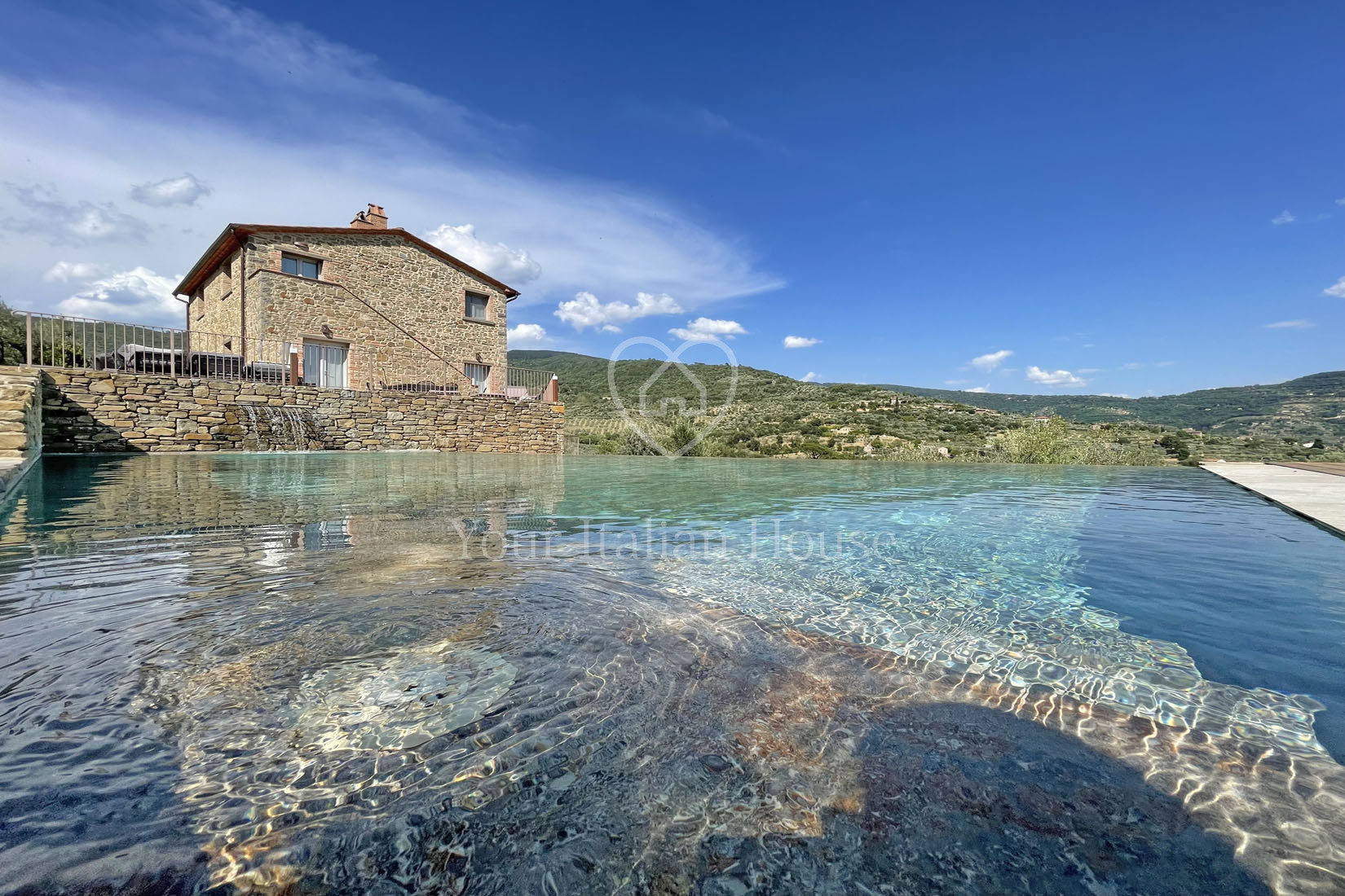 To enrich this fabulous property, we find an exclusive travertine swimming pool with waterfall, which overlooks the splendid Cortona landscape.