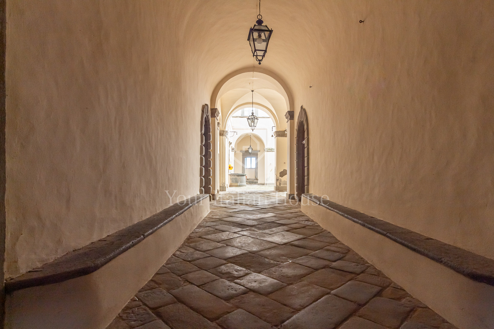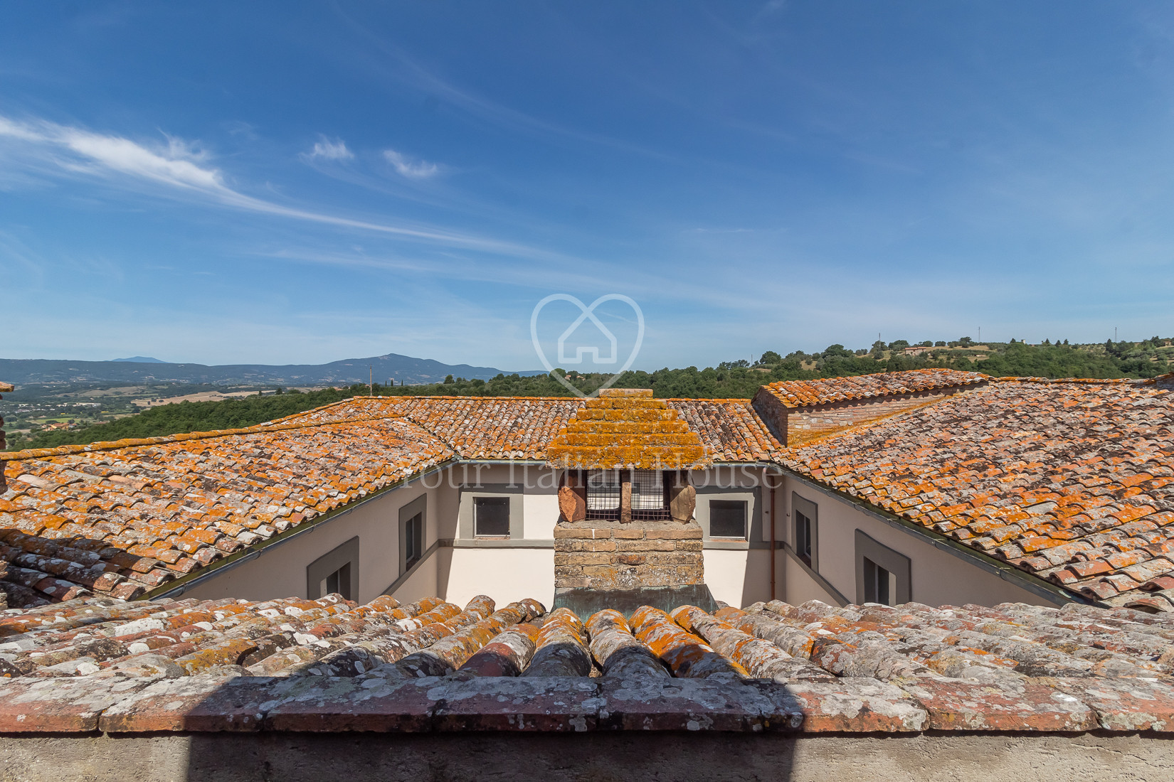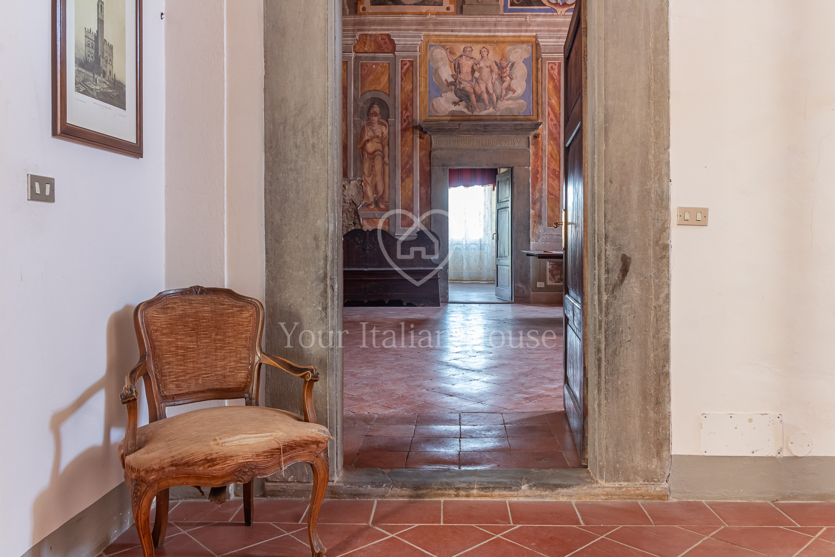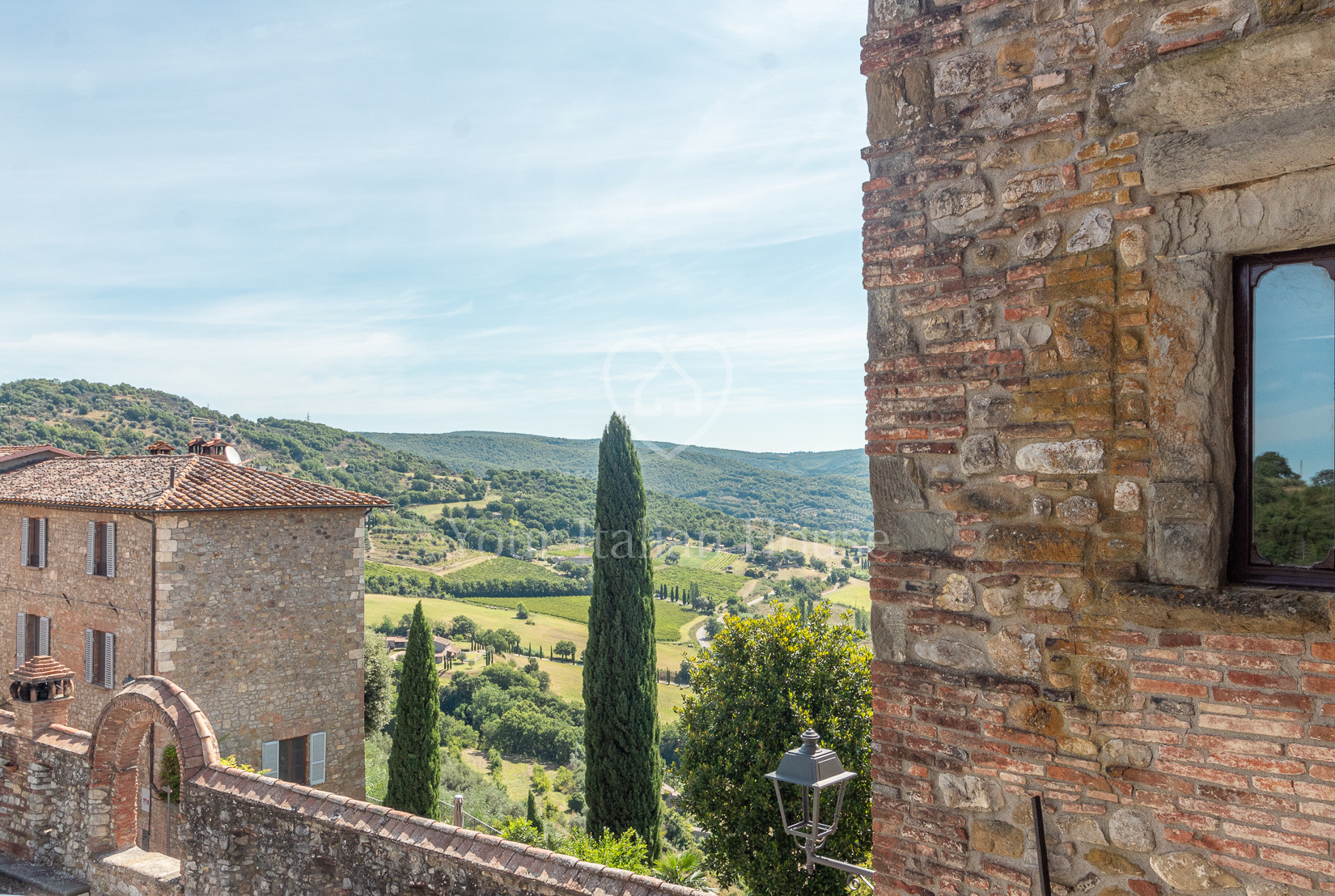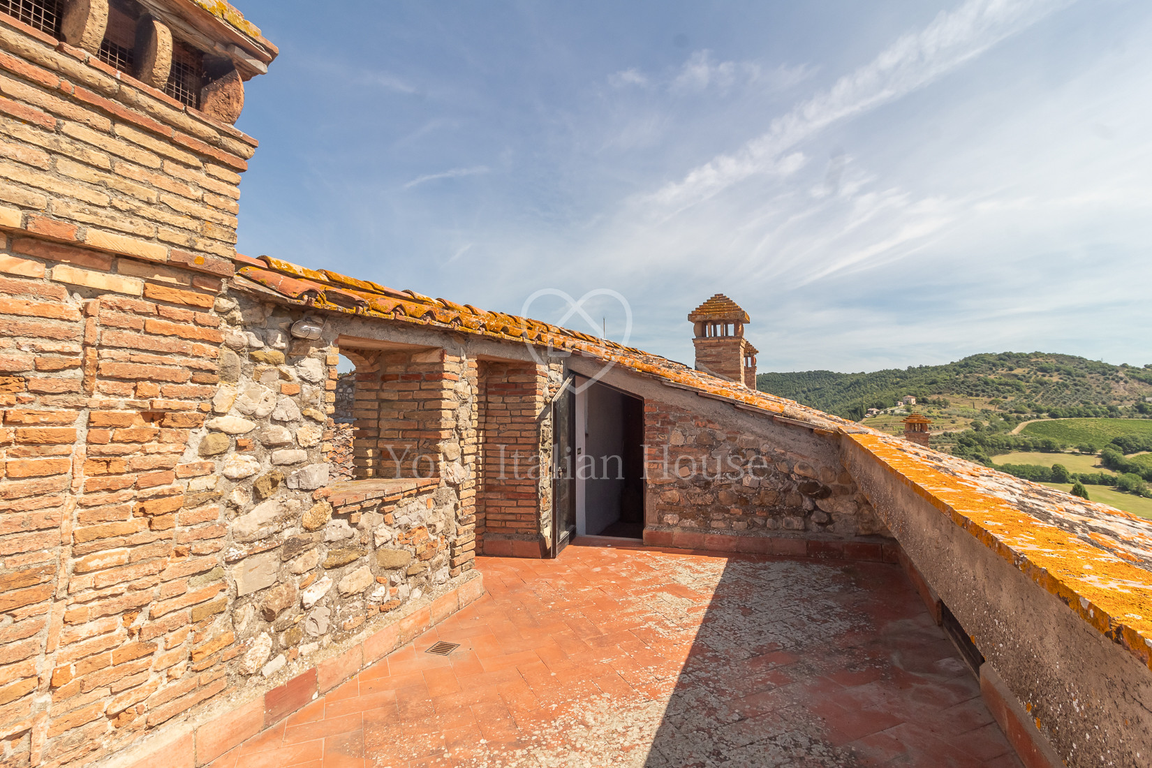 The work, initially Roman, was modified in the Middle Ages and gradually took the form of a noble residence; the Filippeschi family, owners of the castle, lived there until 1602. The castle retains its layout from the Renaissance period: it is built around a courtyard with a well, with square columns with arches that support the galleries on the upper floor, with the imposing stone staircase on one side. Around the end of the 16th century, the history of the castle is intertwined with the history of the Counts of Marsciano, to whom we owe the facade overlooking the square and the related rooms, the monumental entrance embellished by the balcony supported by sculpted corbels, of which the central one bears the Marsciano coat of arms and the redecoration of the Sala Caminata, with the monumental fireplace in pietra serena bearing the name of the then owner, Horatius Martianus, engraved on it. After Orazio, the castle passed to the eldest son and remained in the hands of the Marsciano family until 1866. Castello sulla Valle is a true treasure chest, waiting to be discovered. The main entrance is on the ground floor, directly from the town square; from here you access the driveway courtyard with internal porch. On one side we find a first wing of the castle, with rooms that follow one another: a living room, a study, a kitchen, two bedrooms, a bathroom, a laundry area, two closets, a warehouse and a garage; on the other side of the courtyard we find another wing with two living rooms, a lounge, a living room entrance, a dining room, a kitchen, a bedroom, a bathroom and a toilet. The first floor is accessed via the large stone staircase. The floor is made up of eight bedrooms, four bathrooms, two toilets, two studies, a living room, a wardrobe room and the Sala Caminata entirely decorated on the walls with mythological themed pictorial cycles. Of notable value is the family tree of the Marsciano family which is located right in front of the large stone fireplace; on the upper band there are the coats of arms of the Counts of Marsciano alternating with scenes of biblical subjects. The hall retains decorated coffered ceilings and has the Paris de Philippensibus engraving on the door jambs. The frescoed ceilings of the rooms on the floor are splendid. Also on the first floor we find the chapel dedicated to the Blessed Vanna, belonging to the Filippeschi family, who was born in the Castle in 1264. The first floor is completed by a terrace of approximately 5 sqm which is located above the monumental door. The second floor is used entirely as an attic which extends over the entire surface of the floor, which is connected to the first floor by the main internal staircase and a characteristic stone spiral staircase. On the third mezzanine floor we have two storage rooms and a panoramic terrace of approximately 15 sqm created inside a pitch of the roof. In the basement there are rooms used as storage and warehouse, technical rooms, a tank for collecting rainwater and other rooms. Castello sulla Valle is a fascinating architectural and artistic jewel, ready to be exploited to its full potential.