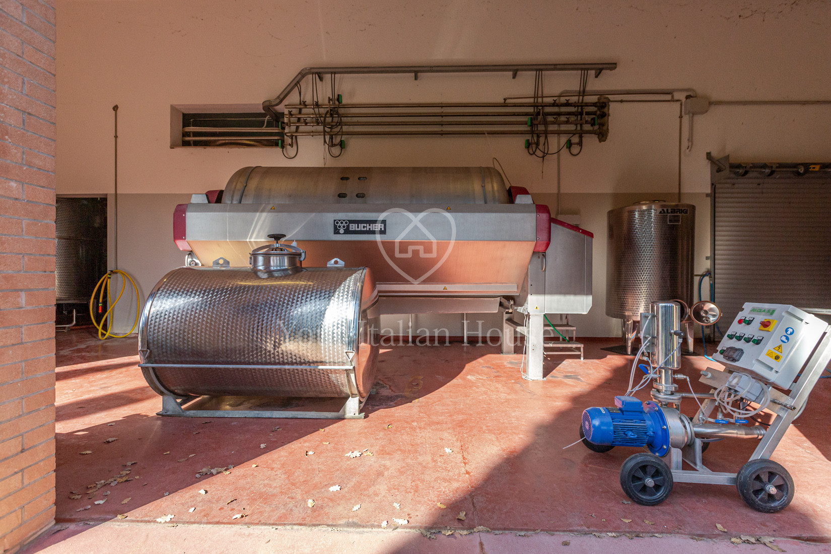 The farmhouse features plastered facades, with terracotta flooring indoors. The roof is not insulated. The cellar has exposed brick walls and tiled flooring. The same tiling is found in the kitchen and tasting area, with a loft that has wooden beams.