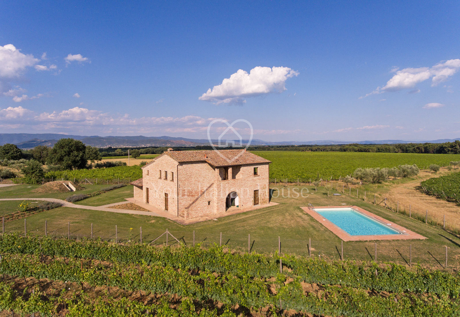 This farmhouse is located at the border between Umbria and Tuscany, close to the splendid town of Cortona. It was completely restored in 2008 and boasts panoramic view of the Trasimeno lake and the surrounding countryside. The property is in a private position, but not isolated and still close to all the amenities. The estate covers an area of 250sqm on two levels and is composed as follows: at ground floor we have entrance, living room with fireplace, large kitchen with dining area connected to the garden through a French window, bedroom, study, bathroom and utility room; on the first floor, reachable through both internal and external staircases, we find an external loggia, large hallway, 4 bedrooms and 4 bathrooms. The building was restored with very high-quality materials, the rooms are wide, bright and provided with air conditioning. Possibility to build an outdoor pergola. The property includes 2.500sqm of fenced park with automatic irrigation system and swimming pool of 5x10m.