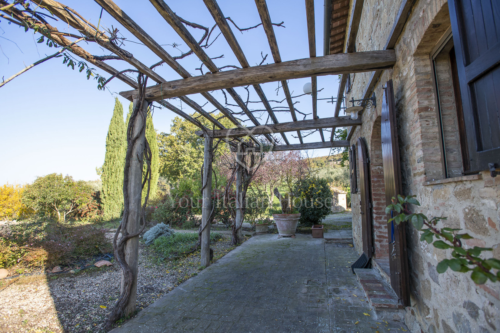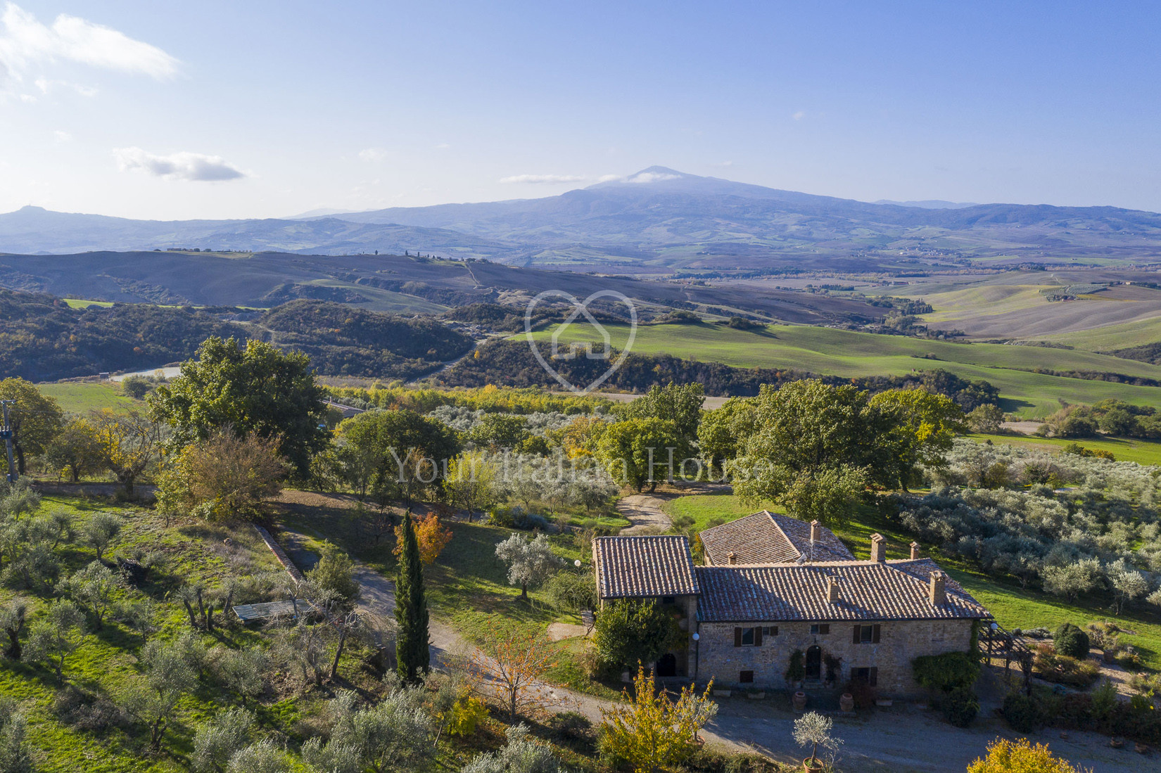 The main house of 340 sqm is connected to the guest house by a beautiful central courtyard paved in terracotta with a view of the panorama. Next to the two residential buildings, we find another accessory building used as a garage and tool shed. The main house is on three floors: on the ground floor we find a large living room with a Tuscan kitchen overlooking the large courtyard which invites convivial events and moments in company; continuing inside we find a service bathroom, as well as a large pantry and an ancient large cellar whose origins are presumed to date back to 1300. Going up to the first floor we find a large room with an incredibly bright fireplace with large windows that frame the views of the Valdorcia . From here there is access to a first bedroom with bathroom and a corridor that leads us to two further bedrooms, two bathrooms and a home-video/study room, from which a staircase leads us to the last bedroom which has a small loggia on the outside and is therefore equipped with independent access also from the garden. In total in the main house there are currently 4 bedrooms and 4 bathrooms. Outside, the typical courtyard connects the main house to the guest house, along the side of the courtyard that connects the two buildings, we find an old wood-burning oven and three small storage rooms. The totally independent guest house enjoys a fantastic view of the surrounding landscape and the green spaces offered by the garden. The annex consists of a living room with fireplace, a functional and habitable kitchen, 3 bedrooms and two bathrooms, for a gross surface area of 130 sqm. In the third and last building there are 3 garages and warehouse rooms for a further 80 sqm. A true country villa for your dream home in the heart of the most sought-after Tuscany, a unique and exclusive object. This exceptional country villa is located in one of the most sought-after areas of this region, within a context of country houses and exclusive rural homes: the property is accessed from the main road through an automatic gate reserved for the owners of this area and short avenue of white road. The property is surrounded by approximately 1 hectare of land where the three buildings are located, a lush garden of hedges and herbs, 240 olive trees and centuries-old oaks. The house has all utilities. A perfect house both as a residential home and as a retreat from the chaos of the city for summer holidays and free time to spend with the family, it is also an excellent investment for an income from more exclusive tourist rentals.