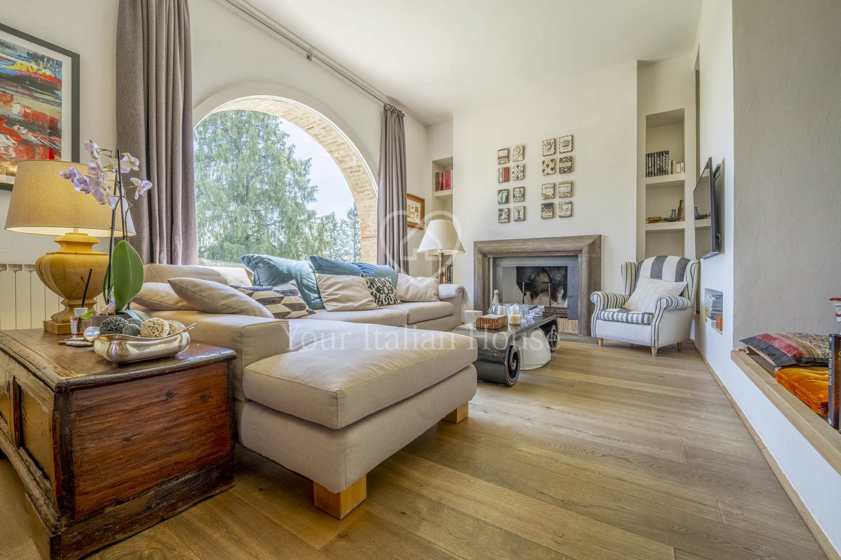 The main farmhouse of the property in question develops a gross living area of approximately 315 sqm spread over two floors and internally arranged as follows: on the ground floor, in addition to the main entrance, we find the open space living area consisting of a living room, a dining room, a living room with fireplace and a professional kitchen with pantry. An internal travertine staircase leads to the first floor where there is the sleeping area consisting of two bedrooms with private bathroom, a master bedroom with large bathroom and walk-in closet, a study as well as a hallway with exit to the loggia and external staircase. A few steps from the main farmhouse there is a lovely outbuilding of about 50 sqm restored with the same high quality finish as the farmhouse, comprising two bedrooms with bathroom and private pergola. The interiors of this property will impress you from the first visit; the furnishings fully express the taste and style of the owner who, being an interior designer, has been able to make the most of every corner of her home. Her interior design skills and intuition were also crucial in the renovation, which was carried out under the careful supervision of a competent technician. As for the real estate units, the property is completed by an annex of around 30 sqm used as a shed for garden equipment and storage. The land belonging to the park and garden is approximately 9,000 square meters and this gives the property an important added value that makes it pristine and extremely eco-sustainable, also thanks to the presence of fruit trees, plants, flowers and a vegetable garden. This property releases the grandeur of Mother Nature and a great sense of freedom, as well as giving extreme privacy and a feeling of peace, despite its position being favorable for travel. The complex is well delimited by an excellent green mesh fence and two automatic gates. Another added value of the house is the pergola with a large table and an external kitchen, connected to the internal kitchen, which allows you to organize dinners, lunches or aperitifs and to be able to enjoy the important external area to the fullest, as well as sharing with your loved one’s the preparation phases of your events or your parties, sipping a good glass of wine.