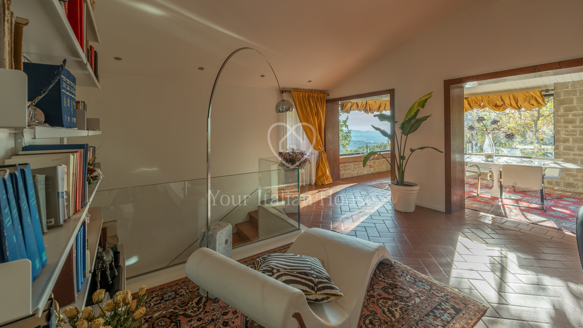 An elegant internal staircase leads to the second floor, featuring an open-plan area with a fireplace and a second dining area surrounded by large windows offering breathtaking panoramic views.