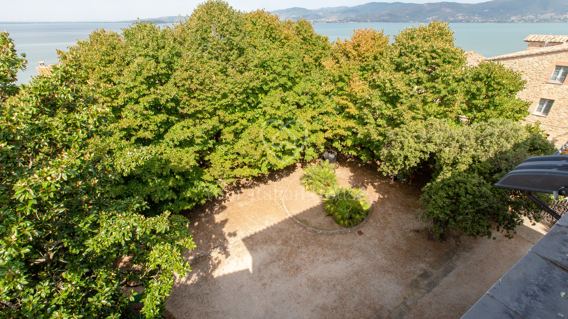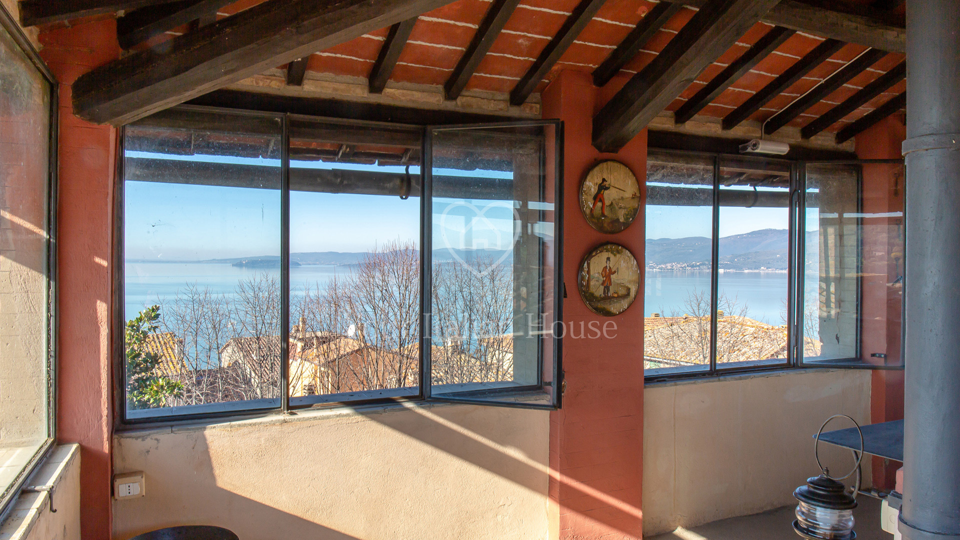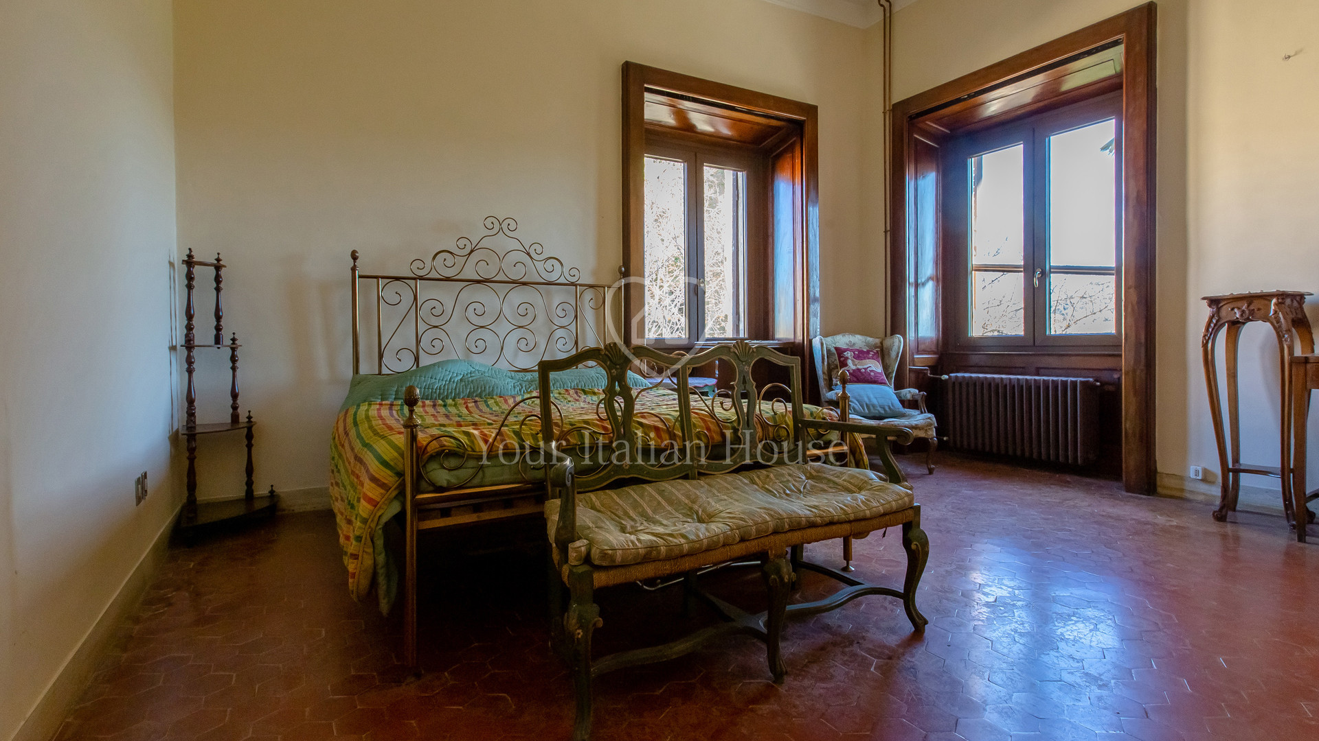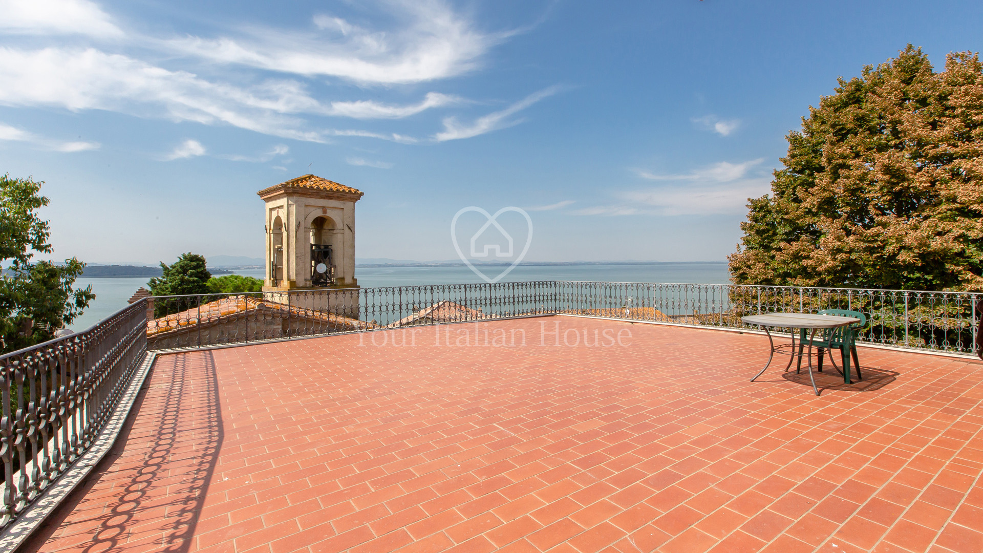 This historic villa is located in the most beautiful point of Lake Trasimeno from which you can enjoy a breathtaking view. The villa was built around the middle of the 19th century and presents various testimonies of the time. It was the home of Guido Pompilj and his wife, the poetess Vittoria Aganoor Pompilj, one of the most important figures of Italian poetry between the 19th and 20th centuries. The villa is on three floors, two of which are habitable and one with cellars. There is also a panoramic tower with a terrace that offers a 360° panorama of the lake and the green hills around. The property is located in the small town of Monte del Lago located on a promontory on the lake shore. The villa is surrounded on three sides by a high wall which allows for a lot of privacy and on one side there is an olive grove where it would be possible to build a swimming pool with lake view. The villa is on three floors including a basement where there are various cellars and a kitchen/rustic to host family reunions or when there are many friends, as well as an ancient bread oven. The first floor connected to the outside both by an external staircase from the front garden and by an internal staircase, houses an apartment with three large frescoed rooms, kitchen, pantry, 5 bedrooms, 3 bathrooms and various hallways. The second floor can be reached via an internal staircase where the second apartment is located, consisting of three rooms, two of which are connected to a large terrace called “La Terrazza della Poetessa” with an amazing view of the lake and a kitchen, three bedrooms, study, three bathrooms as well as a large entrance and various closets and hallways. Going up the stairs to a further floor you find yourself in a room with large windows on all sides and connected to a small terrace from which you can enjoy a unique 360° view of the lake and the green hills that surround it. A place to relax and seek inspiration. Both in front of the villa and in the back there are two Italian gardens with tall trees and elliptical flowerbeds. Also present in the garden is an ancient medieval tower, part of the ancient walls surrounding the property. The villa is, with its position and history, a unique and rare place. It could be used both as a private residence but also for a hospitality business. The villa requires a total renovation regarding systems, bathrooms, kitchens even if the structural condition is good.