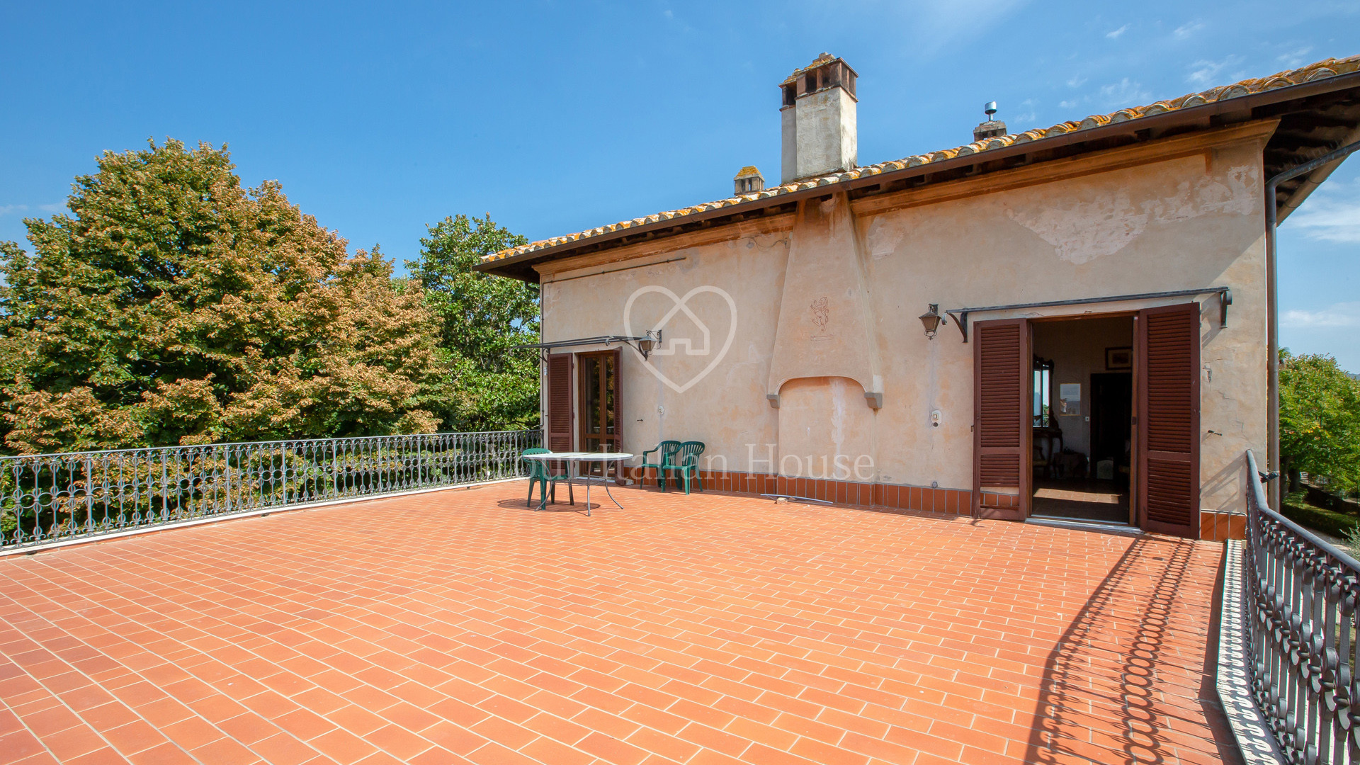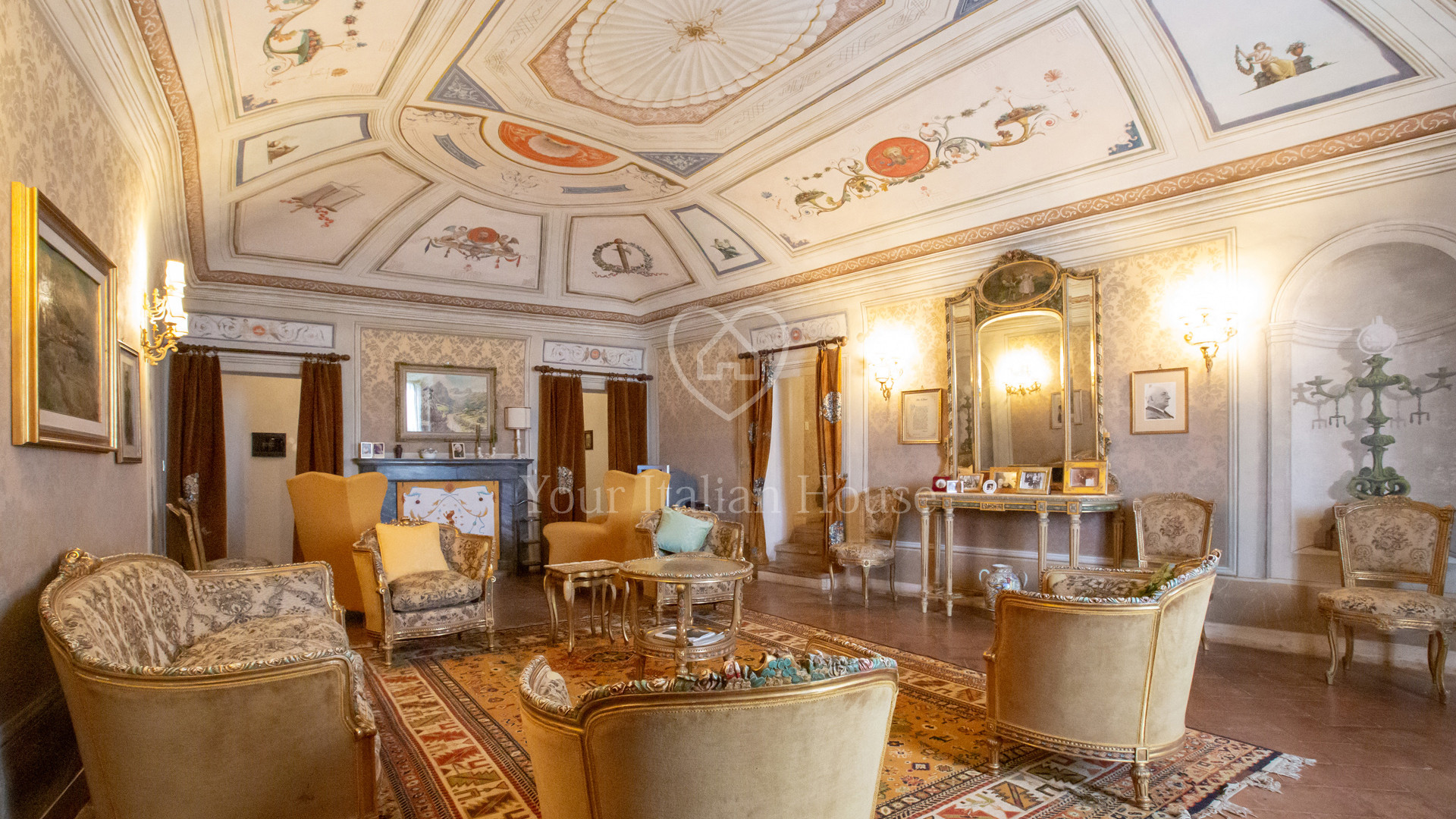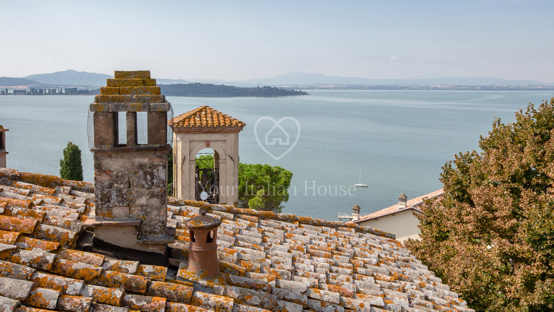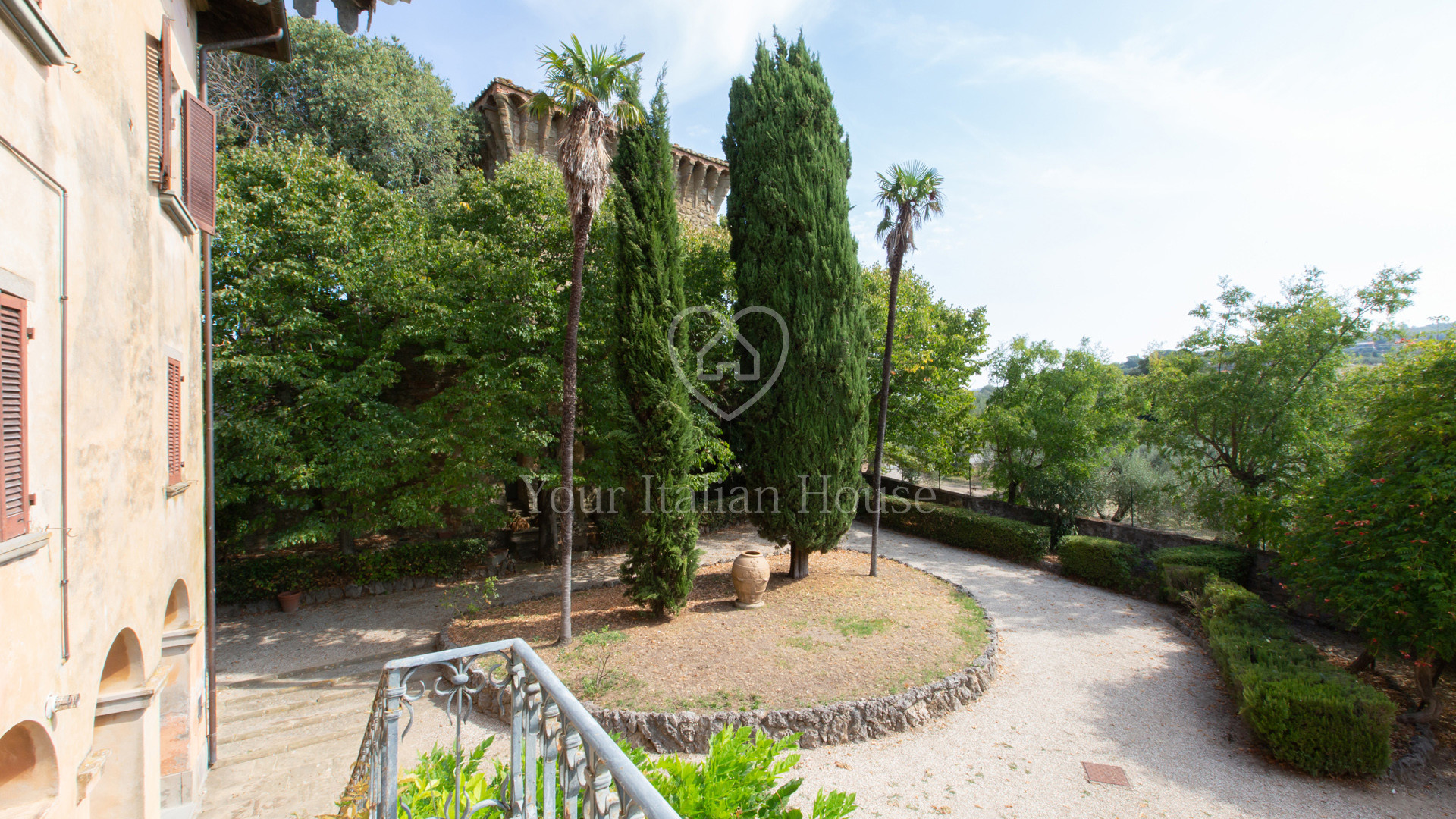 This historic villa is located in the most beautiful point of Lake Trasimeno from which you can enjoy a breathtaking view. The villa was built around the middle of the 19th century and presents various testimonies of the time. It was the home of Guido Pompilj and his wife, the poetess Vittoria Aganoor Pompilj, one of the most important figures of Italian poetry between the 19th and 20th centuries. The villa is on three floors, two of which are habitable and one with cellars. There is also a panoramic tower with a terrace that offers a 360° panorama of the lake and the green hills around. The property is located in the small town of Monte del Lago located on a promontory on the lake shore. The villa is surrounded on three sides by a high wall which allows for a lot of privacy and on one side there is an olive grove where it would be possible to build a swimming pool with lake view. The villa is on three floors including a basement where there are various cellars and a kitchen/rustic to host family reunions or when there are many friends, as well as an ancient bread oven. The first floor connected to the outside both by an external staircase from the front garden and by an internal staircase, houses an apartment with three large frescoed rooms, kitchen, pantry, 5 bedrooms, 3 bathrooms and various hallways. The second floor can be reached via an internal staircase where the second apartment is located, consisting of three rooms, two of which are connected to a large terrace called “La Terrazza della Poetessa” with an amazing view of the lake and a kitchen, three bedrooms, study, three bathrooms as well as a large entrance and various closets and hallways. Going up the stairs to a further floor you find yourself in a room with large windows on all sides and connected to a small terrace from which you can enjoy a unique 360° view of the lake and the green hills that surround it. A place to relax and seek inspiration. Both in front of the villa and in the back there are two Italian gardens with tall trees and elliptical flowerbeds. Also present in the garden is an ancient medieval tower, part of the ancient walls surrounding the property. The villa is, with its position and history, a unique and rare place. It could be used both as a private residence but also for a hospitality business. The villa requires a total renovation regarding systems, bathrooms, kitchens even if the structural condition is good.