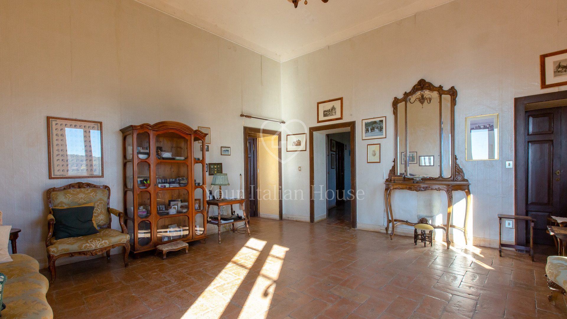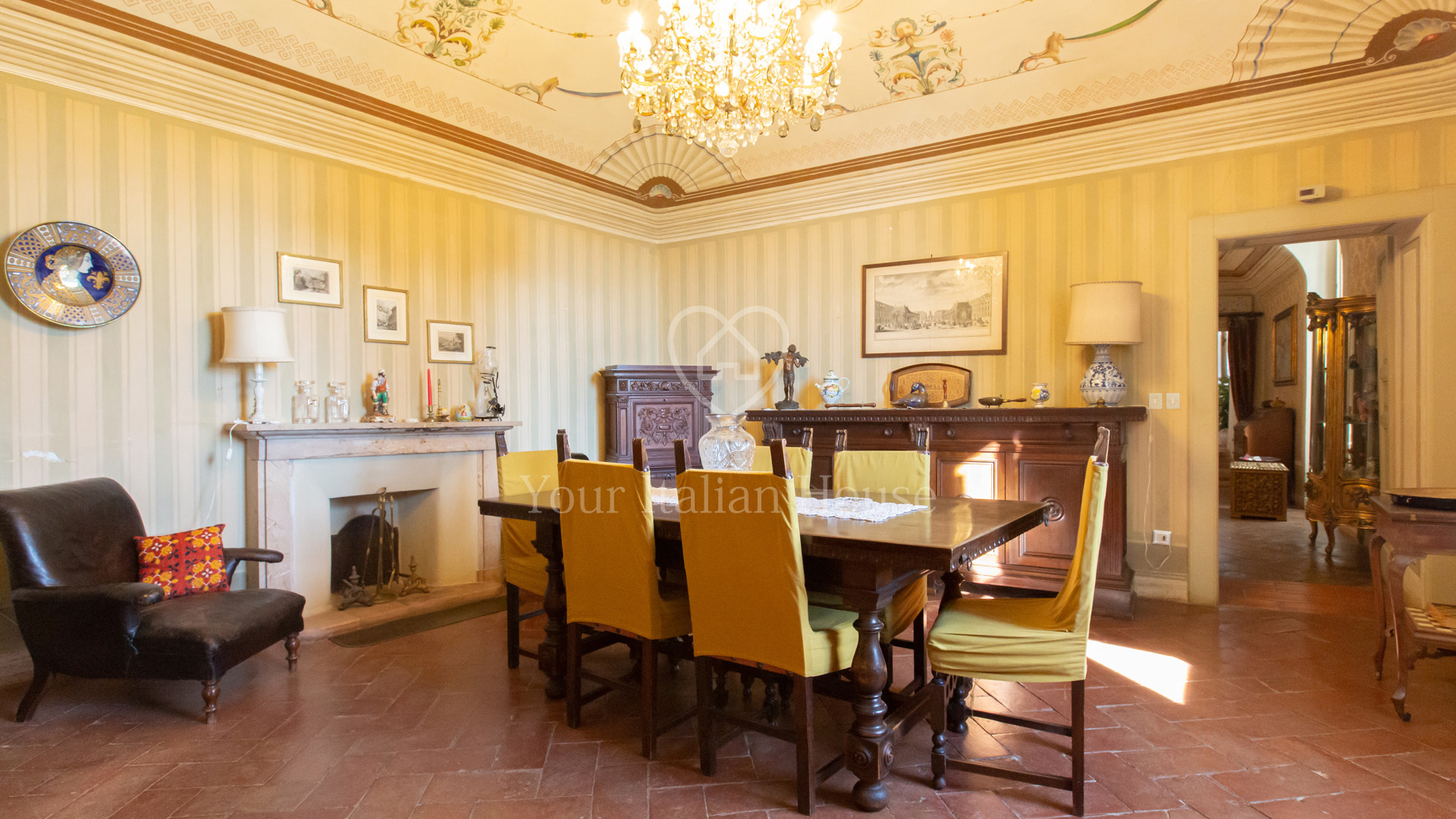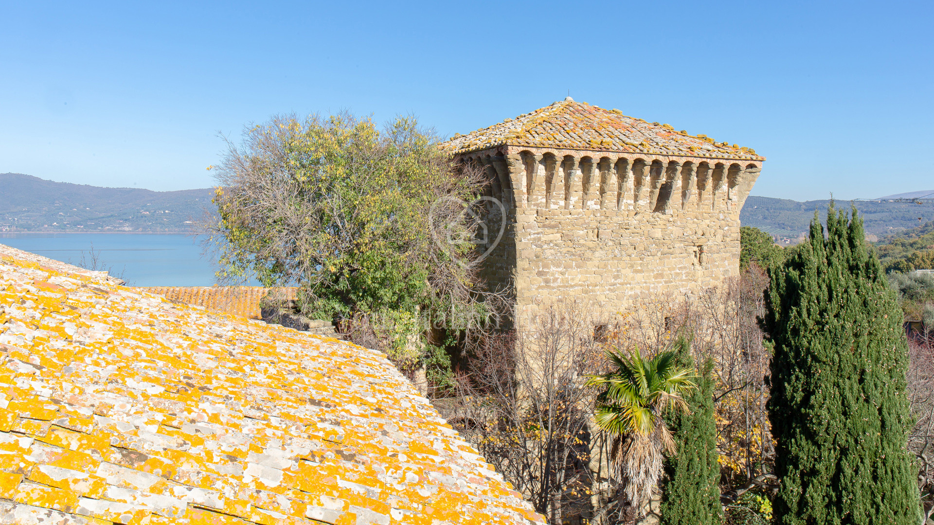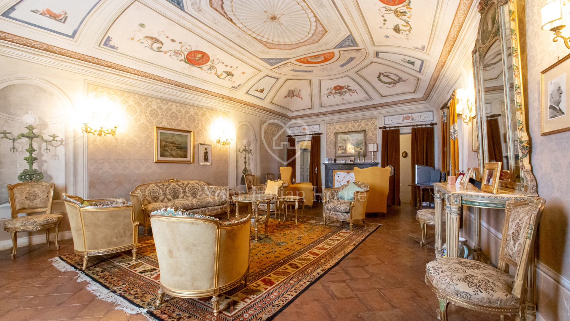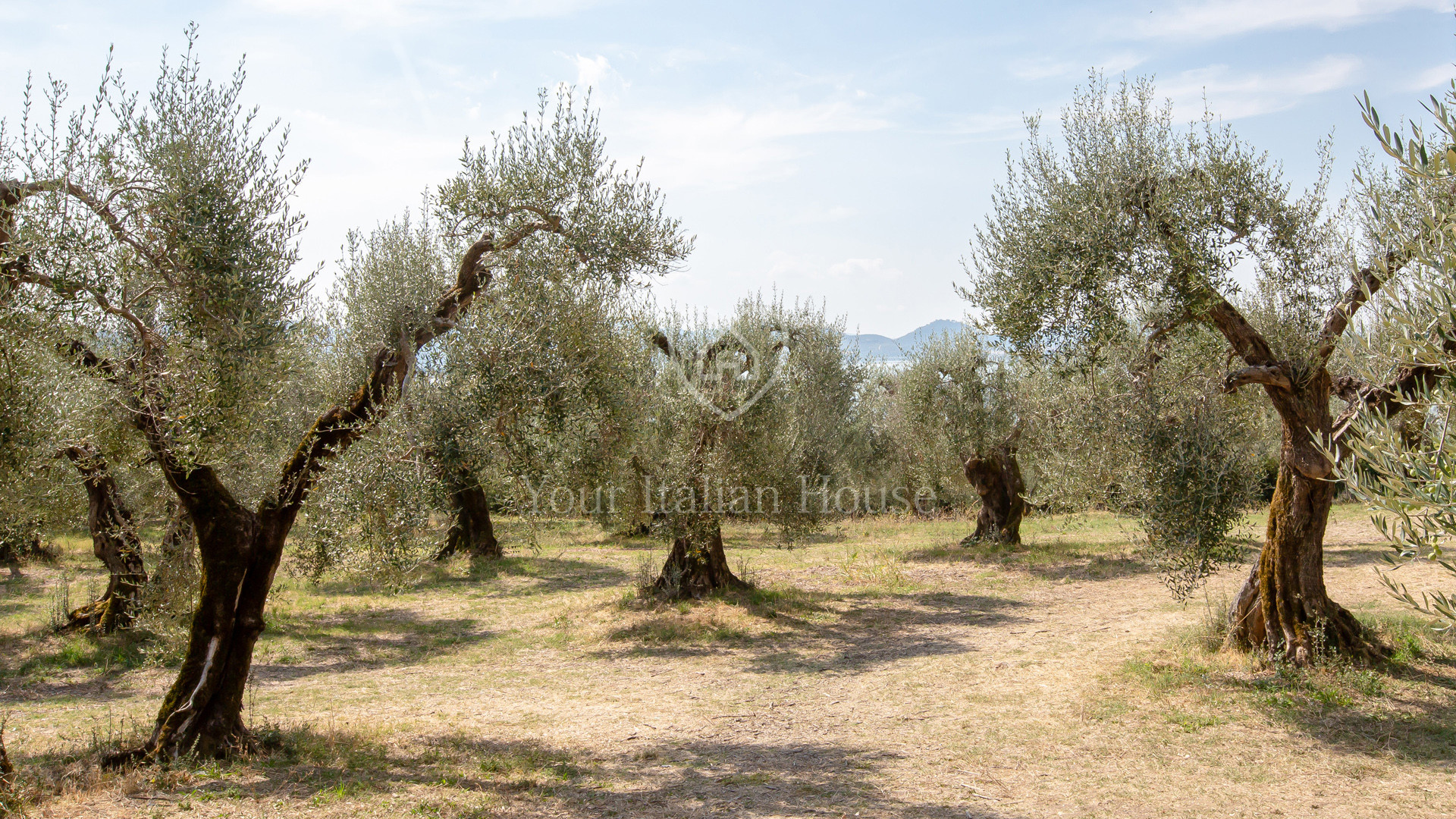 This historic villa is located in the most beautiful point of Lake Trasimeno from which you can enjoy a breathtaking view. The villa was built around the middle of the 19th century and presents various testimonies of the time. It was the home of Guido Pompilj and his wife, the poetess Vittoria Aganoor Pompilj, one of the most important figures of Italian poetry between the 19th and 20th centuries. The villa is on three floors, two of which are habitable and one with cellars. There is also a panoramic tower with a terrace that offers a 360° panorama of the lake and the green hills around. The property is located in the small town of Monte del Lago located on a promontory on the lake shore. The villa is surrounded on three sides by a high wall which allows for a lot of privacy and on one side there is an olive grove where it would be possible to build a swimming pool with lake view. The villa is on three floors including a basement where there are various cellars and a kitchen/rustic to host family reunions or when there are many friends, as well as an ancient bread oven. The first floor connected to the outside both by an external staircase from the front garden and by an internal staircase, houses an apartment with three large frescoed rooms, kitchen, pantry, 5 bedrooms, 3 bathrooms and various hallways. The second floor can be reached via an internal staircase where the second apartment is located, consisting of three rooms, two of which are connected to a large terrace called “La Terrazza della Poetessa” with an amazing view of the lake and a kitchen, three bedrooms, study, three bathrooms as well as a large entrance and various closets and hallways. Going up the stairs to a further floor you find yourself in a room with large windows on all sides and connected to a small terrace from which you can enjoy a unique 360° view of the lake and the green hills that surround it. A place to relax and seek inspiration. Both in front of the villa and in the back there are two Italian gardens with tall trees and elliptical flowerbeds. Also present in the garden is an ancient medieval tower, part of the ancient walls surrounding the property. The villa is, with its position and history, a unique and rare place. It could be used both as a private residence but also for a hospitality business. The villa requires a total renovation regarding systems, bathrooms, kitchens even if the structural condition is good.