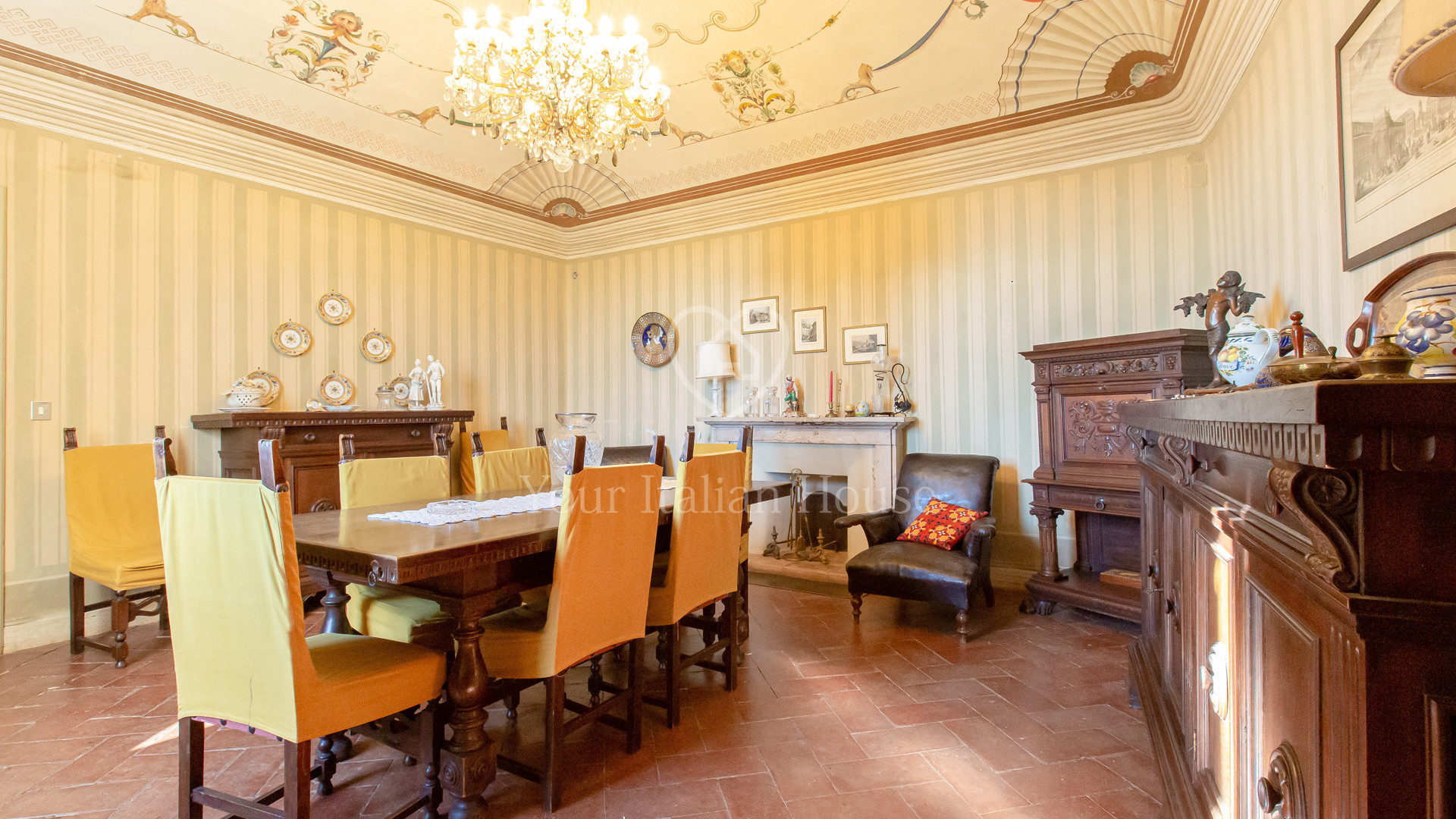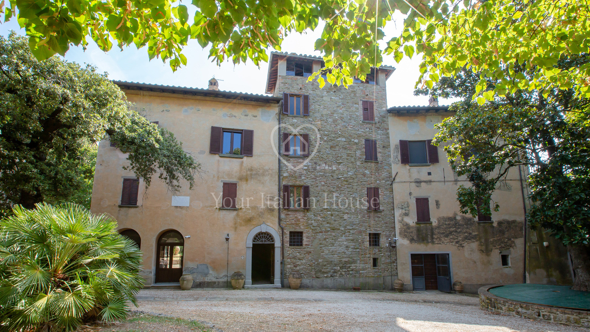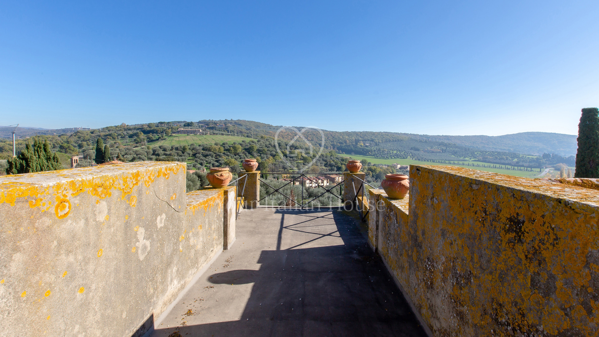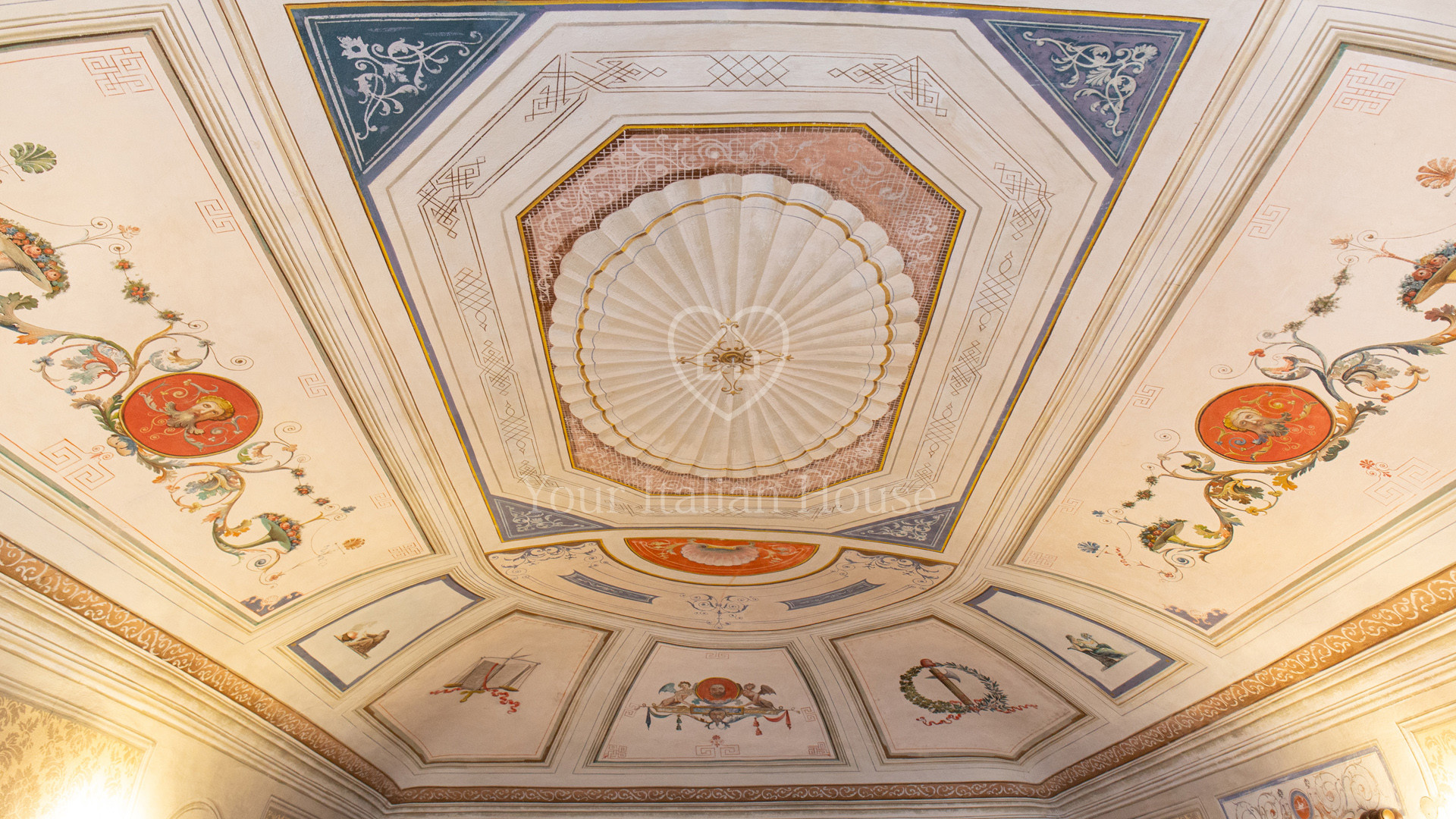 This historic villa is located in the most beautiful point of Lake Trasimeno from which you can enjoy a breathtaking view. The villa was built around the middle of the 19th century and presents various testimonies of the time. It was the home of Guido Pompilj and his wife, the poetess Vittoria Aganoor Pompilj, one of the most important figures of Italian poetry between the 19th and 20th centuries. The villa is on three floors, two of which are habitable and one with cellars. There is also a panoramic tower with a terrace that offers a 360° panorama of the lake and the green hills around. The property is located in the small town of Monte del Lago located on a promontory on the lake shore. The villa is surrounded on three sides by a high wall which allows for a lot of privacy and on one side there is an olive grove where it would be possible to build a swimming pool with lake view. The villa is on three floors including a basement where there are various cellars and a kitchen/rustic to host family reunions or when there are many friends, as well as an ancient bread oven. The first floor connected to the outside both by an external staircase from the front garden and by an internal staircase, houses an apartment with three large frescoed rooms, kitchen, pantry, 5 bedrooms, 3 bathrooms and various hallways. The second floor can be reached via an internal staircase where the second apartment is located, consisting of three rooms, two of which are connected to a large terrace called “La Terrazza della Poetessa” with an amazing view of the lake and a kitchen, three bedrooms, study, three bathrooms as well as a large entrance and various closets and hallways. Going up the stairs to a further floor you find yourself in a room with large windows on all sides and connected to a small terrace from which you can enjoy a unique 360° view of the lake and the green hills that surround it. A place to relax and seek inspiration. Both in front of the villa and in the back there are two Italian gardens with tall trees and elliptical flowerbeds. Also present in the garden is an ancient medieval tower, part of the ancient walls surrounding the property. The villa is, with its position and history, a unique and rare place. It could be used both as a private residence but also for a hospitality business. The villa requires a total renovation regarding systems, bathrooms, kitchens even if the structural condition is good.