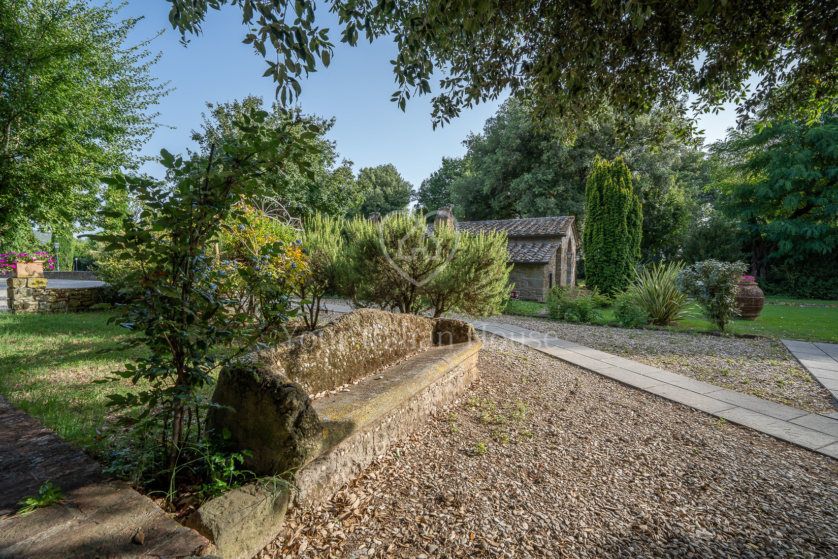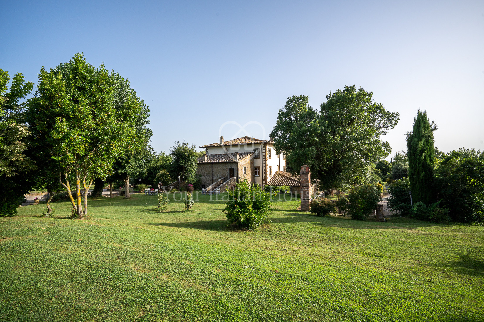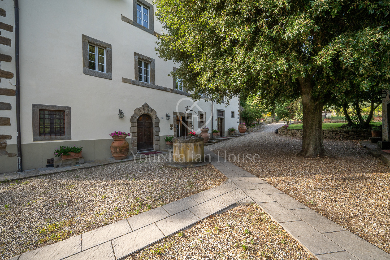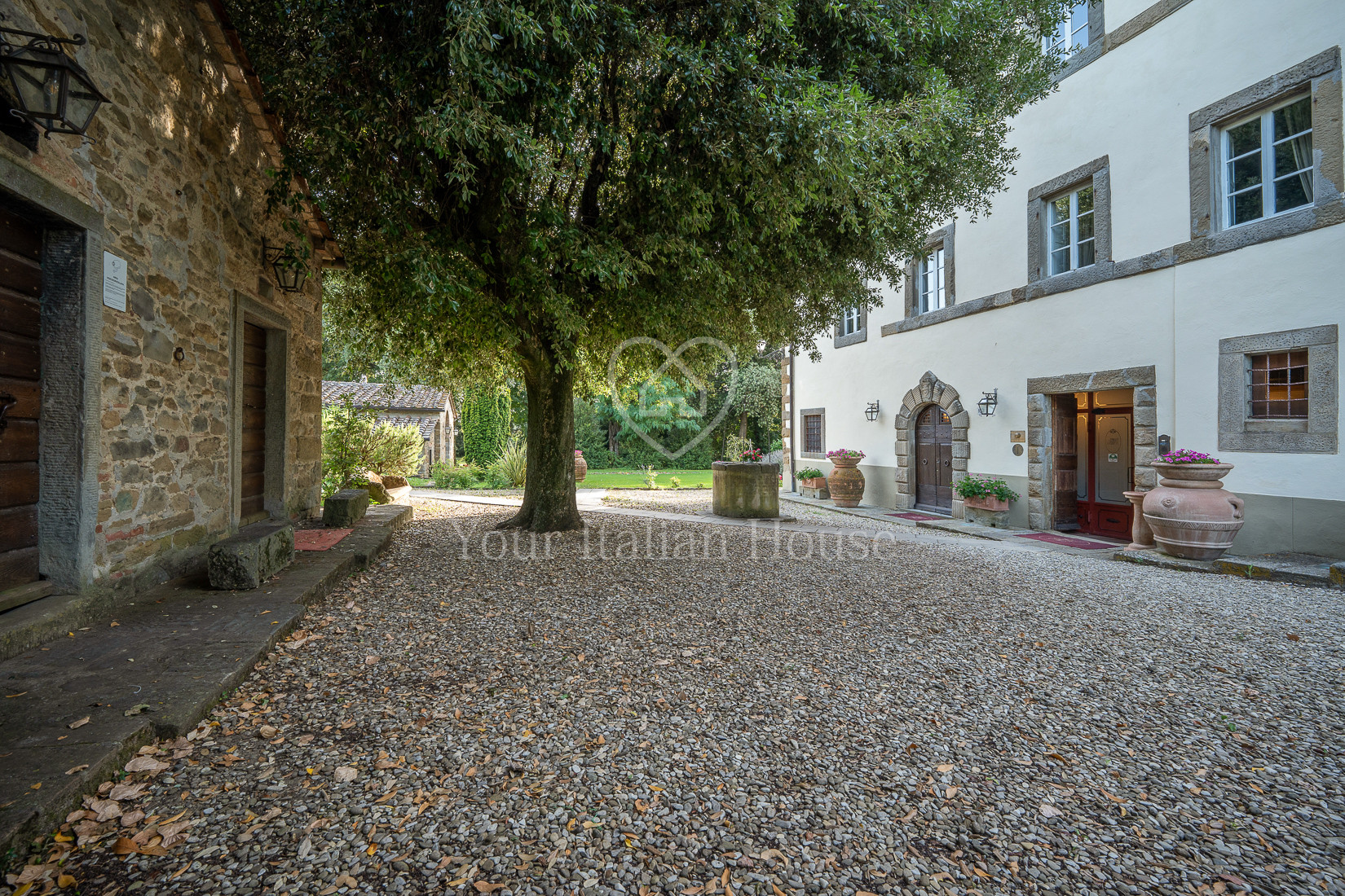 The property includes 5.8 ha of land of which the beautiful park with century-old oak trees, a small vineyard, olive grove and arable land.