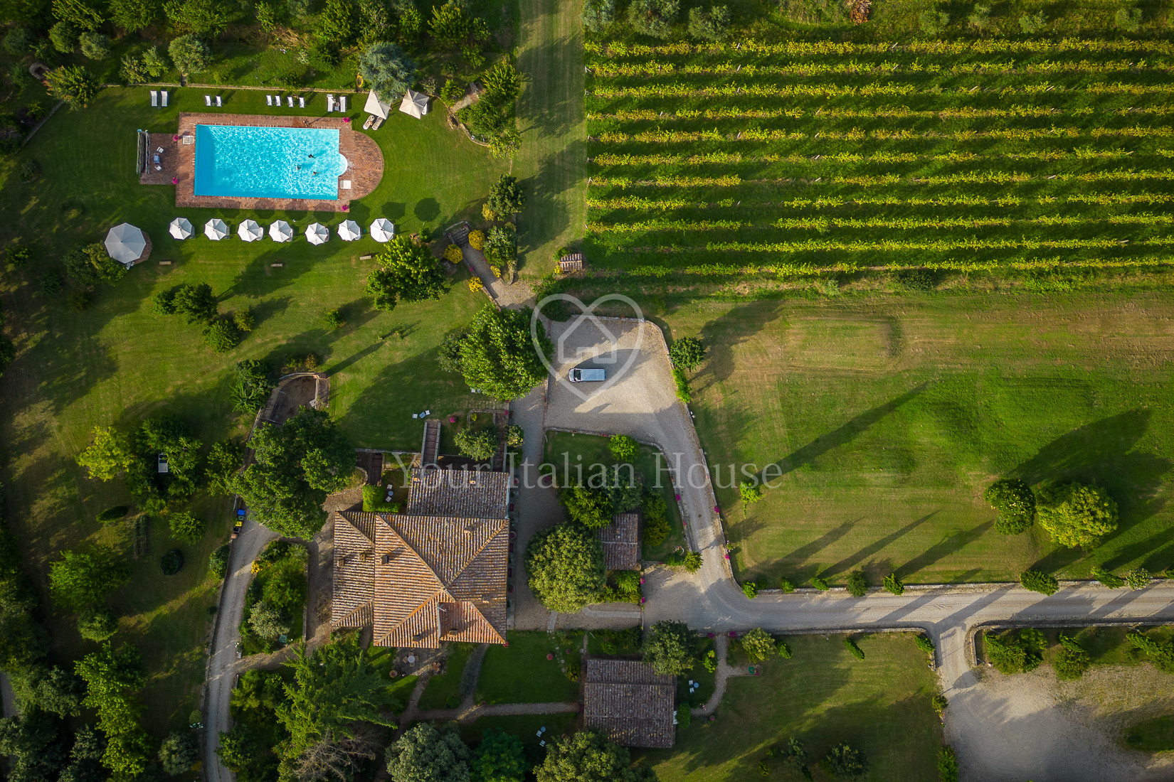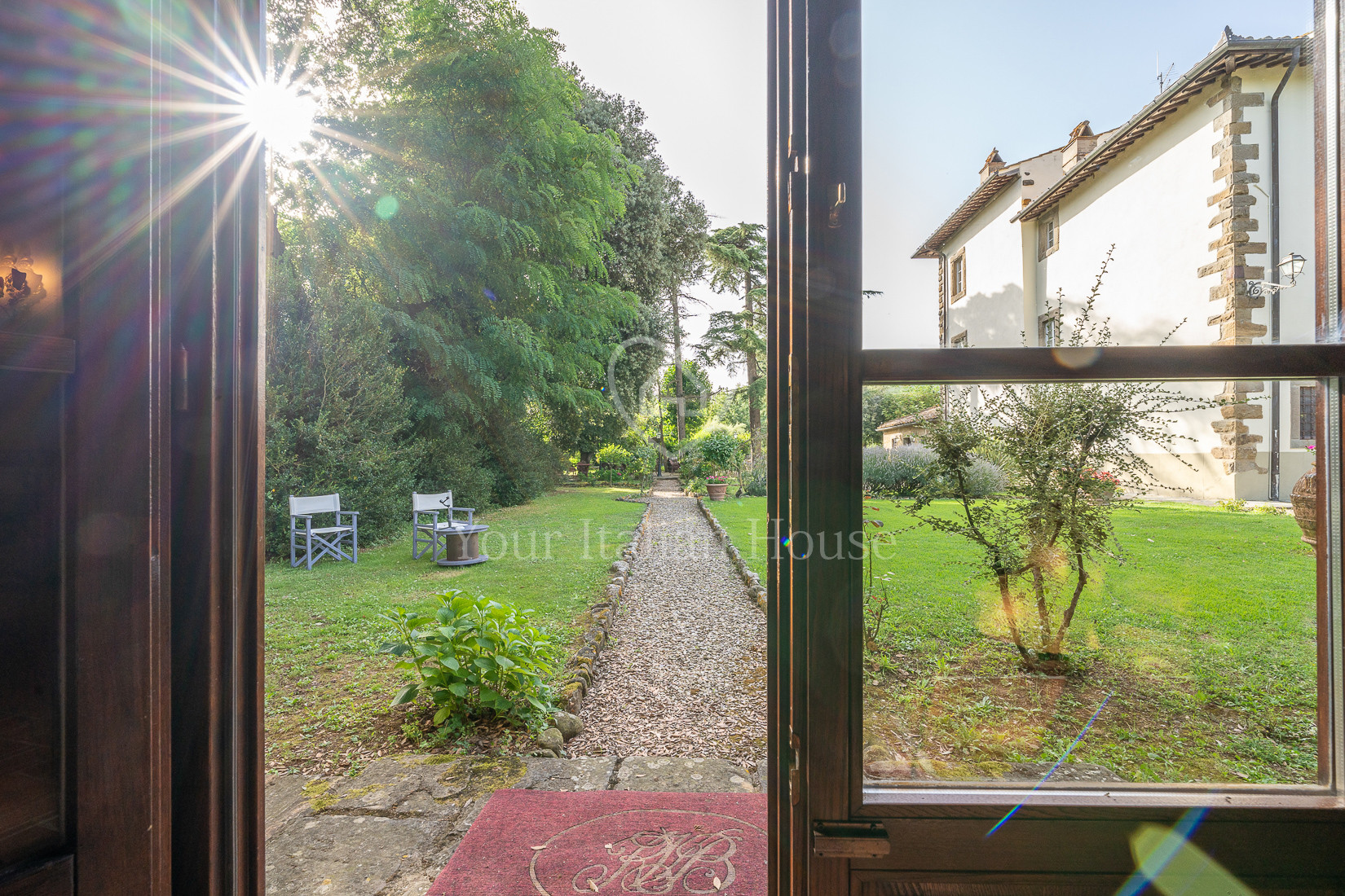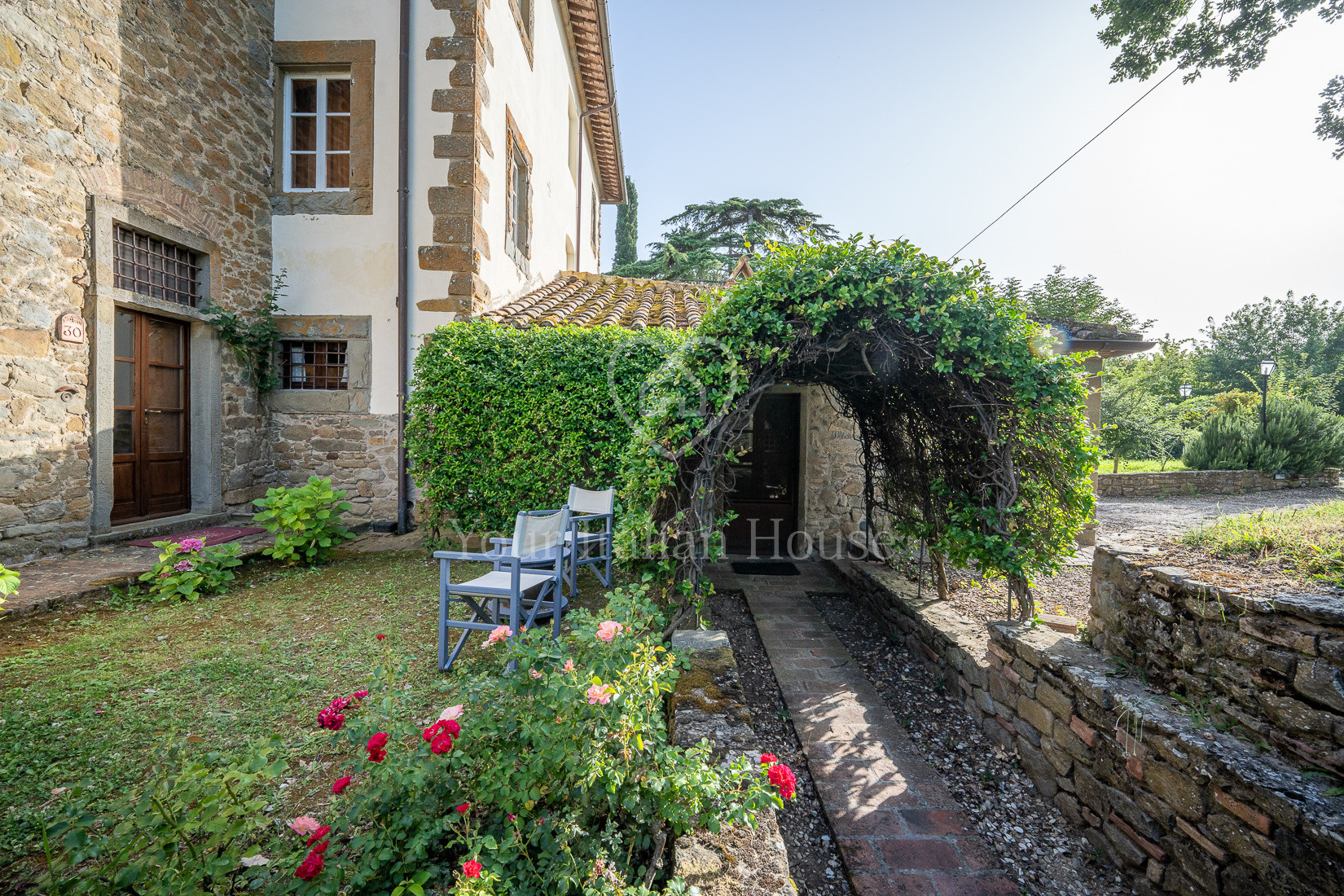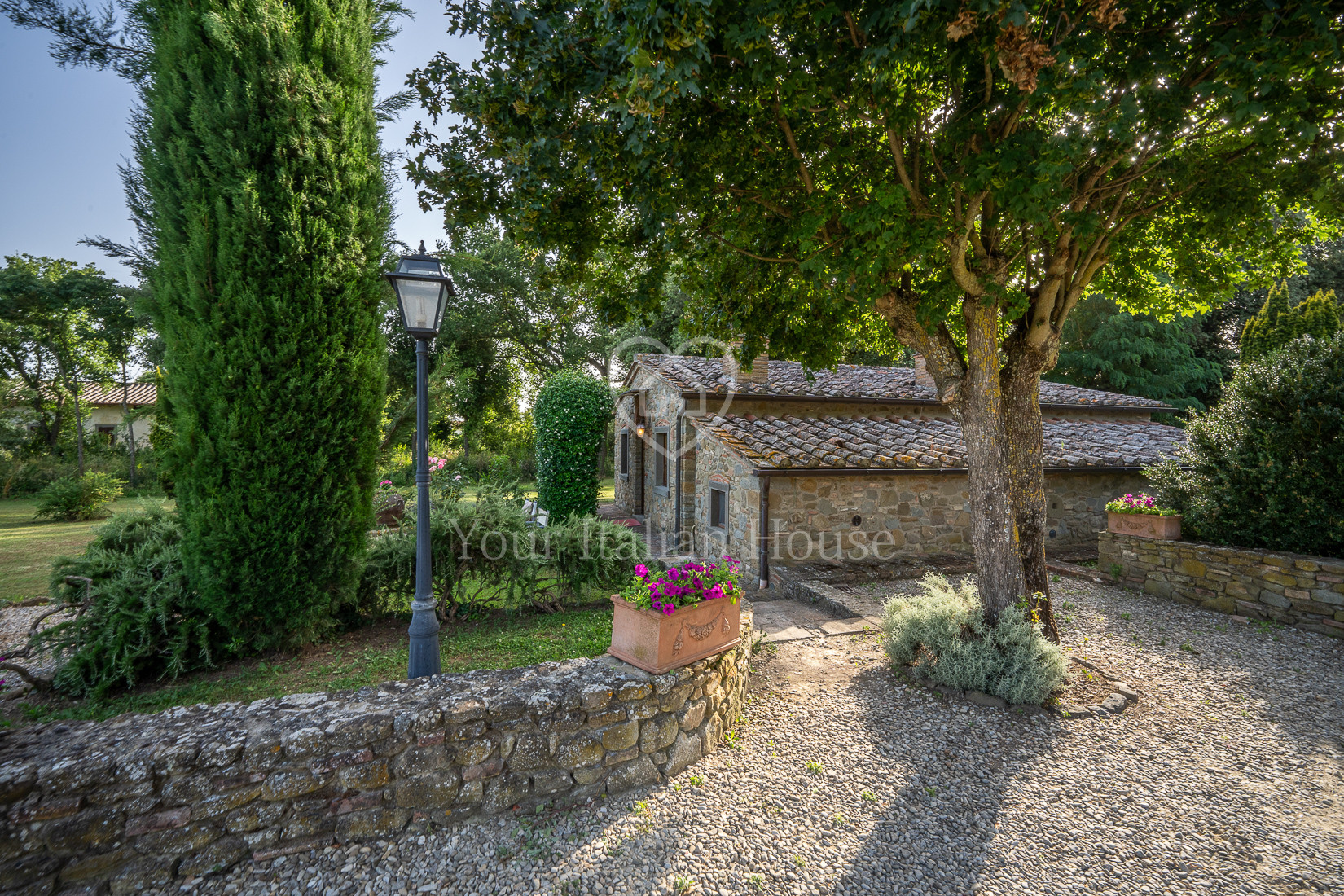 The property includes 5.8 ha of land of which the beautiful park with century-old oak trees, a small vineyard, olive grove and arable land.