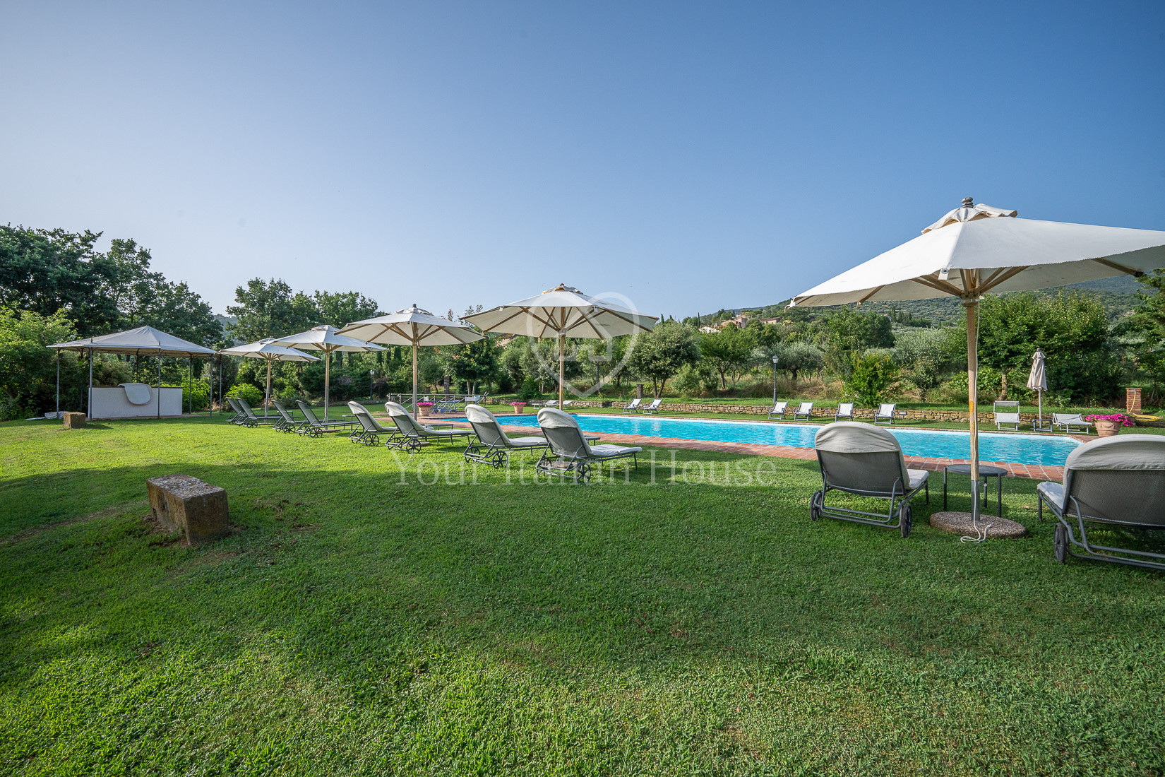 The first and second floors are entirely used as sleeping area comprising a further 10 bedrooms with en-suite bathrooms. Near the villa there is a small outbuilding for office use measuring 35 square metres and a stone building divided into a further 2 bedrooms with bathroom measuring 96 square metres.