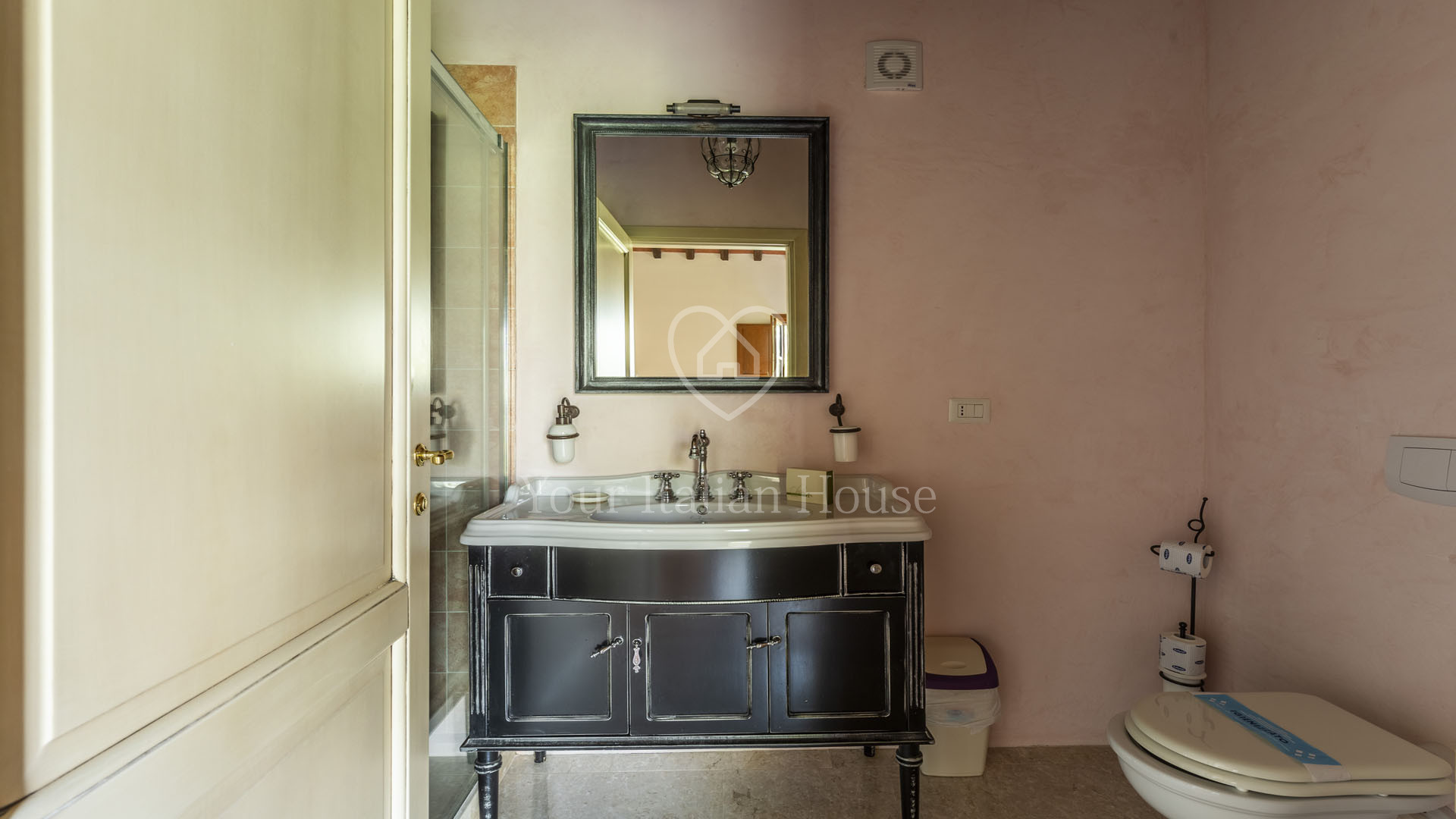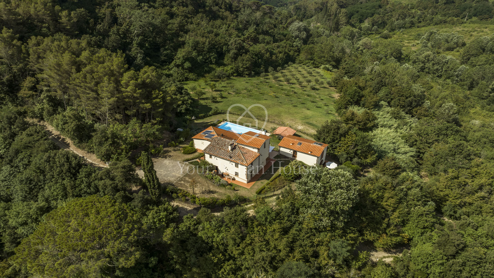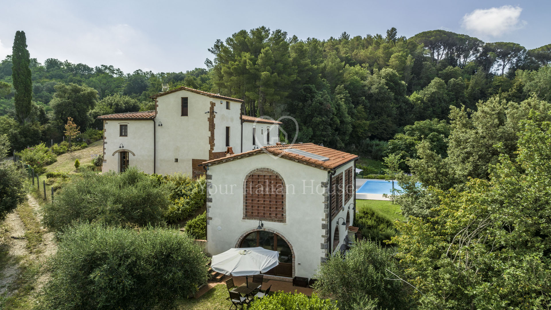 This splendid property, surrounded by greenery and offering a panoramic view of the Pisa hills, is located in the municipality of Palaia and comprises two buildings: the main farmhouse and a guesthouse. The main farmhouse of 302 sqm is spread over 2 levels plus a mezzanine as follows: on the ground floor, there is a large terrace, ideal for summer dining, which leads to the house. Here, you are welcomed by a spacious living area with an entrance, a lounge with French doors leading to the wood-fired oven area, a dining room, another living room, a storage room, and a bathroom. Additionally, there is a laundry room on this floor. The first floor, accessible via internal stairs, hosts the entire sleeping area consisting of four beautiful bedrooms with en-suite bathrooms. One of the bedrooms also has a mezzanine where another room can be created. The second building of 114 sqm, the guesthouse, is arranged over two levels. On the ground floor, there is a large living room with a dining area and an outdoor patio, while the first floor hosts the sleeping area with two bedrooms, each with a private bathroom. The property is surrounded by about 8 hectares of land, several panoramic terraces (50 sqm circa), and an infinity pool measuring 12×6 meters. There is also another small building used as a storage room (23 sqm).
