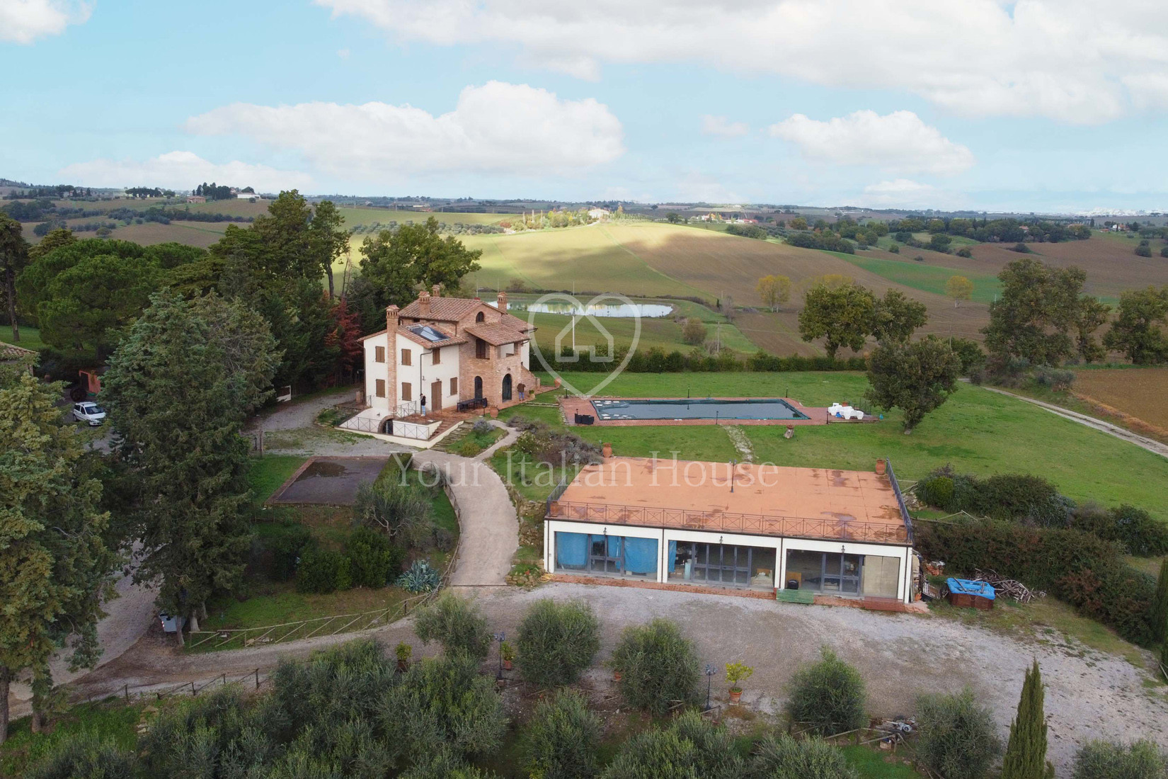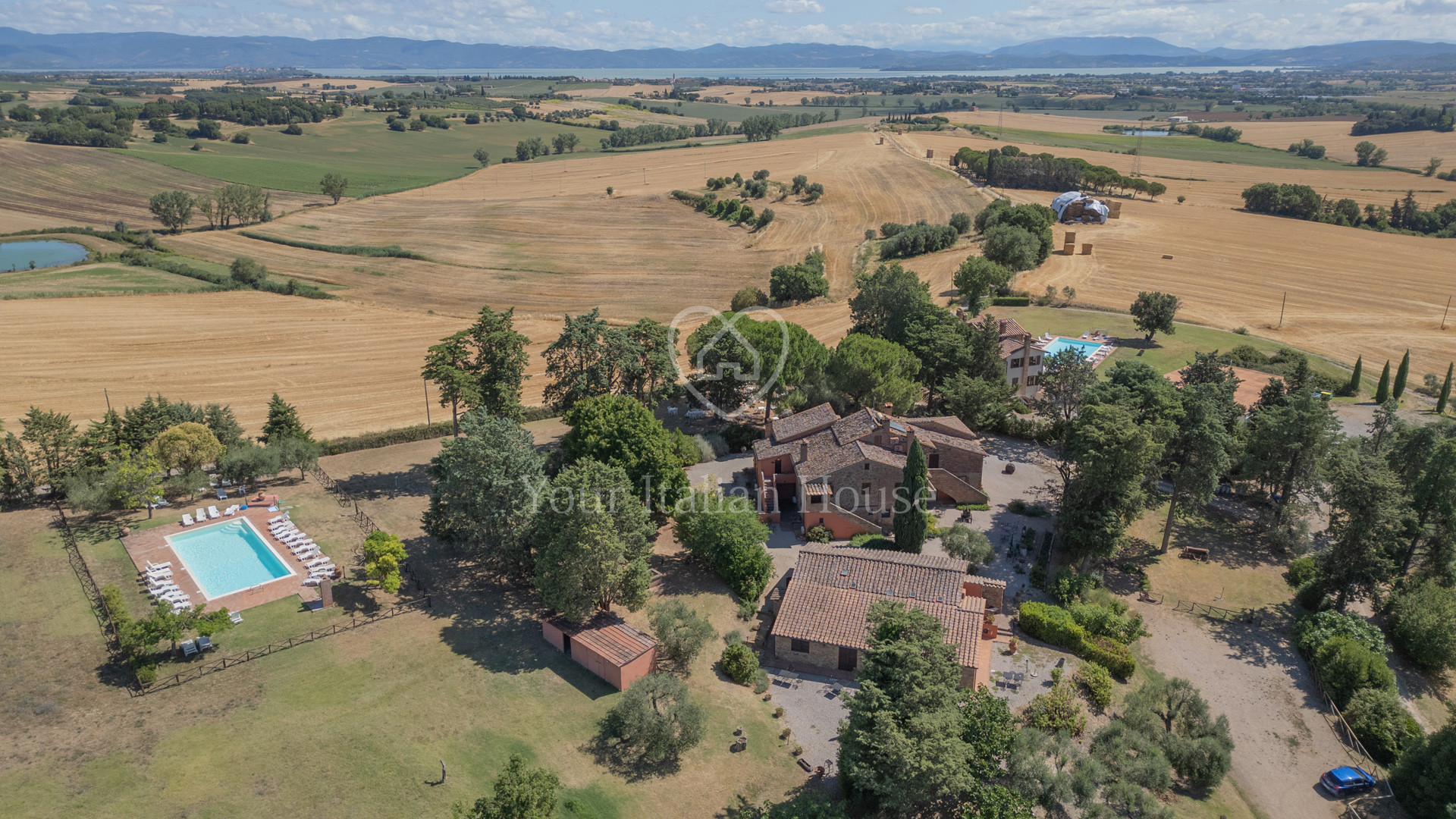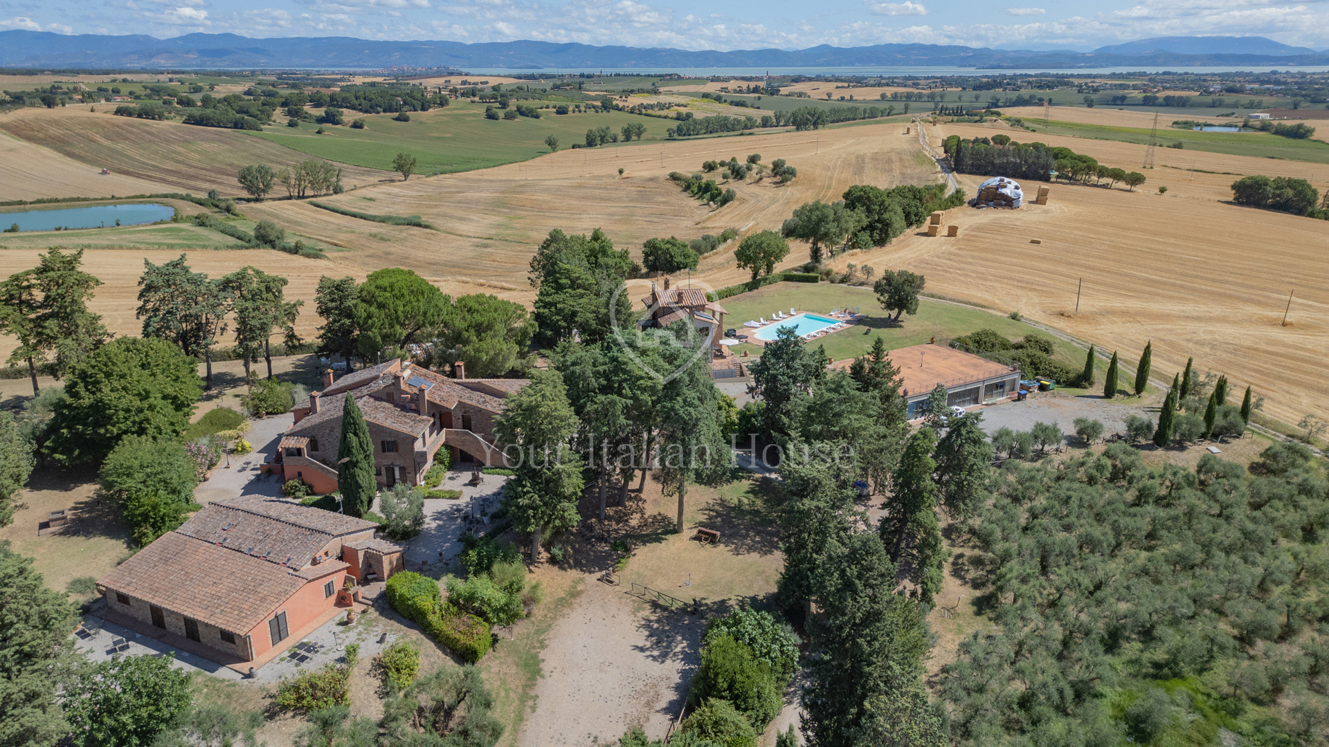 Podere Gli Olivi al Lago is a property immersed in the wonderful landscape of the Umbrian countryside with a 360° view of the lake and the Tuscan countryside. The farmhouse is approximately 670 sqm over two floors and internally arranged as follows: On the ground floor the French doors allow access to the large and welcoming living room where the typical manger of the old stable has been maintained from which it will be possible to savor a magnificent ancient and timeless style. Characteristic wooden beams and terracotta flooring. We also find a brick fireplace in the center of the large living room, an adjoining room used as a storage room, a bathroom and a professional kitchen. There is also a technical room for the two boilers with external access. Via an external staircase that leads to the first floor, we find four apartments with independent entrances similar to each other consisting of two bedrooms and two bathrooms, living room and kitchenette. The annex is divided into six studio apartments consisting of a bedroom with ensuite bathroom and a small kitchenette. The property includes an exclusive olive grove of approximately 3 hectares, a garden/park with beautiful ornamental and historical plants, a 14 x 7 swimming pool with chlorine system and salt with a panoramic view of Lake Castiglione del Lago as well as private parking. The property was a former tobacco drying house, arranged on four levels, recently renovated. On the ground floor the glass French doors fill the heart of the house with light, consisting of a large and welcoming living room dominated by a beautiful fireplace, as well as the dining room, a kitchen, a double bedroom with private bathroom and a lift. On the first floor, which can also be accessed via two external stairs, we find a living room entrance with fireplace and lift, two bedrooms with ensuite bathrooms. The second attic floor is accessed via a wrought iron staircase and here there is a room with a bed and a bathroom with tub. The basement floor consists of a large tavern that can be used as a large open space, two bathrooms, a storage room. The property includes a garden/park of approximately 0.57 hectares of exclusive ownership, a 14×7 swimming pool with chlorine system and a large annex of approximately 350 sqm.