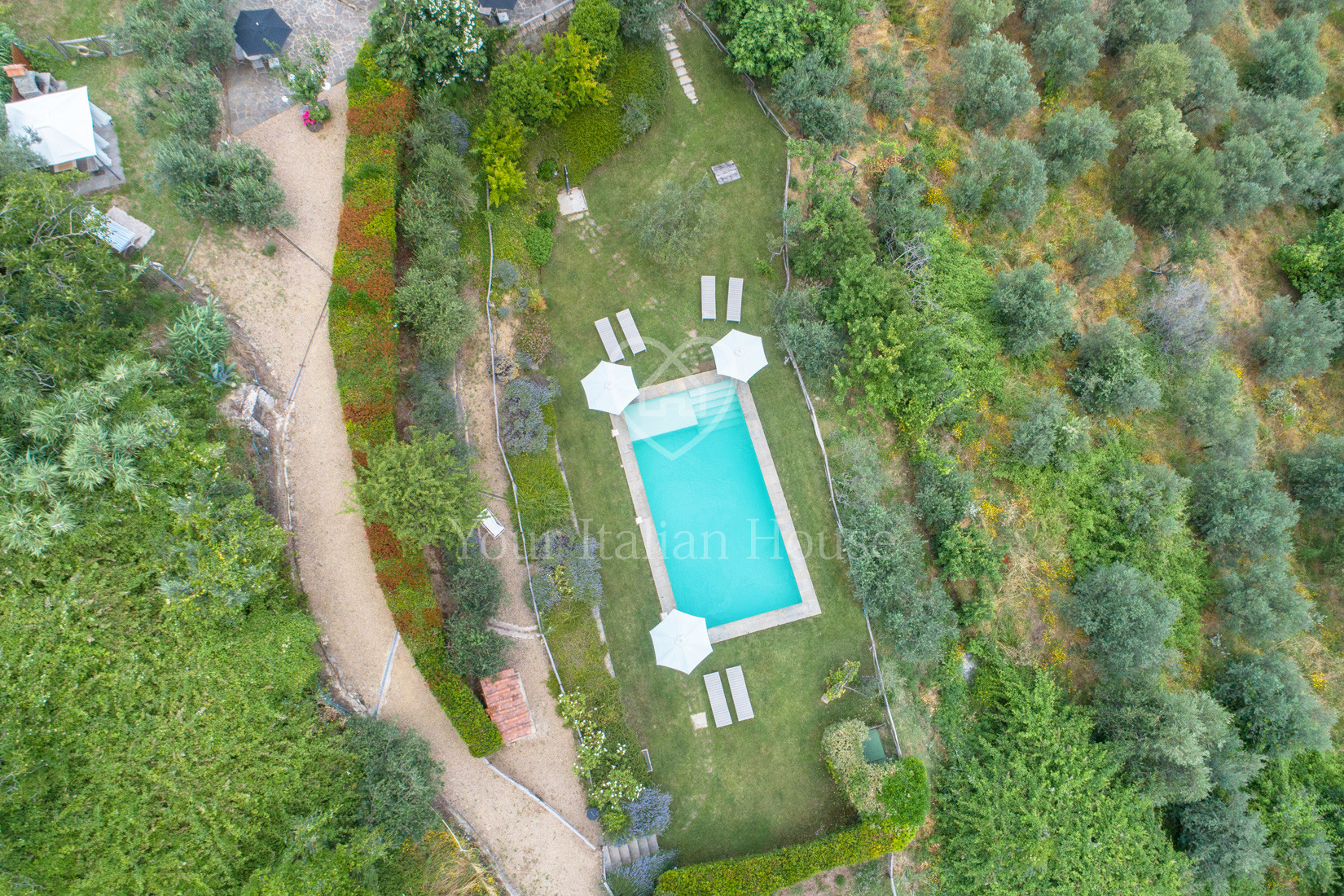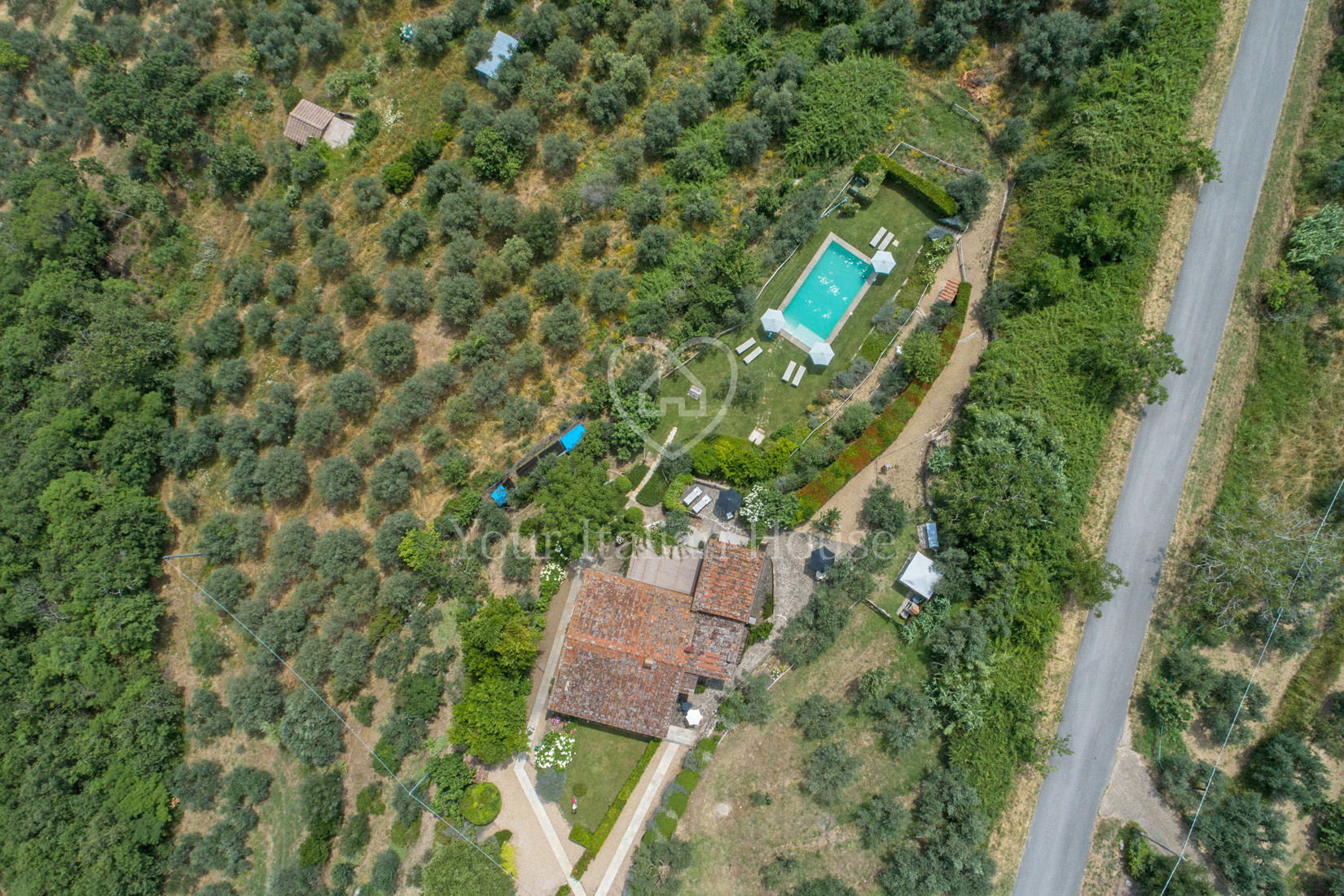Extern wordt het pand omringd door ongeveer 8.779 m² grond, waarvan 8.649 m² olijfgaarden en 140 m² tuin met een prachtig zwembad van 5X10.
