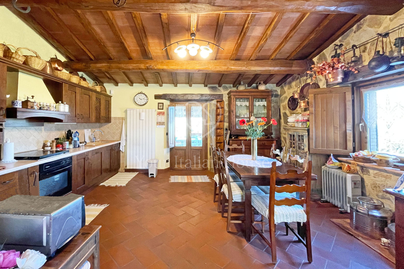 Waar ooit een oude ruïne stond, vinden we nu deze prachtige boerderij die in 2001 volledig is herbouwd. De stijl is typisch Toscaans rustiek, met zichtbare balken.