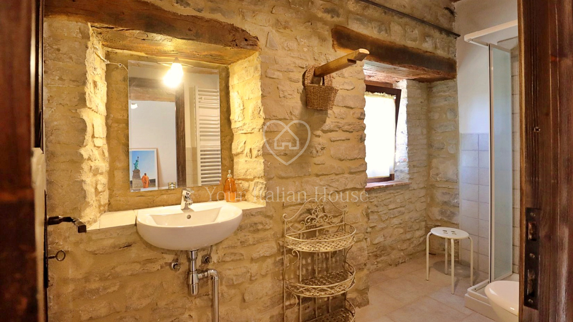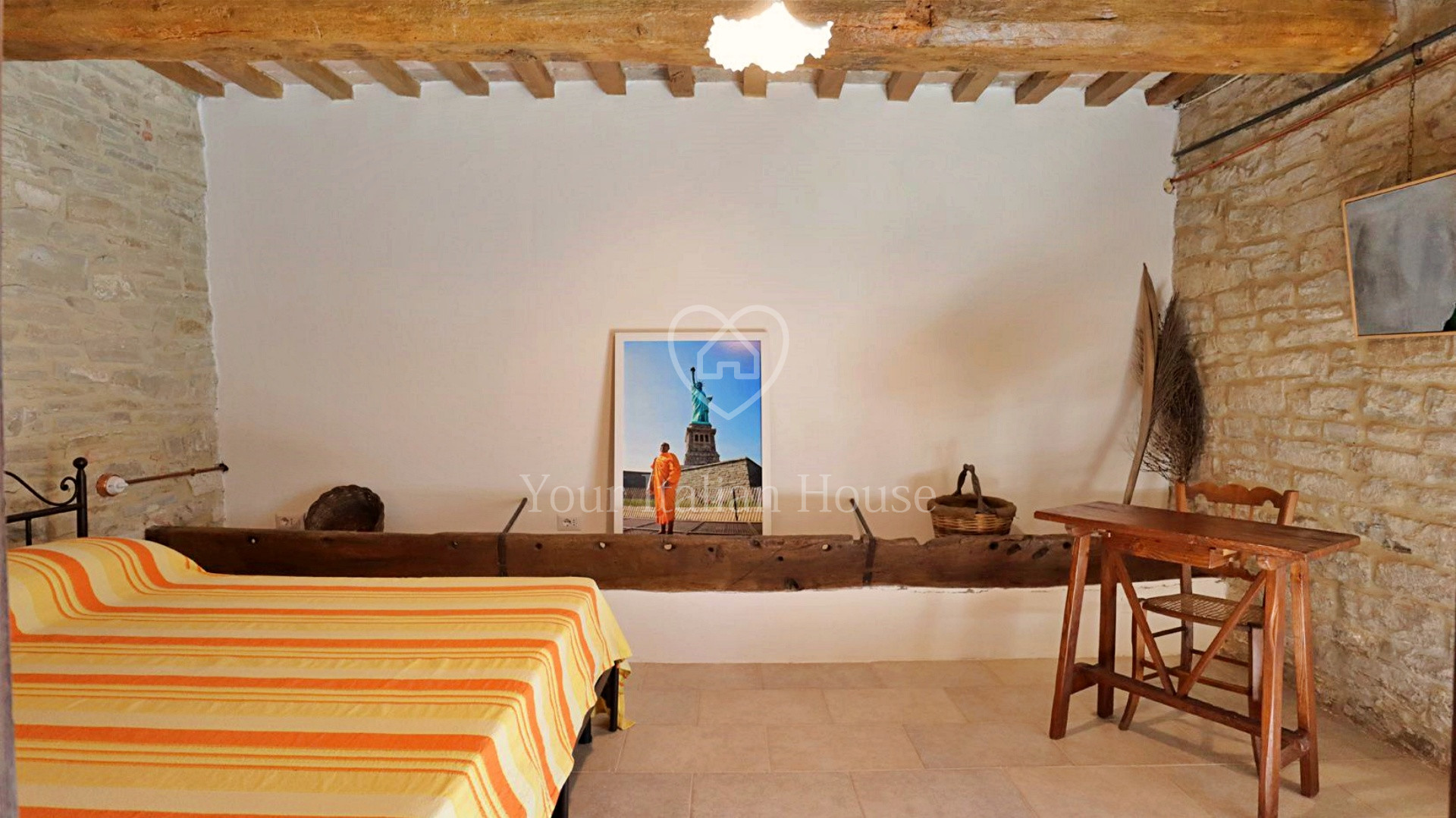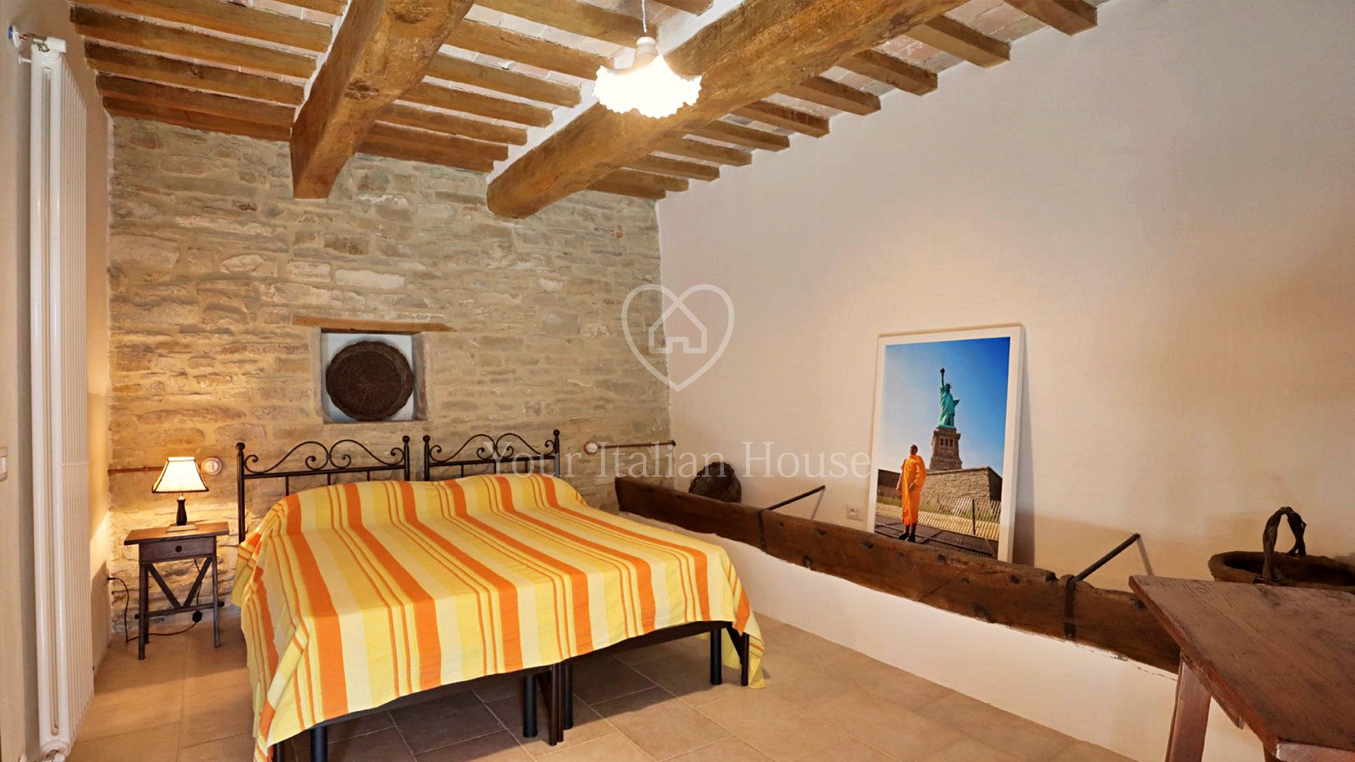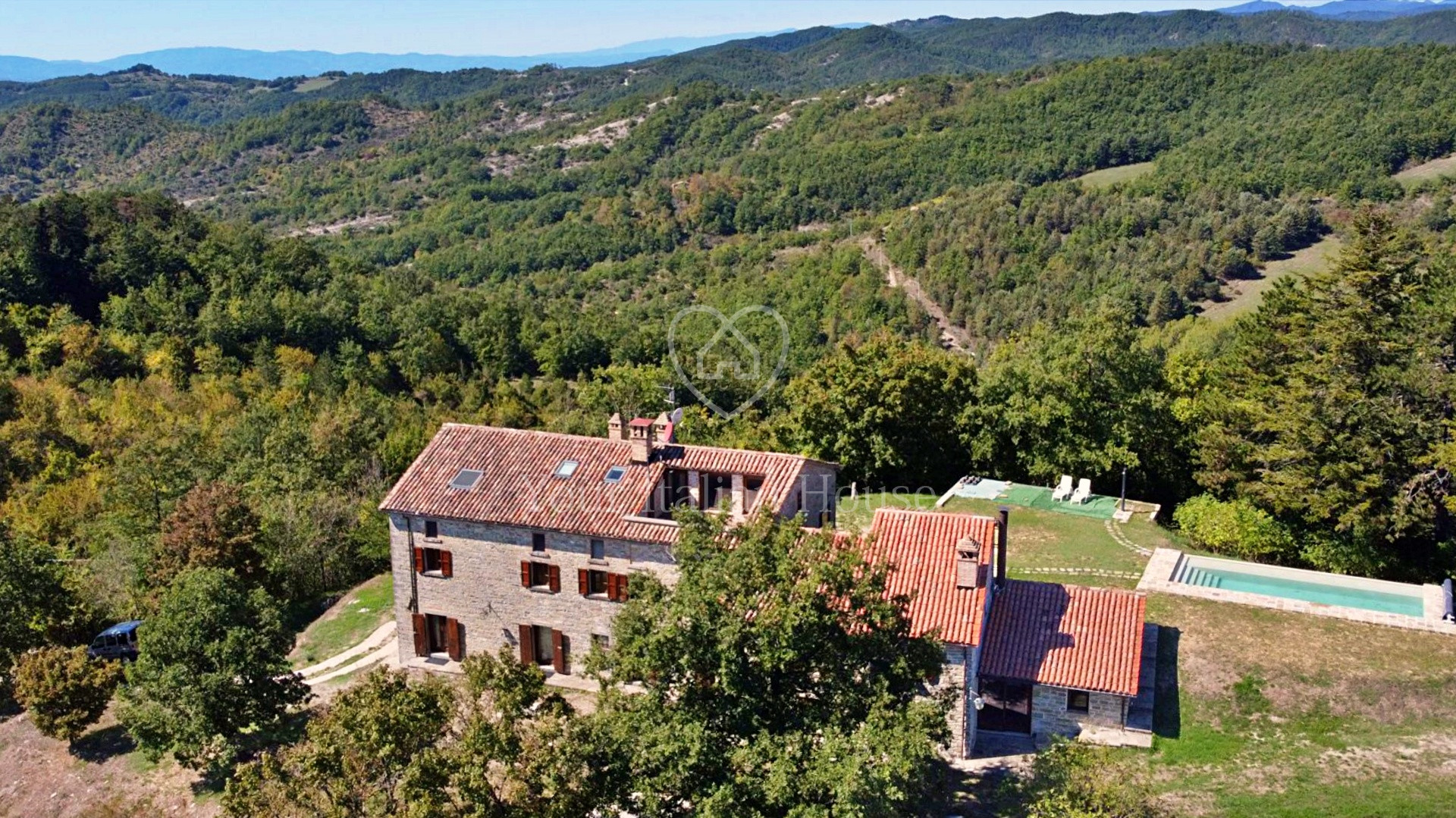 De prachtige boerderij is bereikbaar via een geasfalteerde weg. De locatie van het pand, oorspronkelijk gebouwd in de jaren 1600, biedt een panoramisch uitzicht over de Umbrische valleien en heuvels. Een groene zee van bossen kan worden waargenomen en gewaardeerd vanaf elk punt van het pand. De boerderij van 600 vierkante meter is afgewerkt met antieke materialen en ingericht met antiek. De omliggende tuin, volledig omheind en toegankelijk via twee poorten (waarvan één elektrisch), is 1.500 vierkante meter groot en herbergt een suggestief overloopzwembad. Het overige land bestaat uit een hectare bos. Op de begane grond zijn er 5 slaapkamers met badkamer en een onafhankelijk tweekamerappartement met badkamer, een grote kelder met een grote kamer, keuken, badkamer voor gehandicapten en eetkamer met steenoven; 2 stookruimtes, bewoonbare gereedschapsruimte met badkamer en wasruimte en een ruimte voor fitness. Op de eerste verdieping is er een woonkamer met balkon en panoramisch terras, studeerkamer/bibliotheek, badkamer, keuken, twee slaapkamers, badkamer met sauna, en een eetkamer met grote stenen open haard. Op de tweede verdieping is er een zolder met houten balken bestaande uit 2 slaapkamers, een grote tweepersoonsslaapkamer en een badkamer. Het is mogelijk om de oppervlakte van het pand uit te breiden met nog eens 100 overdekte vierkante meter.