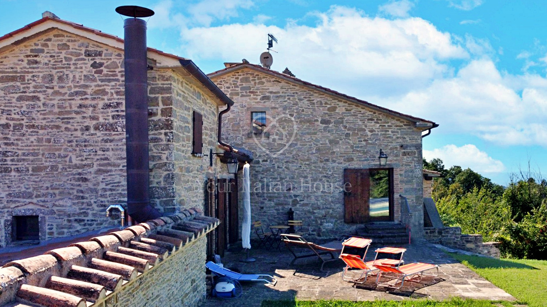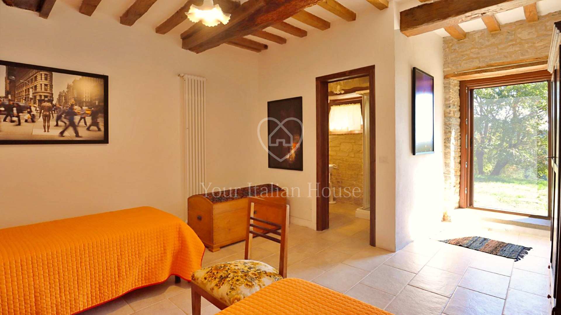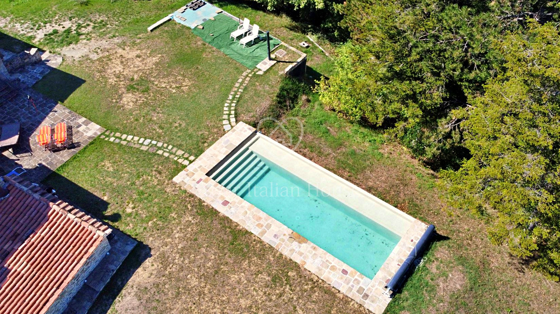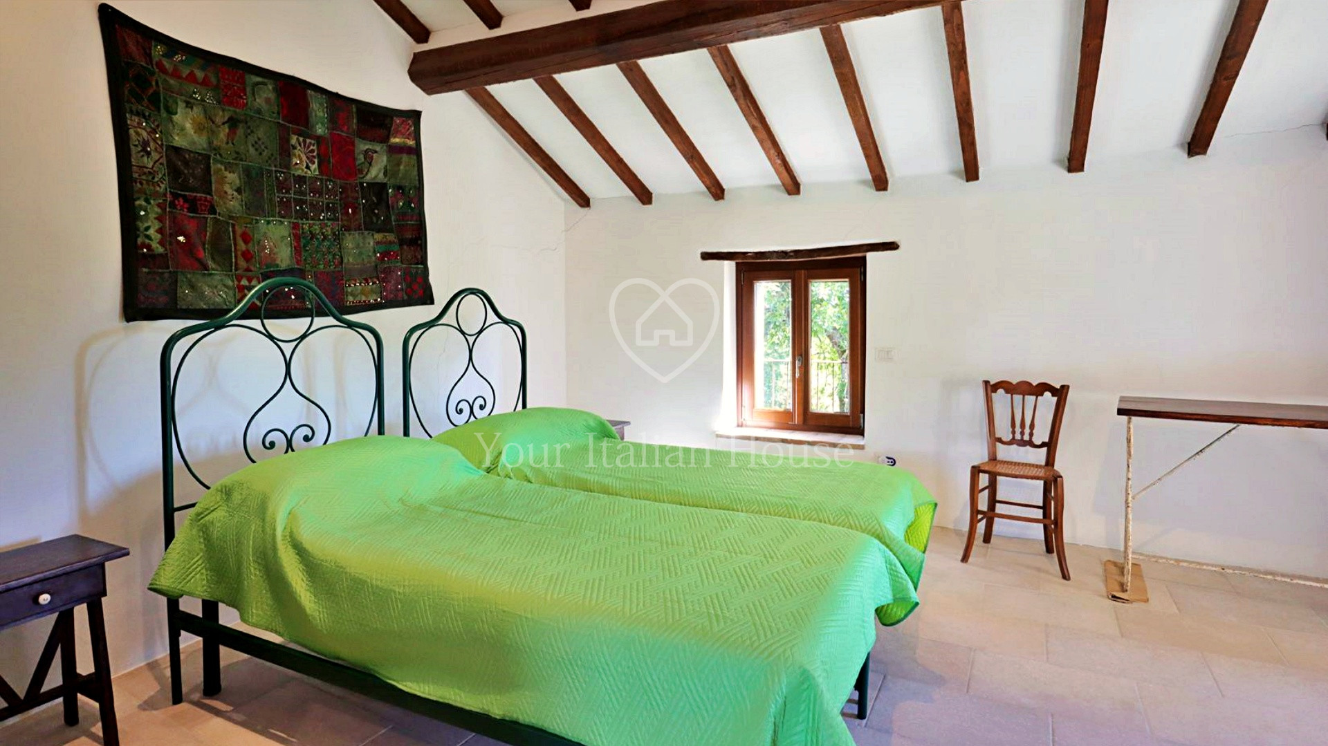 De prachtige boerderij is bereikbaar via een geasfalteerde weg. De locatie van het pand, oorspronkelijk gebouwd in de jaren 1600, biedt een panoramisch uitzicht over de Umbrische valleien en heuvels. Een groene zee van bossen kan worden waargenomen en gewaardeerd vanaf elk punt van het pand. De boerderij van 600 vierkante meter is afgewerkt met antieke materialen en ingericht met antiek. De omliggende tuin, volledig omheind en toegankelijk via twee poorten (waarvan één elektrisch), is 1.500 vierkante meter groot en herbergt een suggestief overloopzwembad. Het overige land bestaat uit een hectare bos. Op de begane grond zijn er 5 slaapkamers met badkamer en een onafhankelijk tweekamerappartement met badkamer, een grote kelder met een grote kamer, keuken, badkamer voor gehandicapten en eetkamer met steenoven; 2 stookruimtes, bewoonbare gereedschapsruimte met badkamer en wasruimte en een ruimte voor fitness. Op de eerste verdieping is er een woonkamer met balkon en panoramisch terras, studeerkamer/bibliotheek, badkamer, keuken, twee slaapkamers, badkamer met sauna, en een eetkamer met grote stenen open haard. Op de tweede verdieping is er een zolder met houten balken bestaande uit 2 slaapkamers, een grote tweepersoonsslaapkamer en een badkamer. Het is mogelijk om de oppervlakte van het pand uit te breiden met nog eens 100 overdekte vierkante meter.