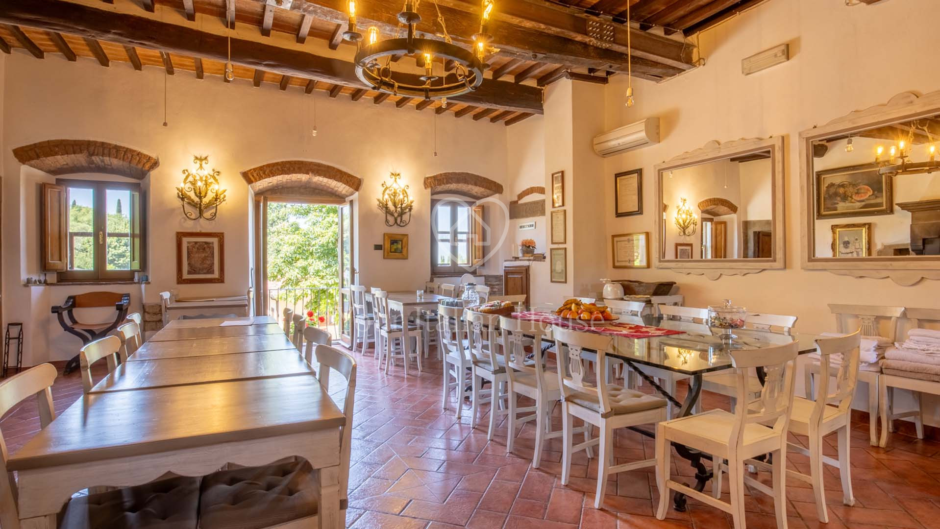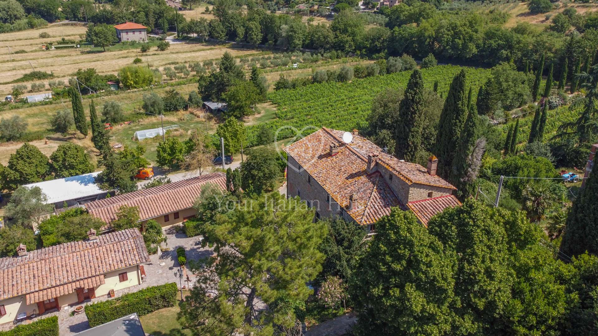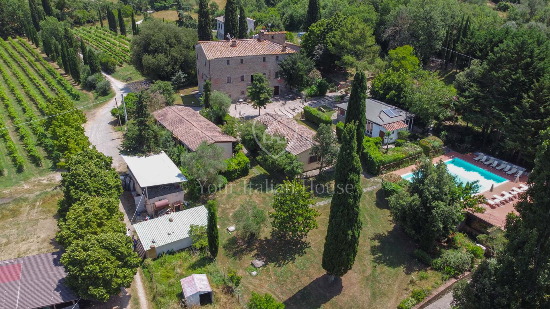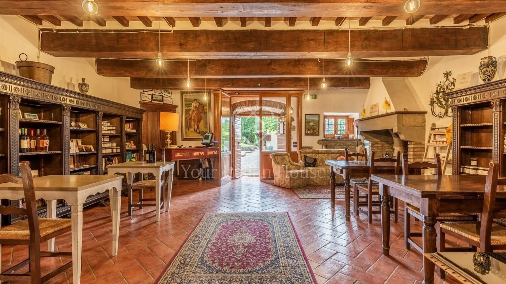 La Dimora Storica is een volledig gerenoveerd voormalig 16e eeuws klooster van ongeveer 1.100 m² en 10,2 hectare grond, waaronder een olijfgaard met 1.000 planten, een wijngaard van ongeveer 1,6 hectare in productie, kwekerij, bossen en weilanden. De majestueuze stenen hoofdboerderij heeft 3 verdiepingen. De vakkundig gerestaureerde historische residentie, een voormalig klooster uit de 16e eeuw, bestaat uit een woonkamer, keuken, suite met eigen badkamer en panoramisch uitzicht. Elke kamer is versierd met unieke fresco's. In het tweede deel bevinden zich de ontvangsthal, de uitgeruste keuken en het magazijn op de begane grond. Op de eerste verdieping bestaat het 0 km lange biologische agri-restaurant uit een appartement met drie slaapkamers, drie badkamers, wasruimte en een junior suite met badkamer. Er tegenover liggen twee villa's met in totaal zes appartementen, waarvan een voor gehandicapten, allemaal met keuken, woonkamer en slaapkamer met badkamer, voorzien van alle comfort. Om het pand compleet te maken is er een ontspannend wellnesscentrum met massageruimte, Turks bad, hydromassagedouche, badkamer en kleedkamer, evenals een uitstekend uitgeruste fitnessruimte voor het hele lichaam. Er is ook een magazijn voor conserven en een kelder gewijd aan de productie van producten van het bedrijf. Het eigendom ligt ondergedompeld in 12 hectare grond waarvan 4 hectare bebouwd is met olijfgaarden die een uitstekende Toscaanse olie produceren en 1,6 hectare wijngaarden waar de gewaardeerde rode wijn van het bedrijf geproduceerd wordt. Buiten vinden we een panoramisch zwembad en nog een overdekt zwembad met hydromassage. Het eigendom is omringd door een kinderspeelplaats, een park uitgerust voor work-out met een fitnessparcours en een landingsplaats voor helikopters. Het landgoed is verrijkt met grote terrassen en luifels bedekt met bloeiende blauwe regen, evenals een majestueuze pergola voor het buitenrestaurant met uniek uitzicht op het omringende platteland.