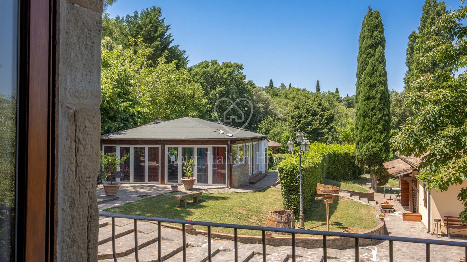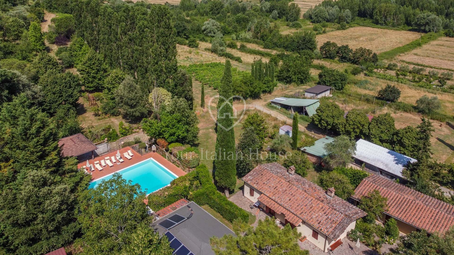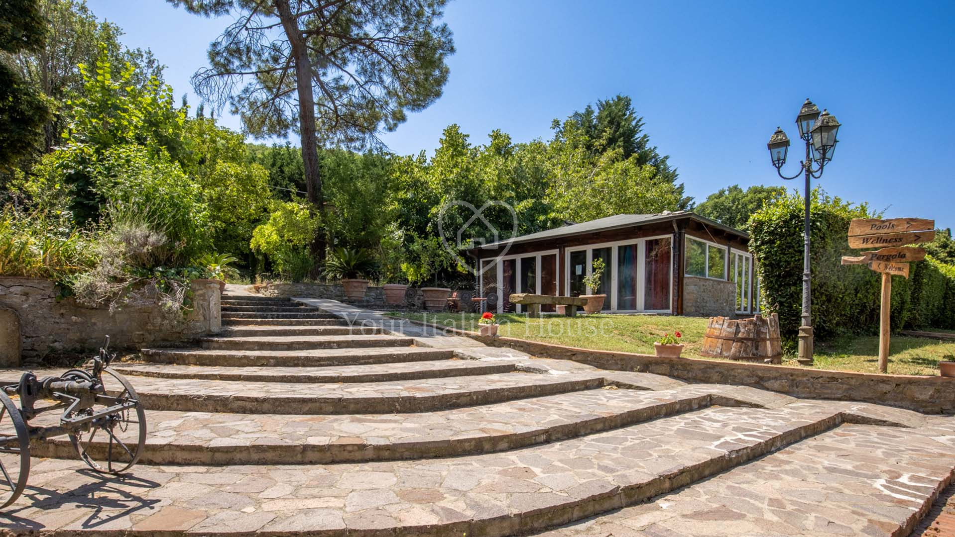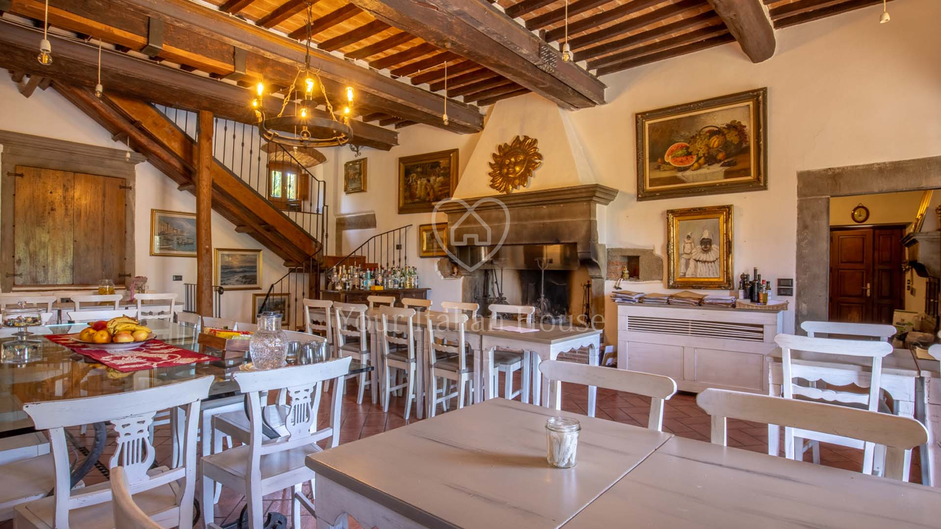 La Dimora Storica is een volledig gerenoveerd voormalig 16e eeuws klooster van ongeveer 1.100 m² en 10,2 hectare grond, waaronder een olijfgaard met 1.000 planten, een wijngaard van ongeveer 1,6 hectare in productie, kwekerij, bossen en weilanden. De majestueuze stenen hoofdboerderij heeft 3 verdiepingen. De vakkundig gerestaureerde historische residentie, een voormalig klooster uit de 16e eeuw, bestaat uit een woonkamer, keuken, suite met eigen badkamer en panoramisch uitzicht. Elke kamer is versierd met unieke fresco's. In het tweede deel bevinden zich de ontvangsthal, de uitgeruste keuken en het magazijn op de begane grond. Op de eerste verdieping bestaat het 0 km lange biologische agri-restaurant uit een appartement met drie slaapkamers, drie badkamers, wasruimte en een junior suite met badkamer. Er tegenover liggen twee villa's met in totaal zes appartementen, waarvan een voor gehandicapten, allemaal met keuken, woonkamer en slaapkamer met badkamer, voorzien van alle comfort. Om het pand compleet te maken is er een ontspannend wellnesscentrum met massageruimte, Turks bad, hydromassagedouche, badkamer en kleedkamer, evenals een uitstekend uitgeruste fitnessruimte voor het hele lichaam. Er is ook een magazijn voor conserven en een kelder gewijd aan de productie van producten van het bedrijf. Het eigendom ligt ondergedompeld in 12 hectare grond waarvan 4 hectare bebouwd is met olijfgaarden die een uitstekende Toscaanse olie produceren en 1,6 hectare wijngaarden waar de gewaardeerde rode wijn van het bedrijf geproduceerd wordt. Buiten vinden we een panoramisch zwembad en nog een overdekt zwembad met hydromassage. Het eigendom is omringd door een kinderspeelplaats, een park uitgerust voor work-out met een fitnessparcours en een landingsplaats voor helikopters. Het landgoed is verrijkt met grote terrassen en luifels bedekt met bloeiende blauwe regen, evenals een majestueuze pergola voor het buitenrestaurant met uniek uitzicht op het omringende platteland.