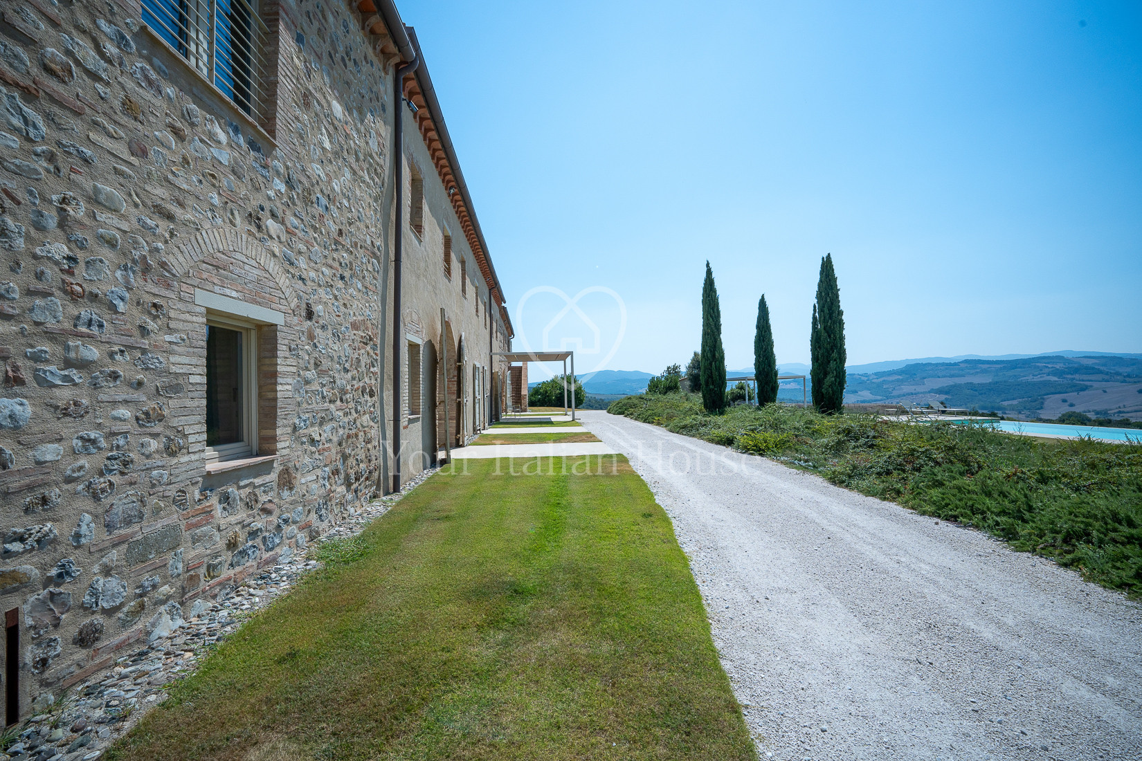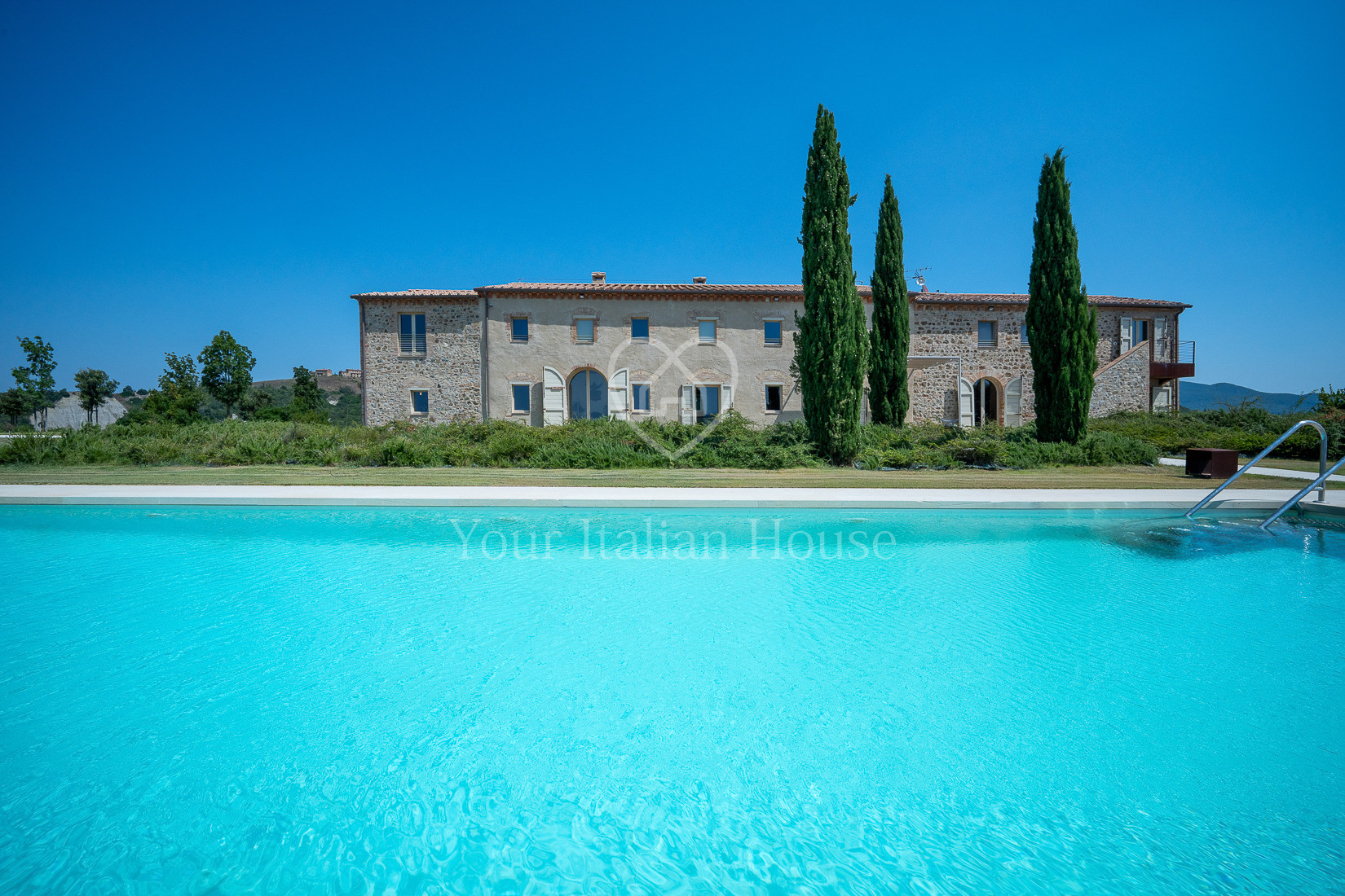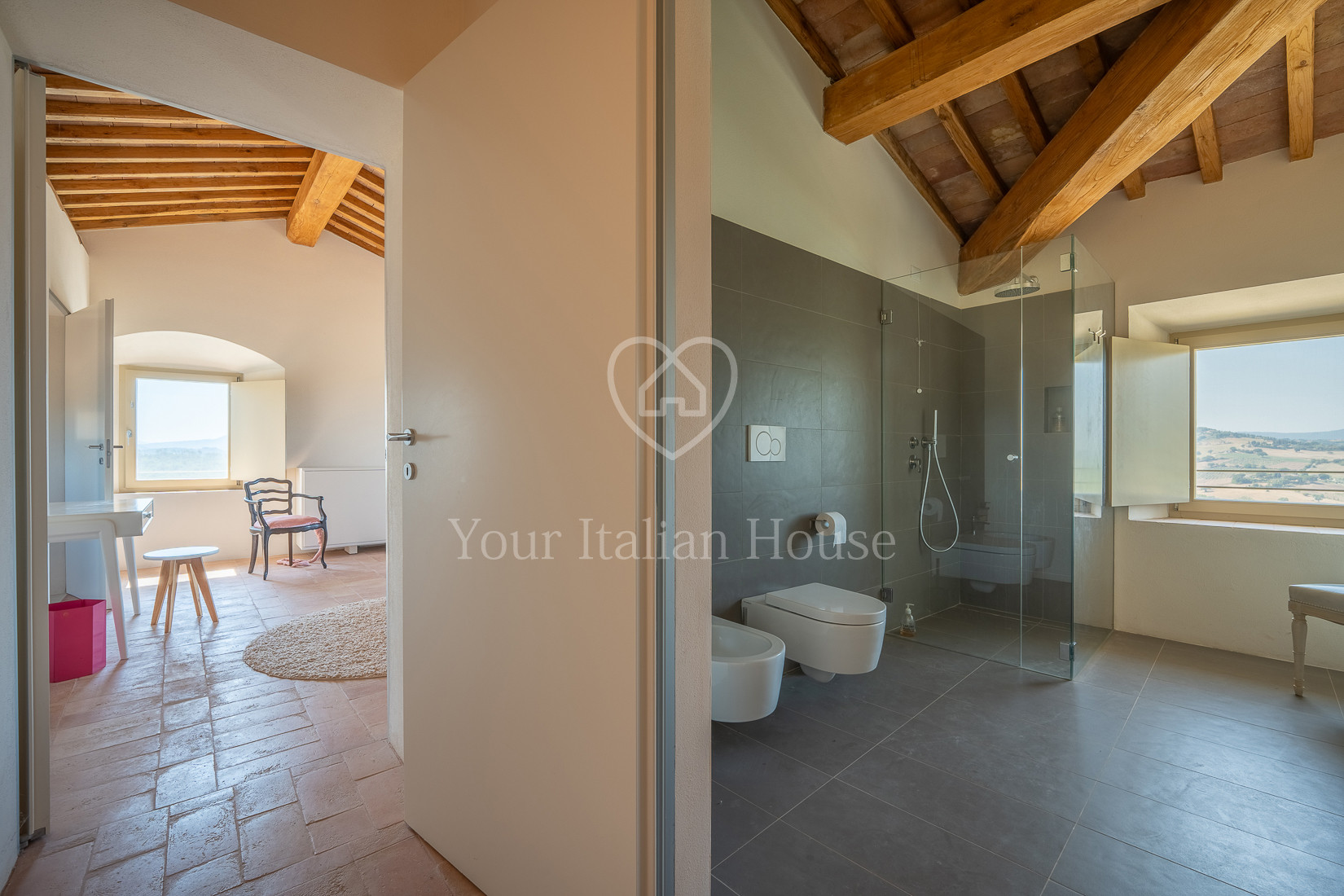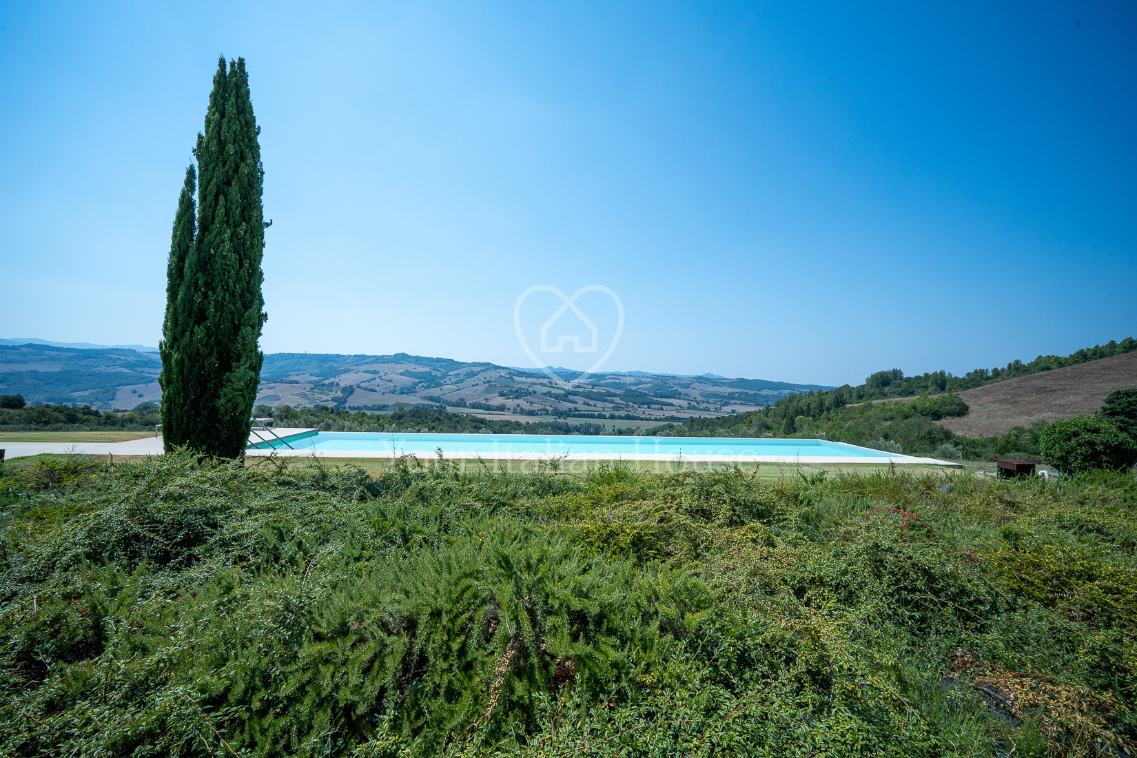 A few kilometers from Volterra, immersed in a dream landscape with 360-degree views of the rolling Tuscan hills, for sale sensational property consisting of a farmhouse of 985 sqm gross, an annex of about 275 sqm used as a tool shed, infinity pool and land of about 84 hectares.