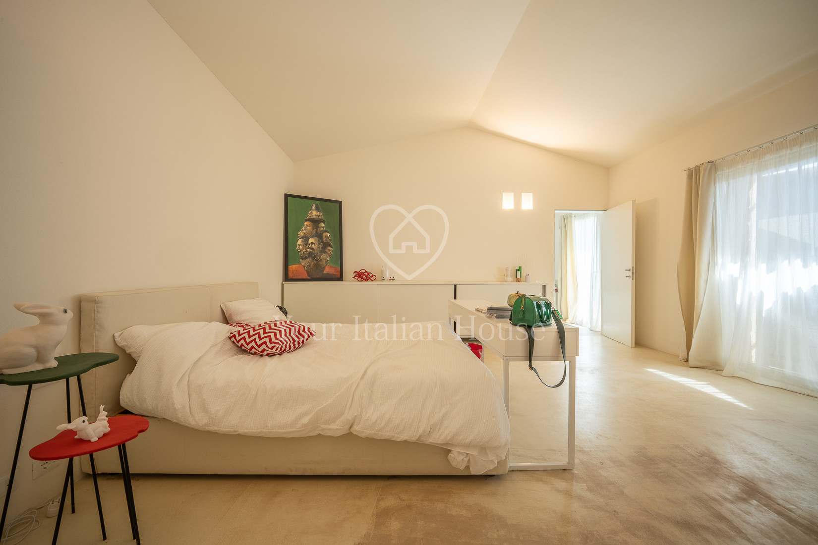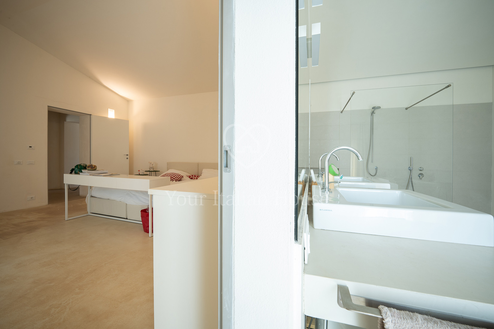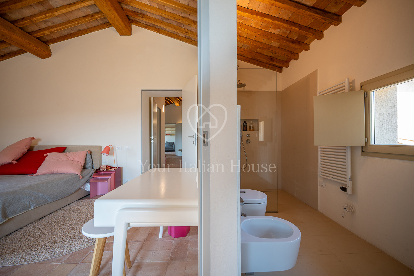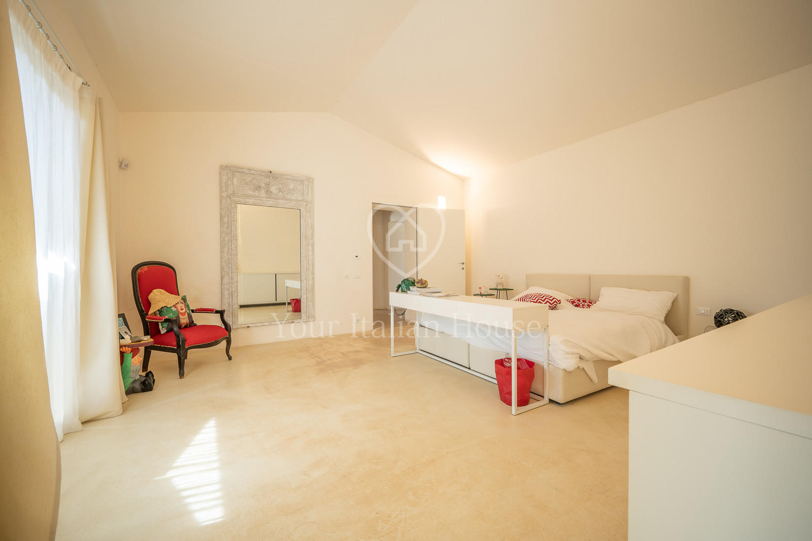 Returning to the entrance hall, we have a large workshop, while on the right wing there is an additional living room, a study, a first bedroom with wardrobe and ensuite bathroom, and a second bedroom, also with ensuite bathroom equipped with bathtub, shower and double sinks.