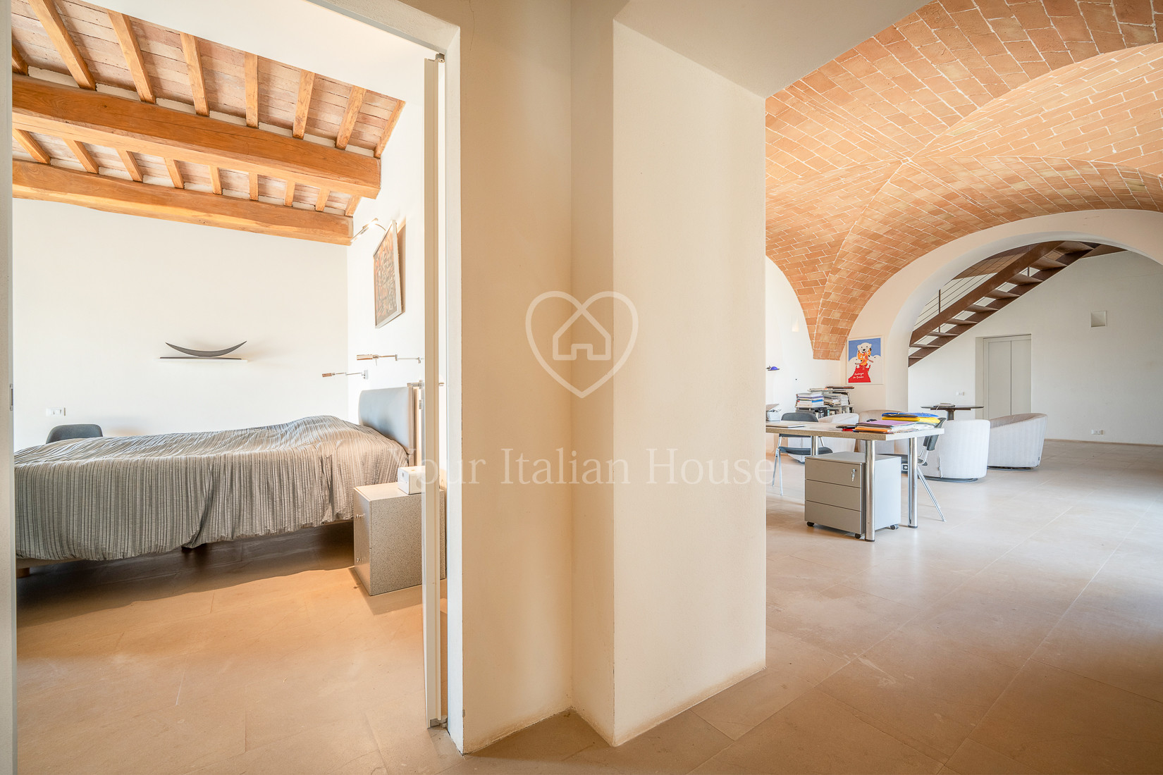 In 2018 the ancient ruin has undergone a complete restoration that has resulted in a unique object in which traditional Tuscan features, such as cross vaults and wooden beams, and modern comforts such as underfloor heating and refrigeration, solar panels, home automation elements and an elevator connecting the ground floor to the second floor coexist. The finishes are all of a very high standard and the spaces really bright thanks to the presence of numerous French doors that give direct access to the outside.