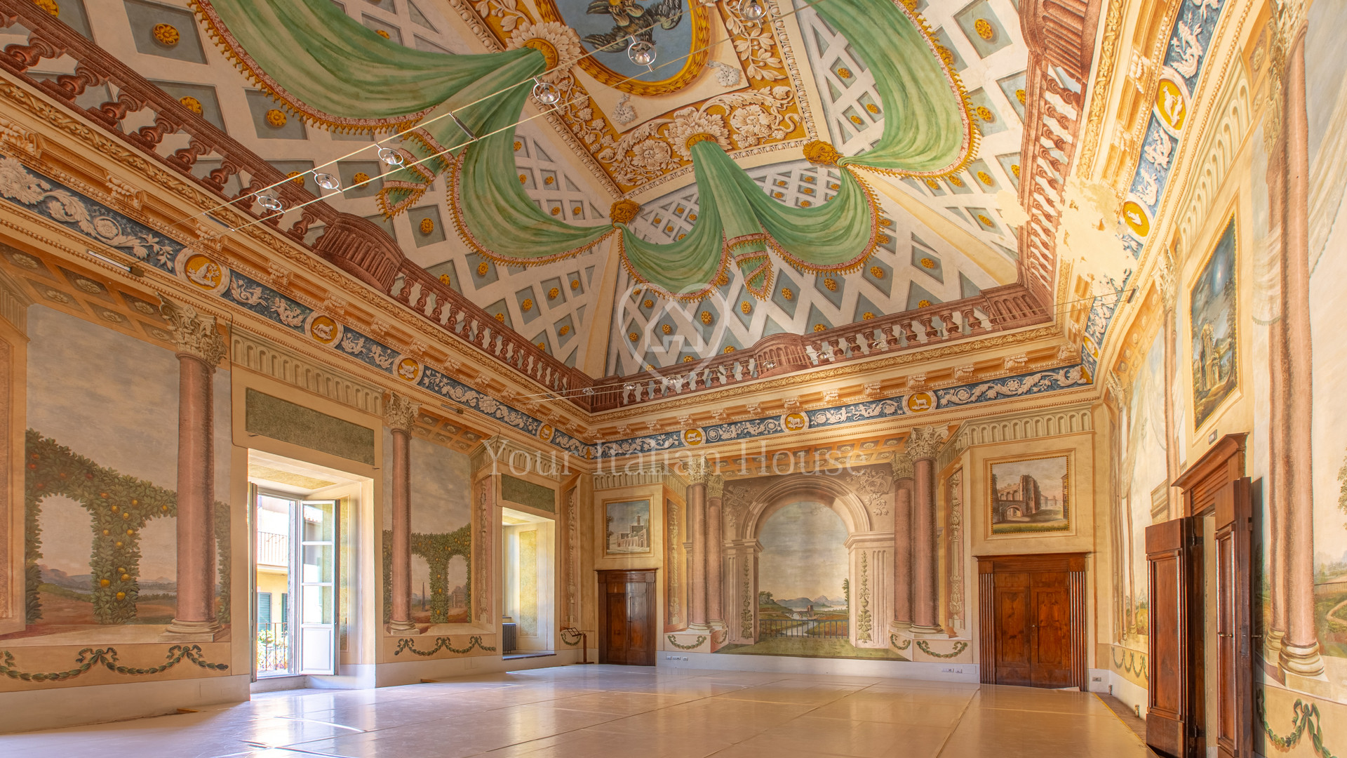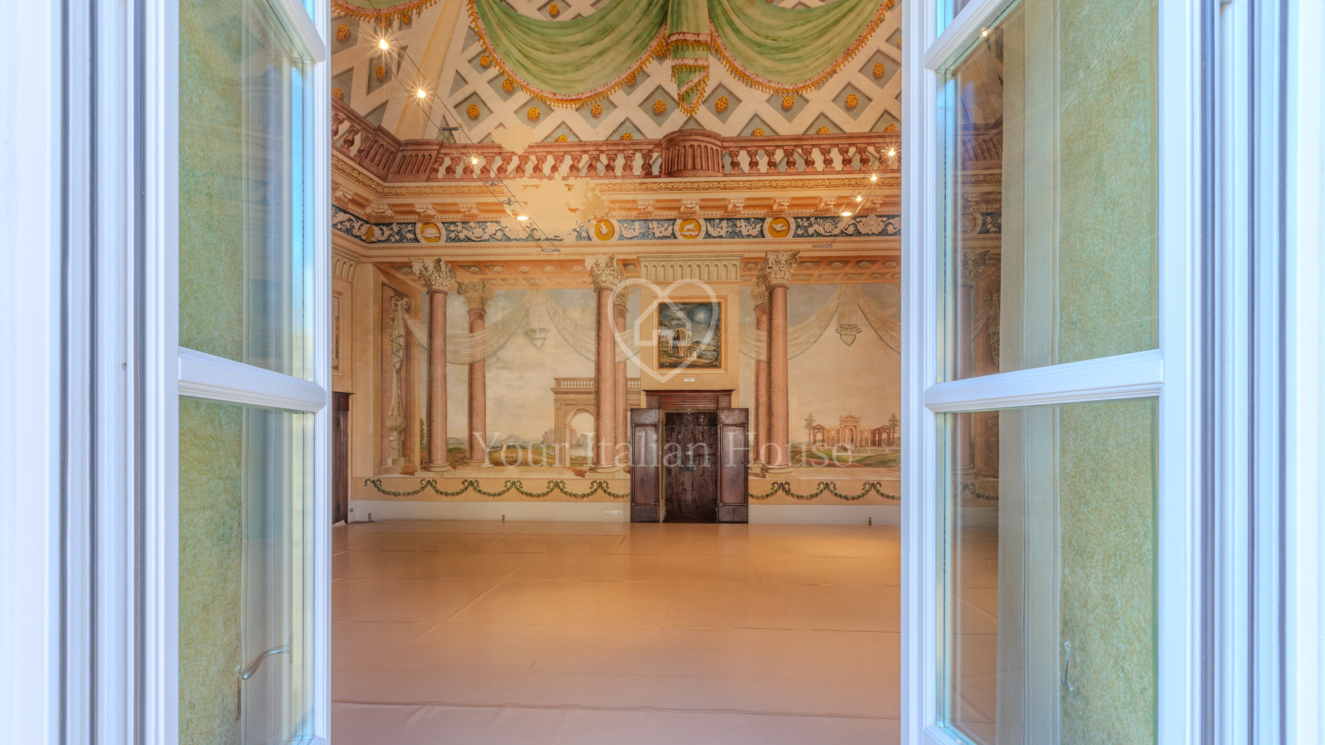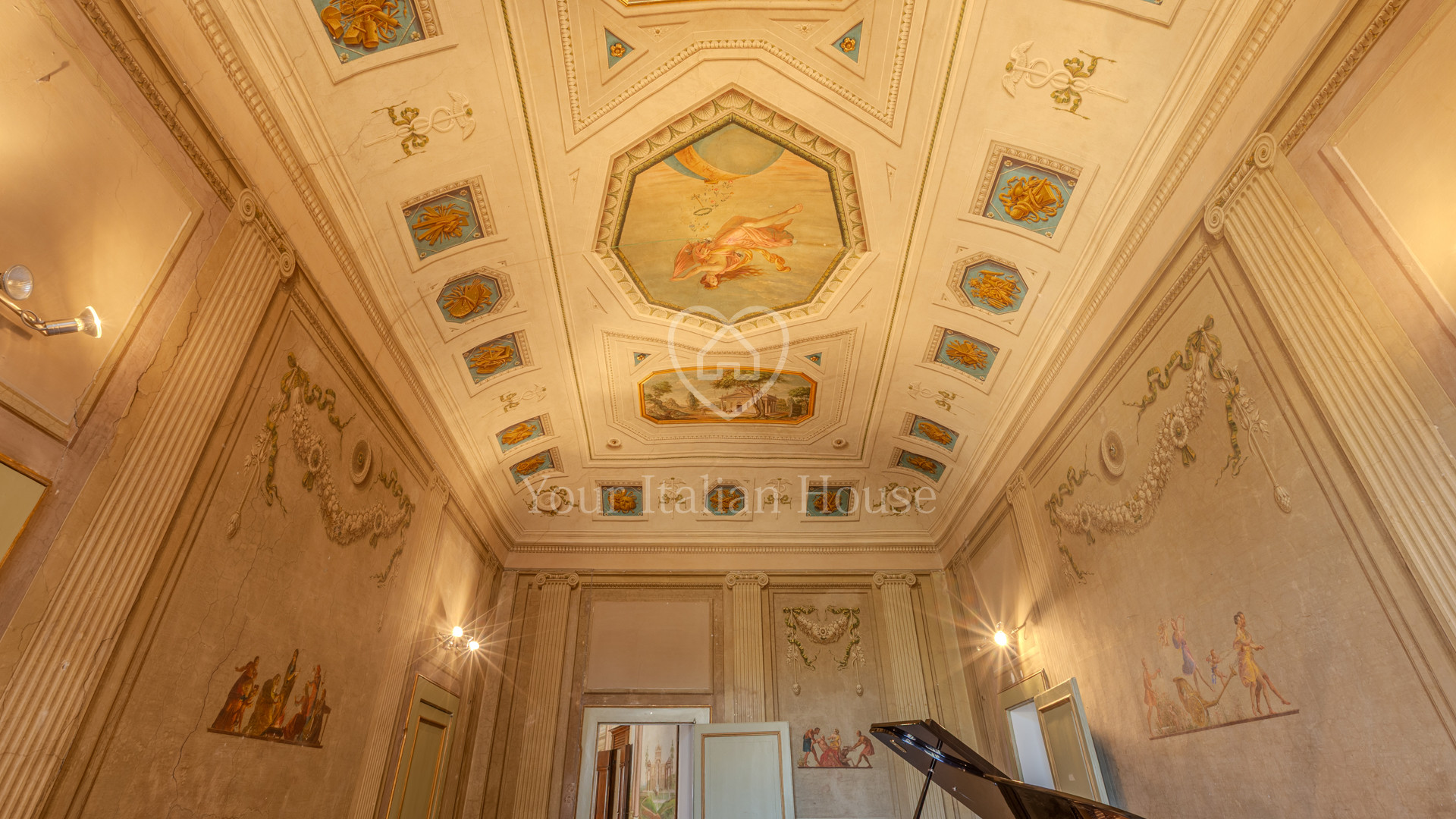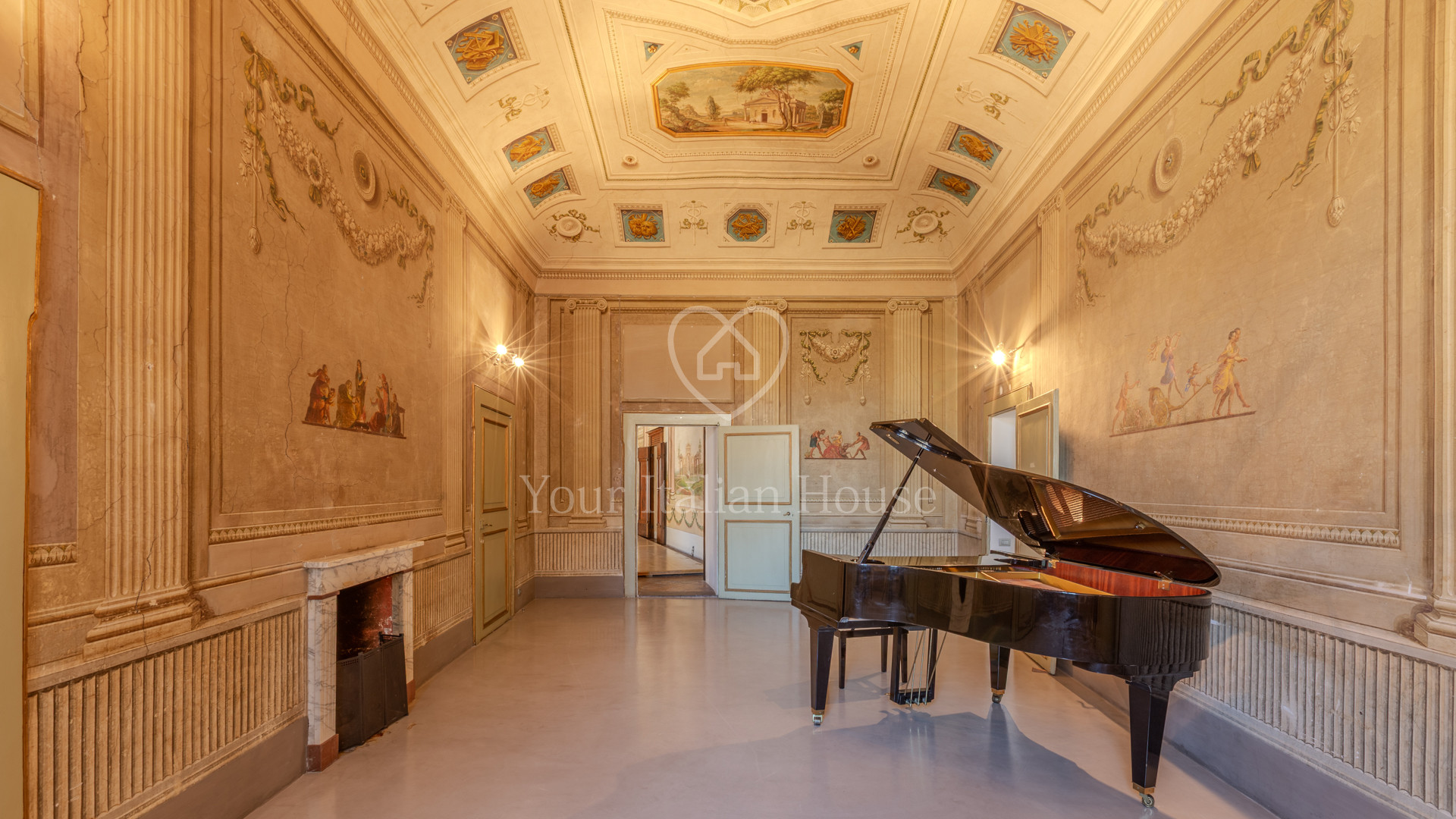 De grote woonkamer leidt naar de andere drie kamers, fijn en artistiek beschilderd en gedecoreerd met neoklassieke en groteske elementen uit de jaren 1700, 1 kantoor/bar, twee eetkamers, garderobe, badkamerruimte, doucheruimte, 1 wasruimte, lobby en een professionele keuken, uitgerust om te koken en voor accommodatie van catering.