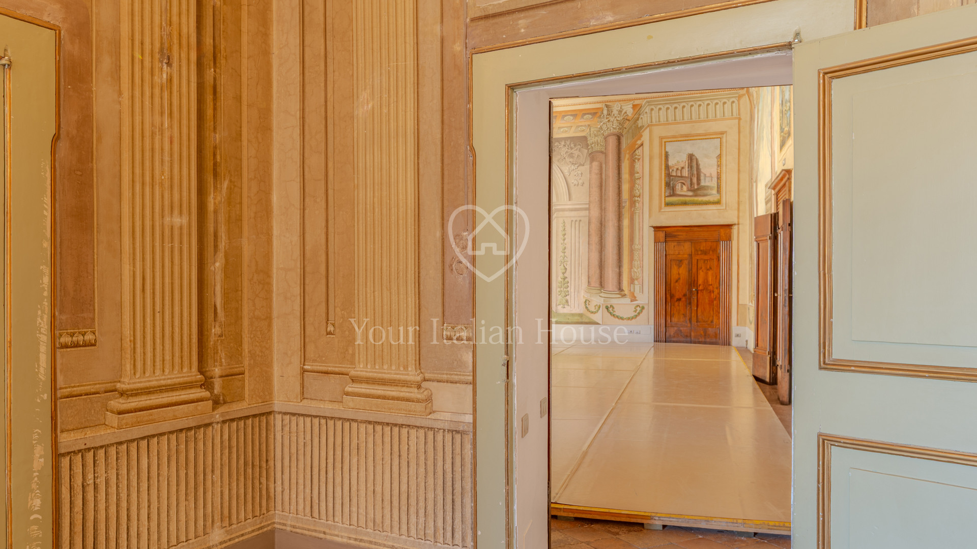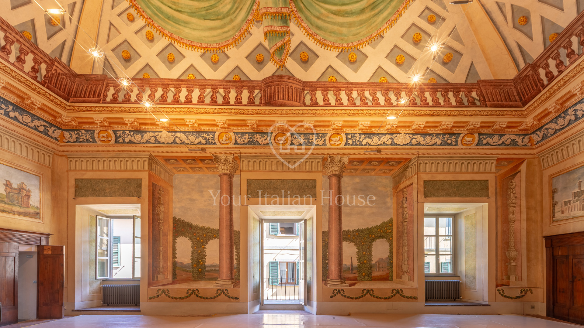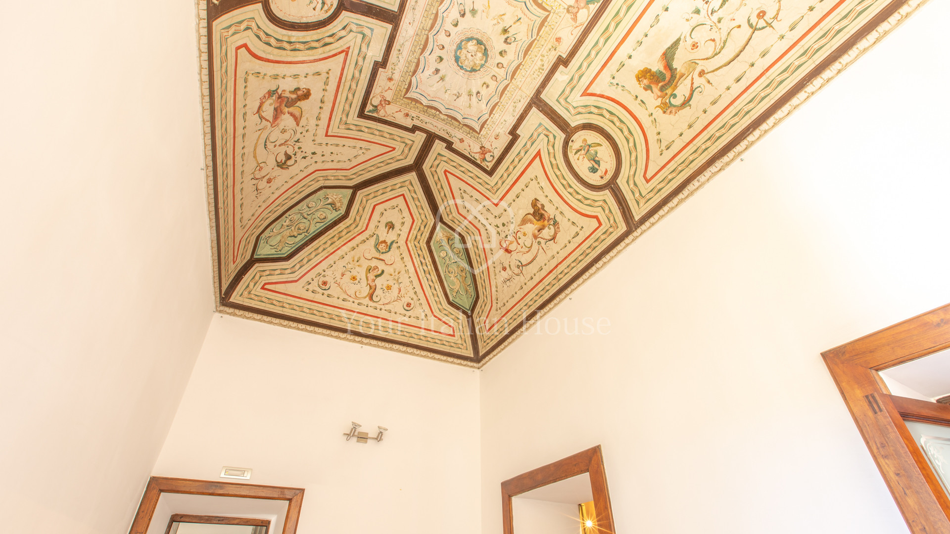 De grote woonkamer leidt naar de andere drie kamers, fijn en artistiek beschilderd en gedecoreerd met neoklassieke en groteske elementen uit de jaren 1700, 1 kantoor/bar, twee eetkamers, garderobe, badkamerruimte, doucheruimte, 1 wasruimte, lobby en een professionele keuken, uitgerust om te koken en voor accommodatie van catering.