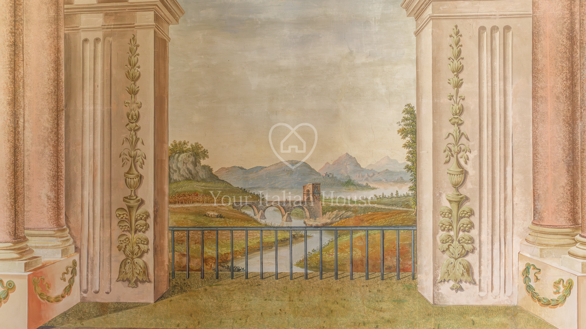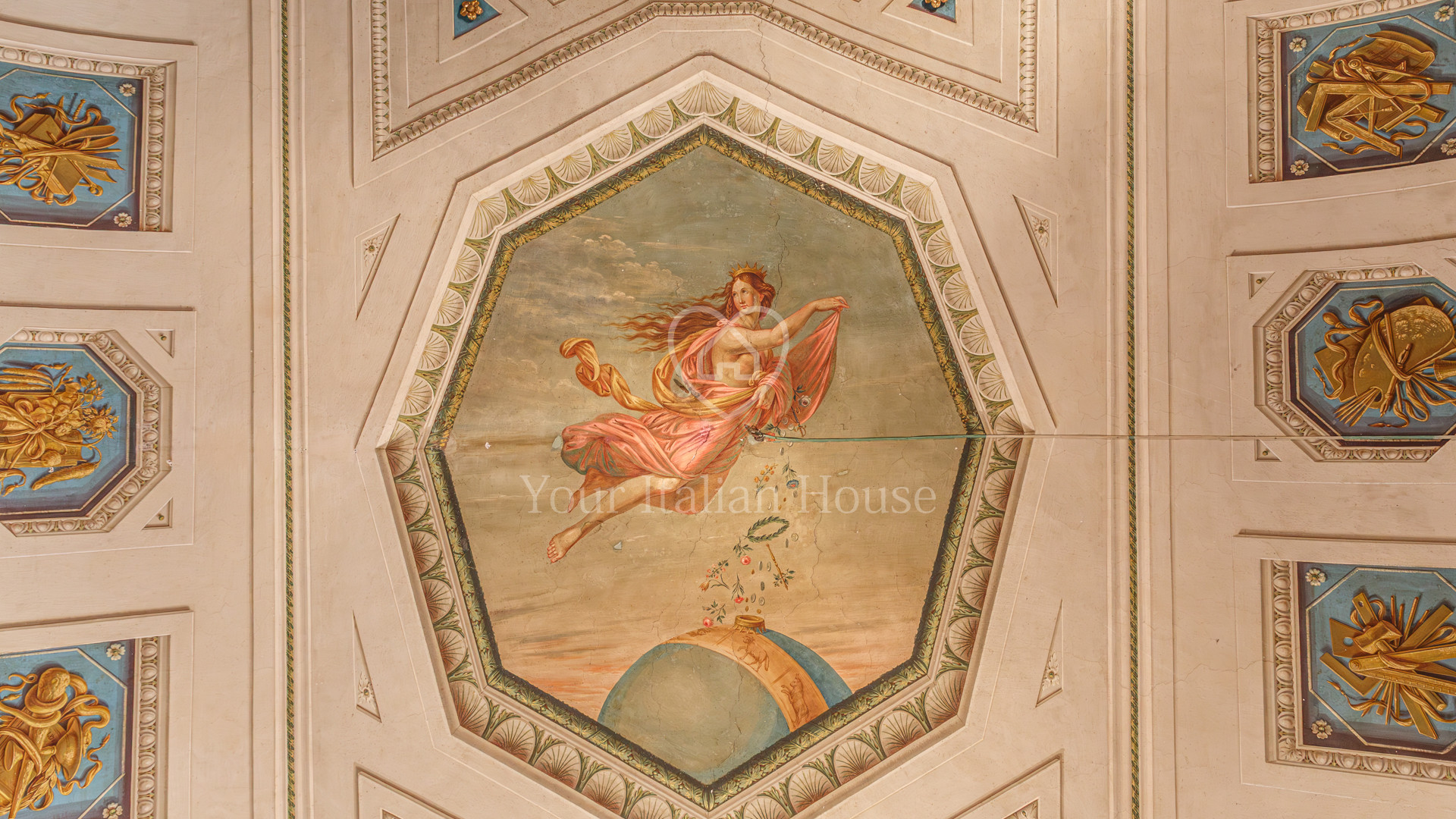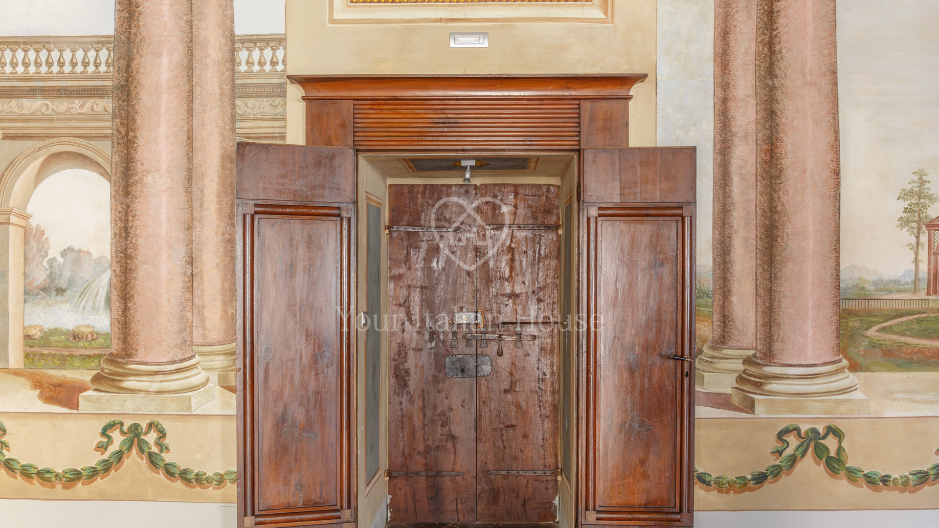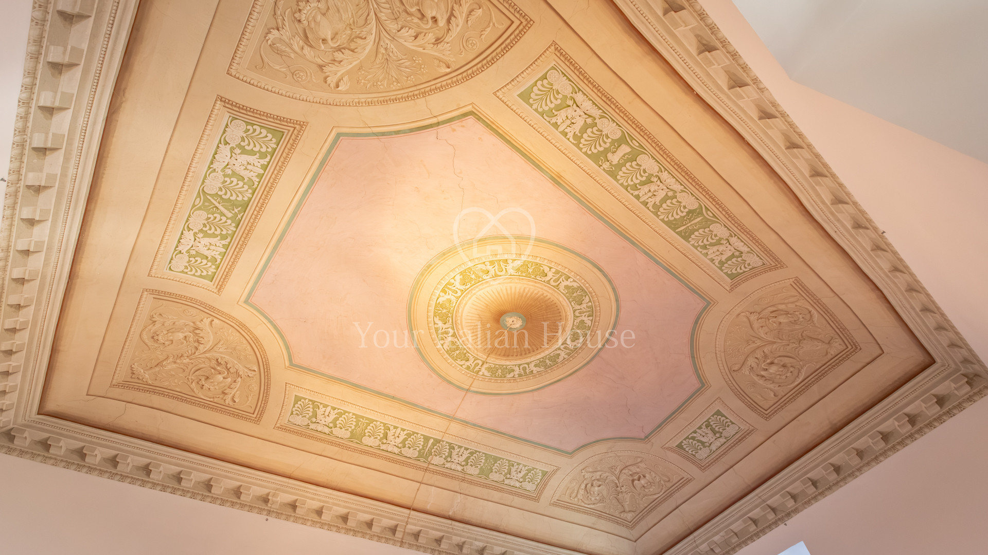 De grote woonkamer leidt naar de andere drie kamers, fijn en artistiek beschilderd en gedecoreerd met neoklassieke en groteske elementen uit de jaren 1700, 1 kantoor/bar, twee eetkamers, garderobe, badkamerruimte, doucheruimte, 1 wasruimte, lobby en een professionele keuken, uitgerust om te koken en voor accommodatie van catering.
