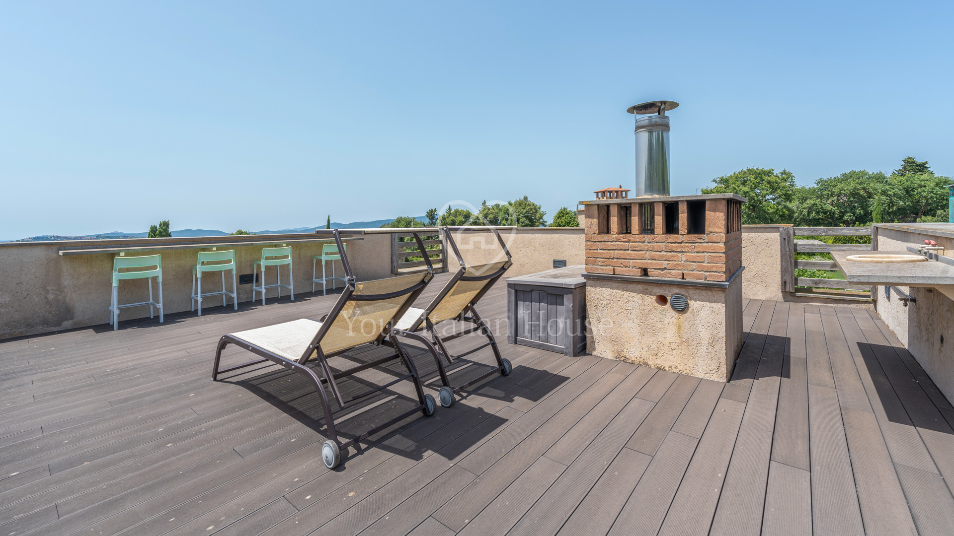 De villa, van 180 vierkante meter verdeeld over drie verdiepingen, heeft een mooie woonkamer met keuken, twee slaapkamers, drie badkamers, garage, kelder, technische ruimte en een prachtig dakterras van 60 m².