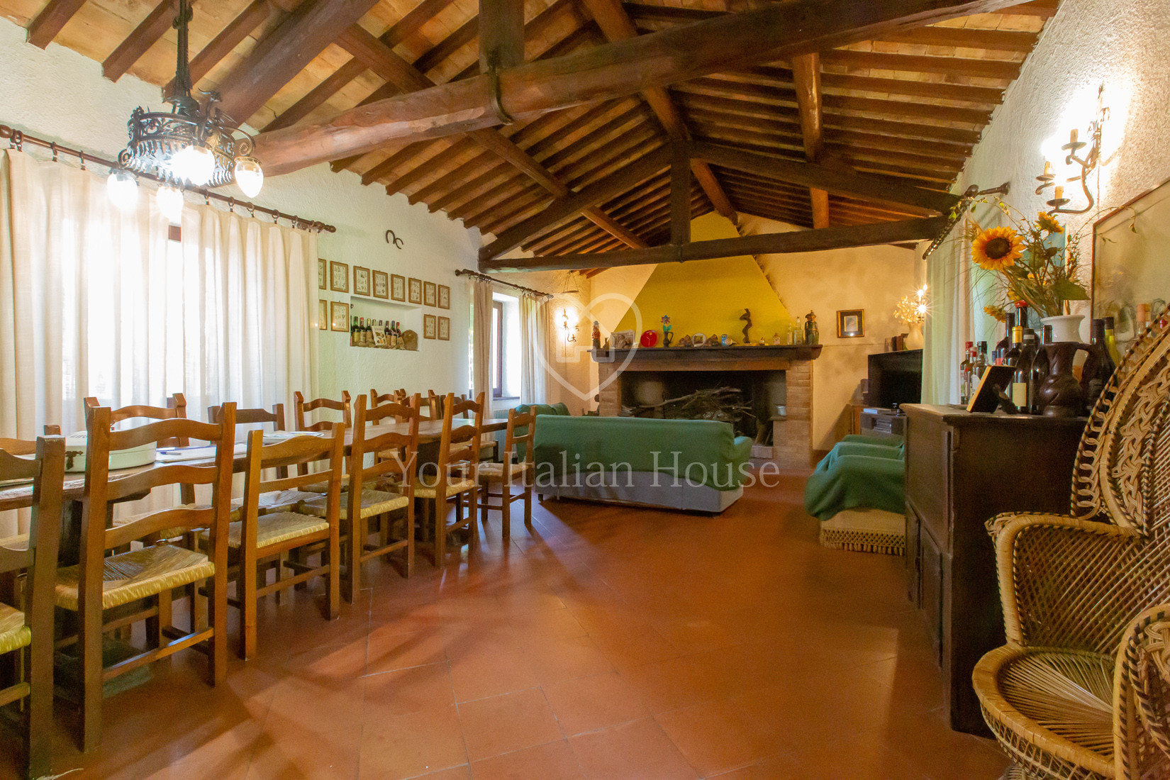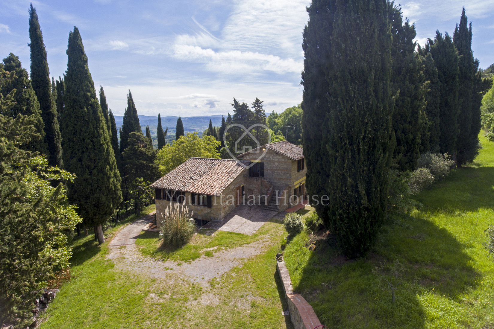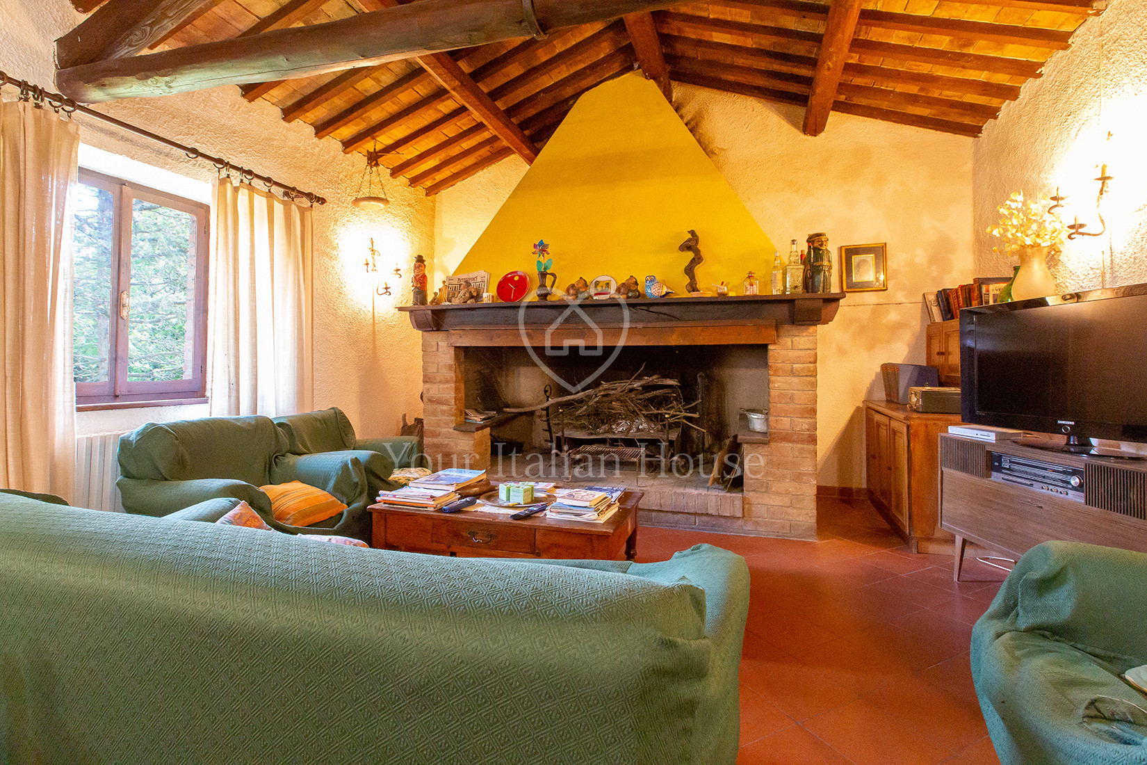 Boerderij/famhouse van 350 m² met portiek, verdeeld over drie niveaus, en omgeven door natuur. Toegankelijk door een goed onderhouden onverharde weg van 800 m. De begane grond omvat een woonkamer, keuken, woonkamer met open haard, drie slaapkamers en drie badkamers. Op de eerste verdieping, bereikbaar via een wenteltrap, is er nog een slaapkamer. Op de semi-ondergrondse verdieping bevinden zich een grote woonkamer met keuken - momenteel in gebruik als berging, een slaapkamer en een badkamer. Bij het verlaten van de woonkamer staat een geweldige pergola met uitzicht op het meer van Trasimeno. Het pand is gelegen op 12 ha grond. Deze bestaat uit: 3 ha olijfgaard – ca. 400 bomen, 2.3 ha bos, 5.5 ha akkerbouw en 0.6 ha graasland. Er is een binnenplaats van ongeveer 1.500 m².