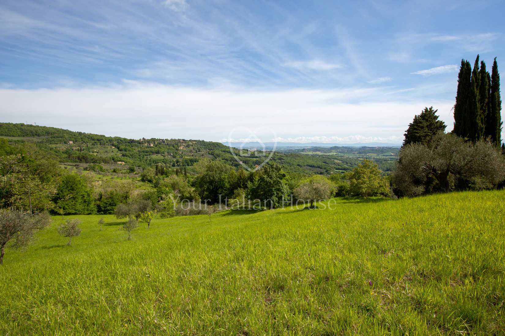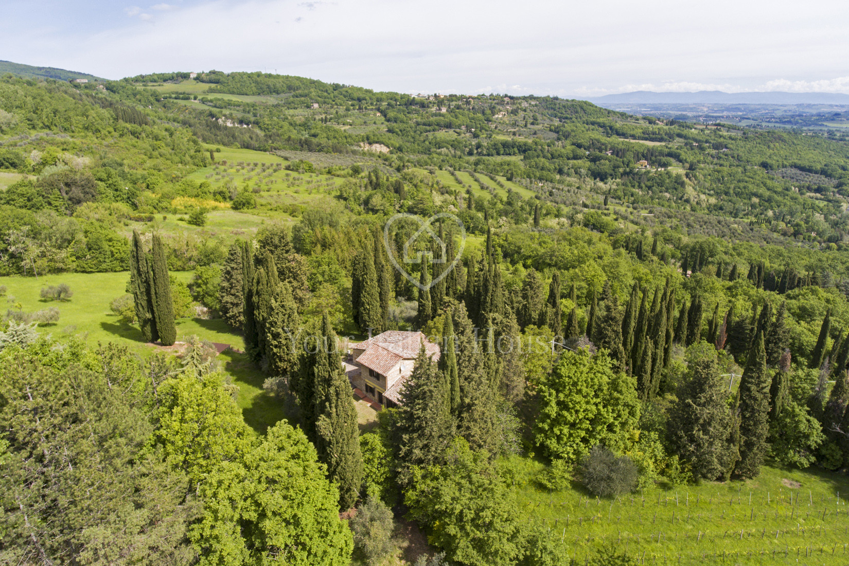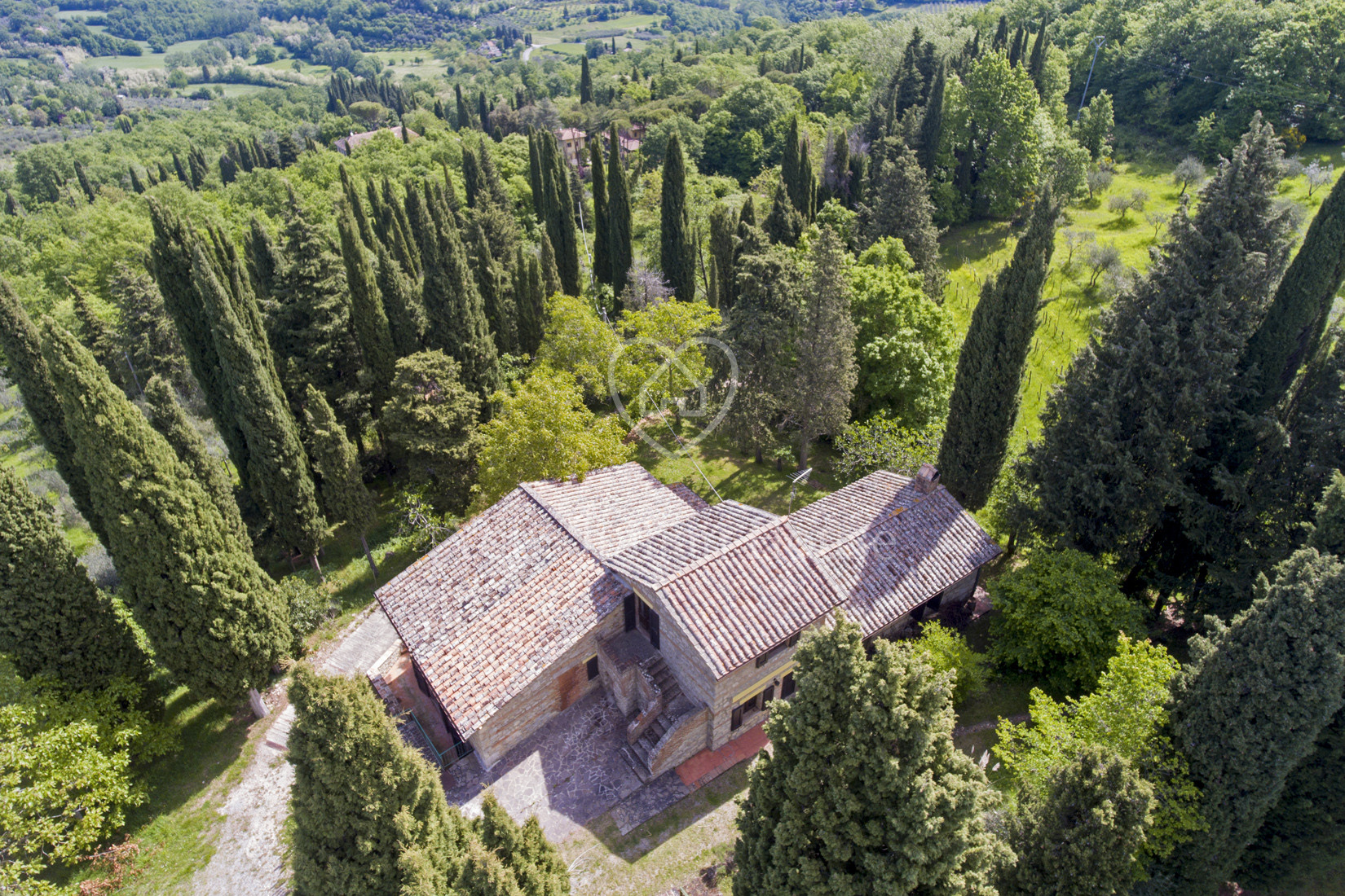 Boerderij/famhouse van 350 m² met portiek, verdeeld over drie niveaus, en omgeven door natuur. Toegankelijk door een goed onderhouden onverharde weg van 800 m. De begane grond omvat een woonkamer, keuken, woonkamer met open haard, drie slaapkamers en drie badkamers. Op de eerste verdieping, bereikbaar via een wenteltrap, is er nog een slaapkamer. Op de semi-ondergrondse verdieping bevinden zich een grote woonkamer met keuken - momenteel in gebruik als berging, een slaapkamer en een badkamer. Bij het verlaten van de woonkamer staat een geweldige pergola met uitzicht op het meer van Trasimeno. Het pand is gelegen op 12 ha grond. Deze bestaat uit: 3 ha olijfgaard – ca. 400 bomen, 2.3 ha bos, 5.5 ha akkerbouw en 0.6 ha graasland. Er is een binnenplaats van ongeveer 1.500 m².