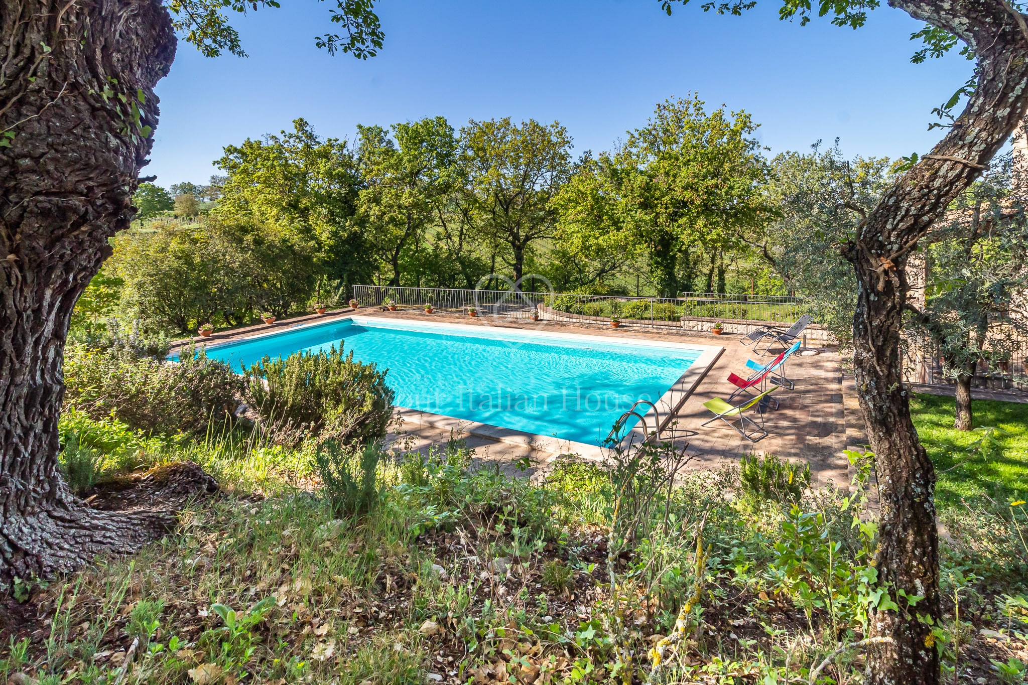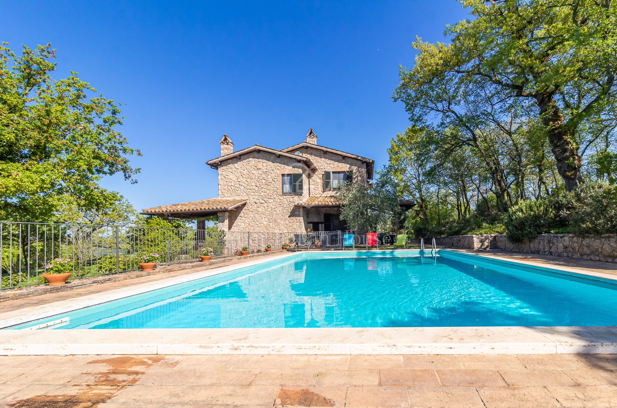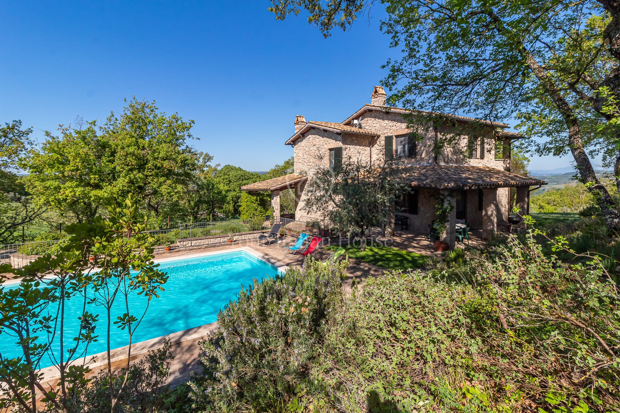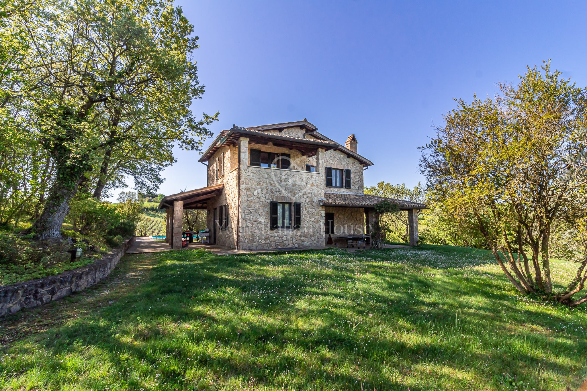 Op een heuvel tussen wijngaarden en bossen, in het groene Umbrië, valt Casale Poggio del Sole op, met zijn stenen gevels en grote arcades die langs de hele omtrek slingeren, zodat je op elk moment van de dag kunt genieten van het prachtige uitzicht en de zon. dag. Gerenoveerd met anti-seismische criteria, is het verdeeld in drie niveaus, voor een totaal van ongeveer 217 vierkante meter. In de kelder bevindt zich de garage met berging, de kelder, een dienstbadkamer en de technische ruimte voor het zwembad. Op de begane grond vinden we de grote woonkamer met zijn prachtige stenen open haard en de ruime keuken die uitkomt op de woonkamer. Er is ook een dienstbadkamer. Via de trap komen we in het slaapgedeelte, bestaande uit drie tweepersoonsslaapkamers en twee badkamers met douche. De boerderij wordt omringd door ongeveer 5.000 vierkante meter volledig omheinde tuin, met olijfbomen, eeuwenoude eiken, een klein bos, fruitbomen zoals appel-, pruimen- en vijgenbomen en grote grasvelden. Onder een van de arcades bevindt zich een stenen barbecue, ideaal om buiten te koken en te eten, genietend van het uitzicht op het zwembad en de omliggende wijngaarden. Het zwembad, op slechts een paar meter van de boerderij, meet 12×6 m en is 1,50 m diep met een chloorsysteem. Het hele solarium rond het zwembad is betegeld met handgemaakte terracotta.