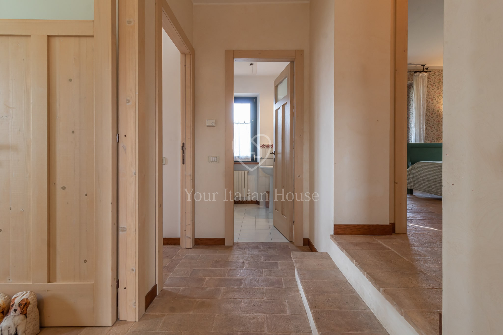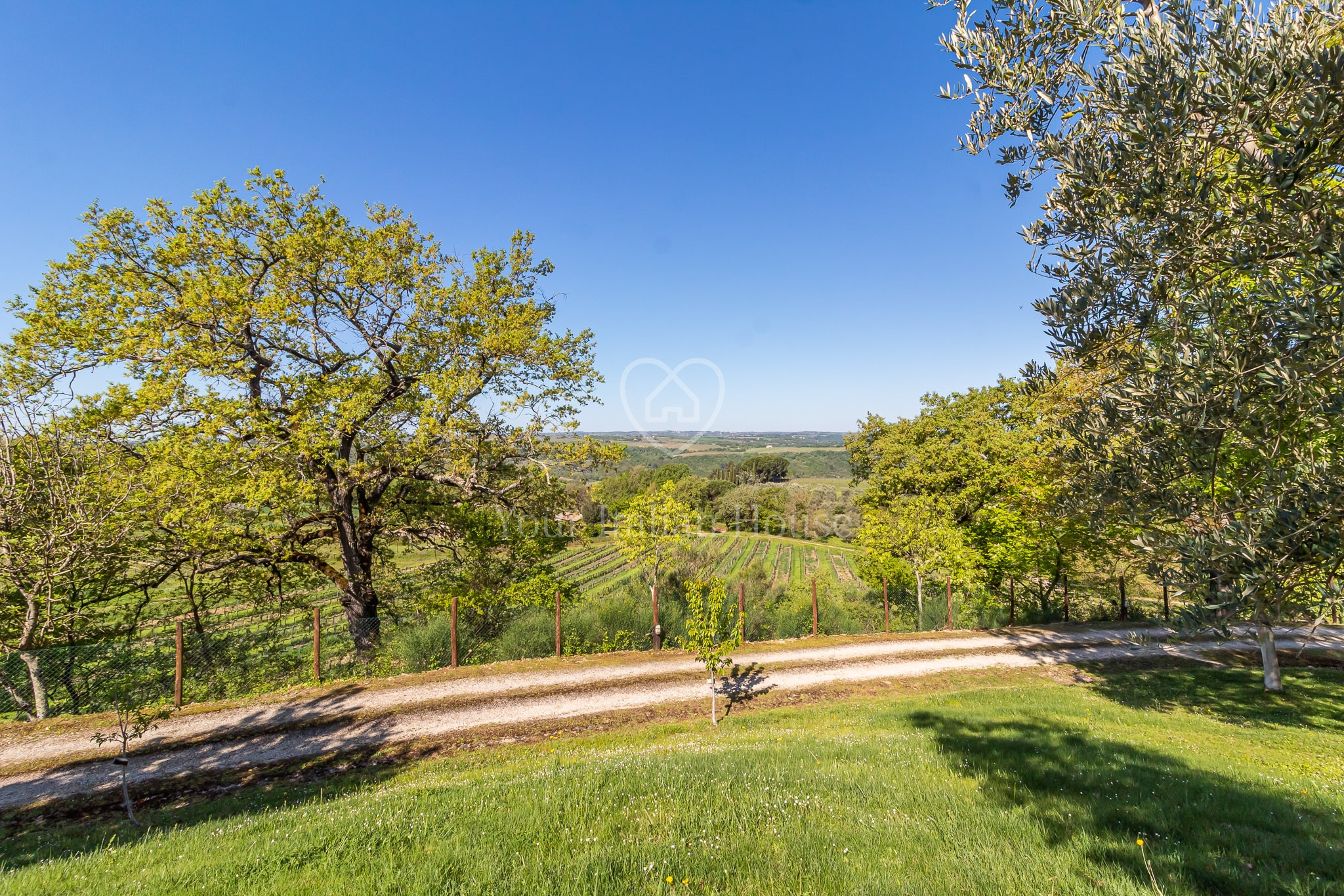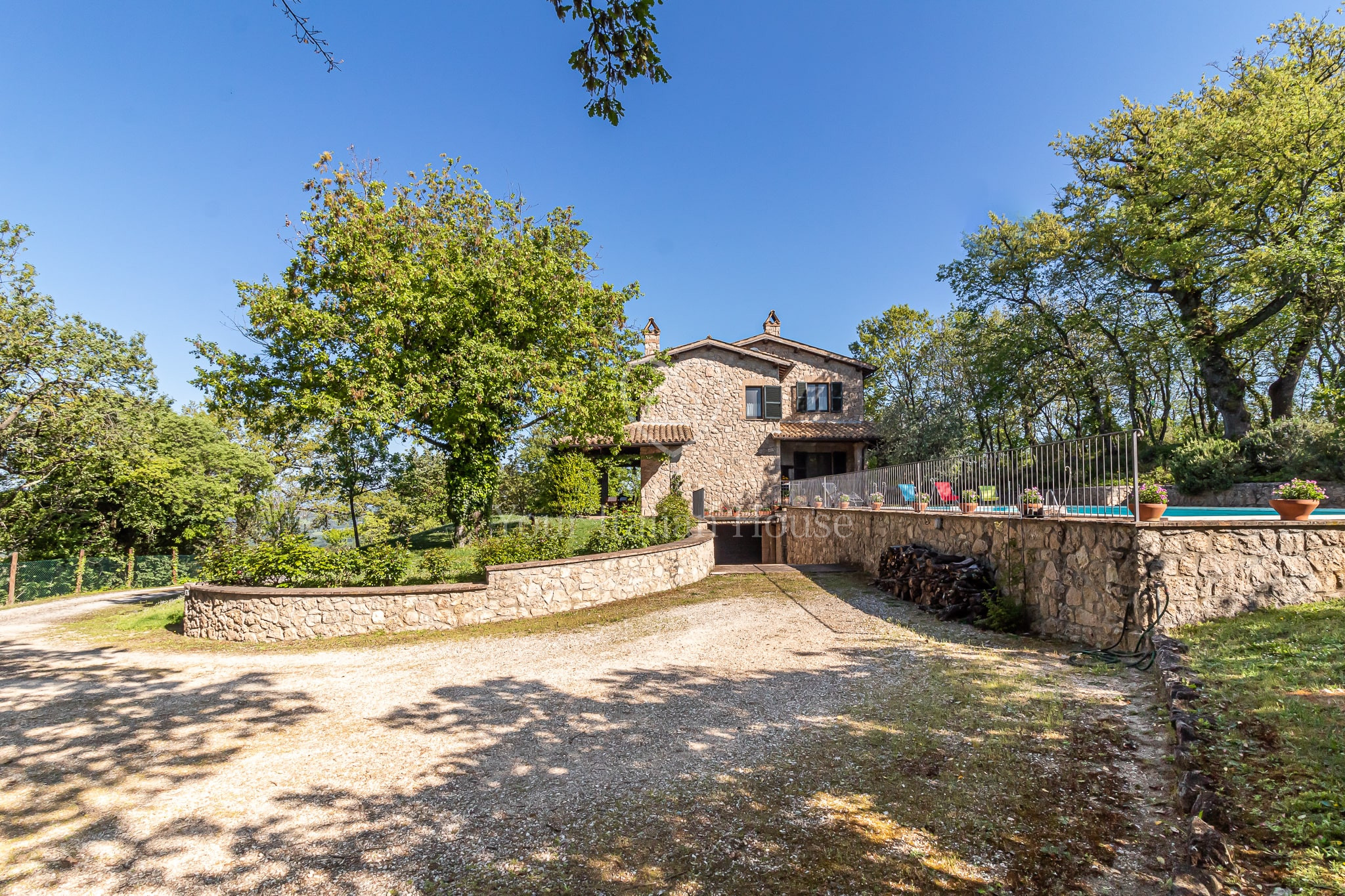 Op een heuvel tussen wijngaarden en bossen, in het groene Umbrië, valt Casale Poggio del Sole op, met zijn stenen gevels en grote arcades die langs de hele omtrek slingeren, zodat je op elk moment van de dag kunt genieten van het prachtige uitzicht en de zon. dag. Gerenoveerd met anti-seismische criteria, is het verdeeld in drie niveaus, voor een totaal van ongeveer 217 vierkante meter. In de kelder bevindt zich de garage met berging, de kelder, een dienstbadkamer en de technische ruimte voor het zwembad. Op de begane grond vinden we de grote woonkamer met zijn prachtige stenen open haard en de ruime keuken die uitkomt op de woonkamer. Er is ook een dienstbadkamer. Via de trap komen we in het slaapgedeelte, bestaande uit drie tweepersoonsslaapkamers en twee badkamers met douche. De boerderij wordt omringd door ongeveer 5.000 vierkante meter volledig omheinde tuin, met olijfbomen, eeuwenoude eiken, een klein bos, fruitbomen zoals appel-, pruimen- en vijgenbomen en grote grasvelden. Onder een van de arcades bevindt zich een stenen barbecue, ideaal om buiten te koken en te eten, genietend van het uitzicht op het zwembad en de omliggende wijngaarden. Het zwembad, op slechts een paar meter van de boerderij, meet 12×6 m en is 1,50 m diep met een chloorsysteem. Het hele solarium rond het zwembad is betegeld met handgemaakte terracotta.