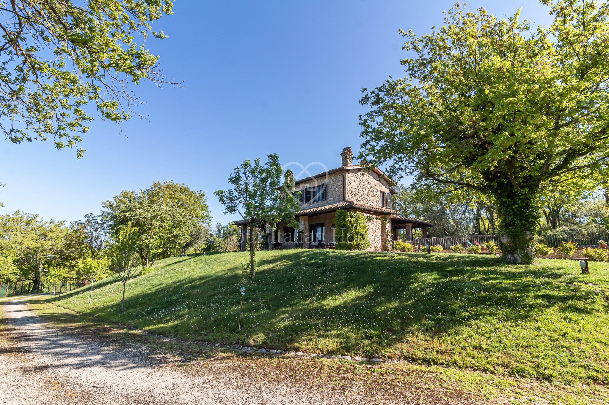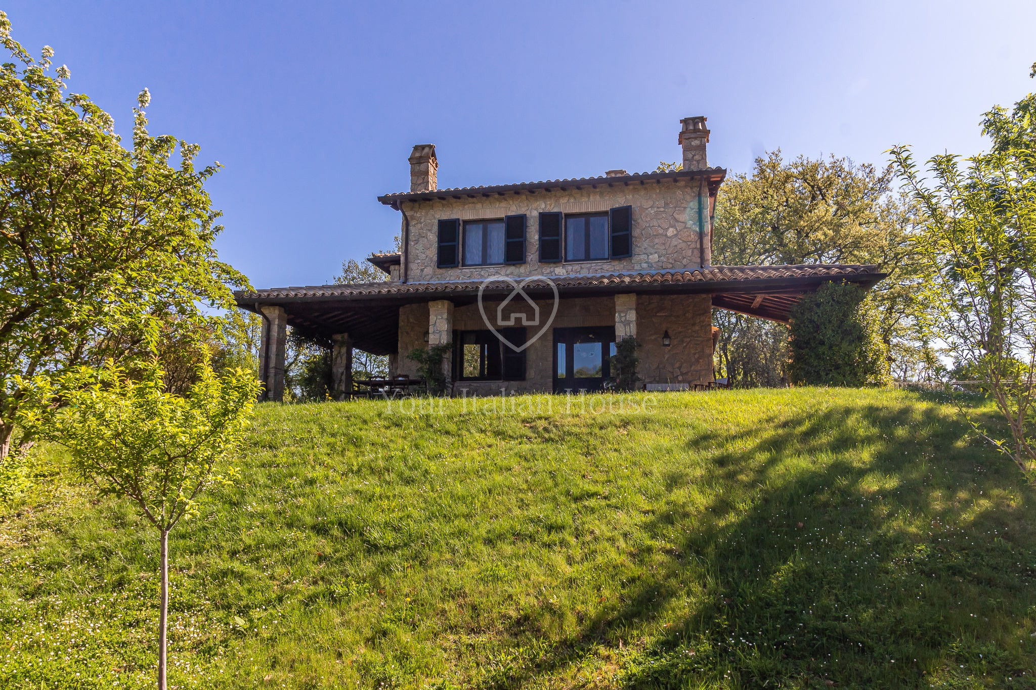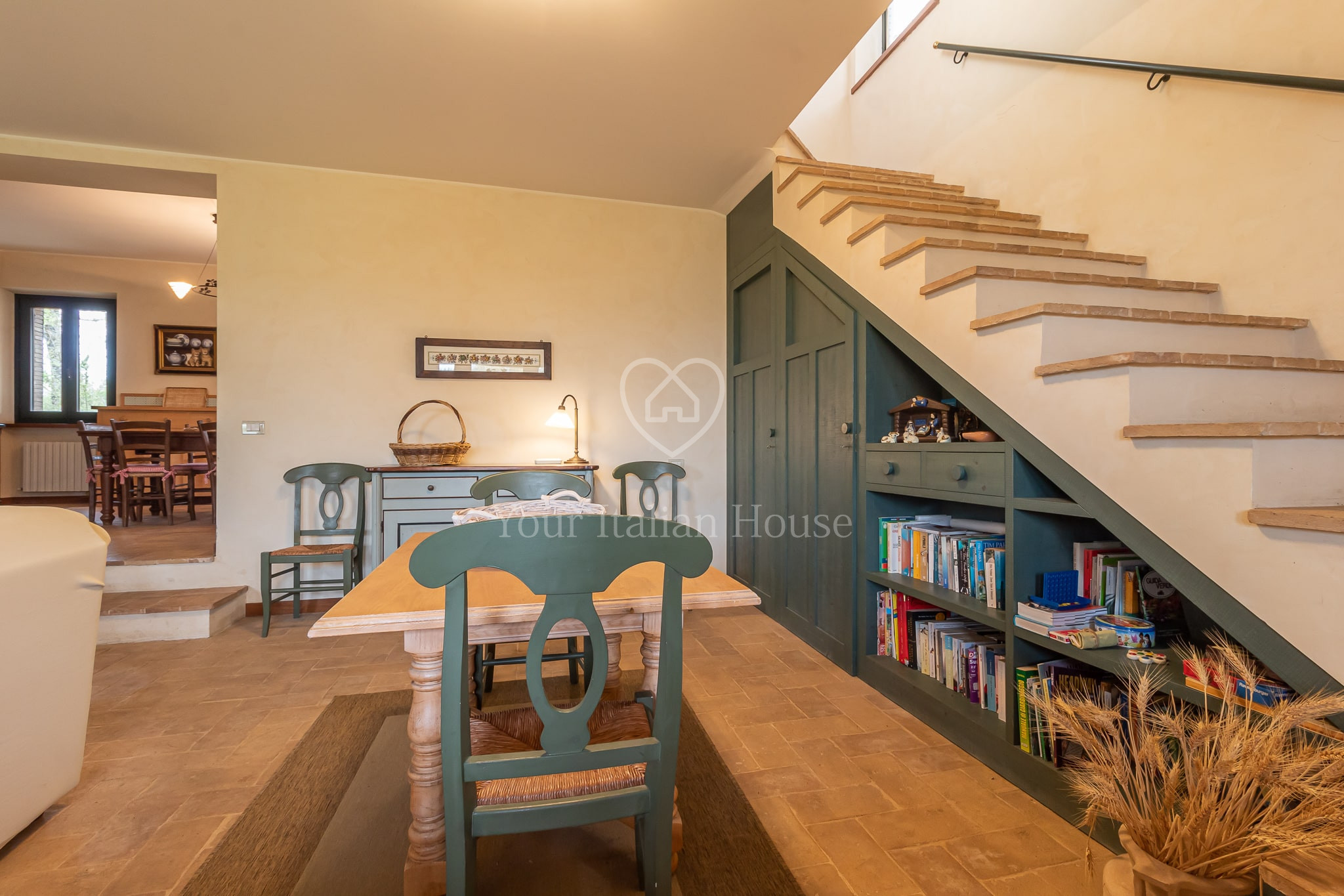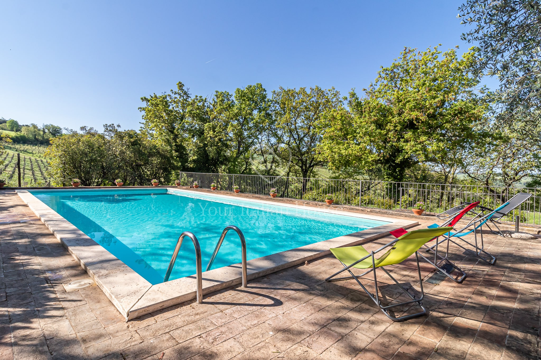 Op een heuvel tussen wijngaarden en bossen, in het groene Umbrië, valt Casale Poggio del Sole op, met zijn stenen gevels en grote arcades die langs de hele omtrek slingeren, zodat je op elk moment van de dag kunt genieten van het prachtige uitzicht en de zon. dag. Gerenoveerd met anti-seismische criteria, is het verdeeld in drie niveaus, voor een totaal van ongeveer 217 vierkante meter. In de kelder bevindt zich de garage met berging, de kelder, een dienstbadkamer en de technische ruimte voor het zwembad. Op de begane grond vinden we de grote woonkamer met zijn prachtige stenen open haard en de ruime keuken die uitkomt op de woonkamer. Er is ook een dienstbadkamer. Via de trap komen we in het slaapgedeelte, bestaande uit drie tweepersoonsslaapkamers en twee badkamers met douche. De boerderij wordt omringd door ongeveer 5.000 vierkante meter volledig omheinde tuin, met olijfbomen, eeuwenoude eiken, een klein bos, fruitbomen zoals appel-, pruimen- en vijgenbomen en grote grasvelden. Onder een van de arcades bevindt zich een stenen barbecue, ideaal om buiten te koken en te eten, genietend van het uitzicht op het zwembad en de omliggende wijngaarden. Het zwembad, op slechts een paar meter van de boerderij, meet 12×6 m en is 1,50 m diep met een chloorsysteem. Het hele solarium rond het zwembad is betegeld met handgemaakte terracotta.