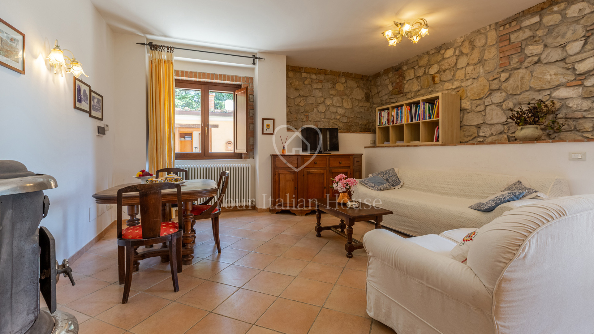 In een klein dorpje op een steenworp afstand van Todi staat deze twee verdiepingen tellende boerderij verdeeld in twee appartementen. Het grootste appartement is verdeeld over twee niveaus: op de begane grond vinden we een woonkamer met een slaapkamer en een badkamer, op de eerste verdieping een open ruimte met kitchenette en eetkamer, een grote woonkamer die ons naar een mooi en ruim terras brengt. Vervolgens vinden we drie slaapkamers en twee badkamers. Het kleine appartement bevindt zich op de begane grond met een grote woonkamer met kitchenette, een slaapkamer en een badkamer. Aan twee kanten van de boerderij bevinden zich bijgebouwen waar zich de technische ruimte, de wasruimte, een kelder en een multifunctionele open ruimte met badkamer bevinden. Op een steenworp afstand staat een oude stal die gerenoveerd moet worden, terwijl er in de tuin een barbecueplaats is. Er is een oud zwembad dat volledig gerenoveerd moet worden. Het object omvat ongeveer 2 hectare grond.