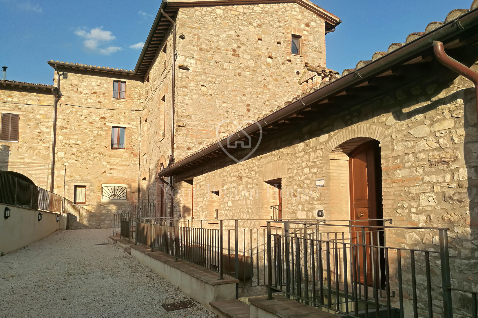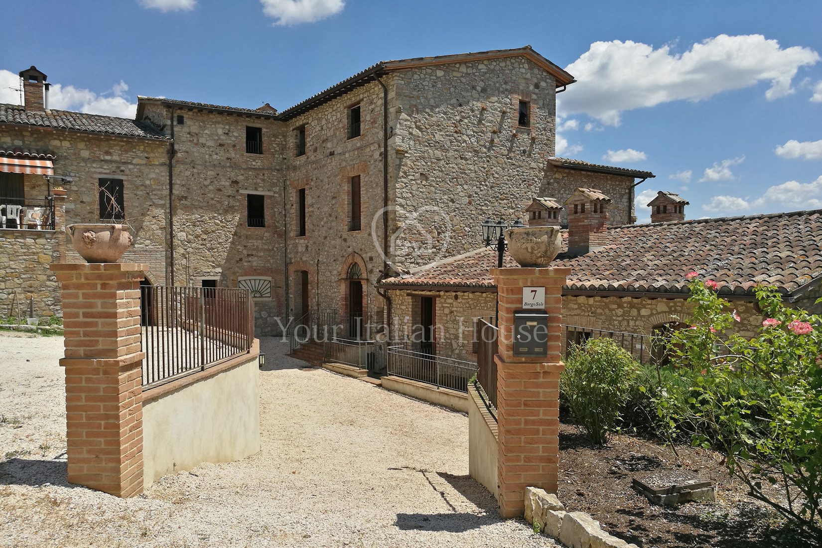 Dit prachtige pand bestaat uit een boerderij van 918 m², een paar jaar geleden volledig gerestaureerd met behoud van de typische kenmerken van de Umbrische landhuizen, en momenteel verdeeld in 10 appartementen van verschillende grootte. Op de eerste verdieping onder de straat bevinden zich 3 appartementen en een gemeenschappelijke ruimte: de appartementen zijn tweekamerappartementen bestaande uit een keuken/woonkamer, slaapkamer en badkamer. Op de tweede verdieping onder de straat zijn er 4 appartementen: een tweekamerunit met woonkamer, slaapkamer en badkamer; 2 driekamerunits met keuken, woonkamer, slaapkamer en badkamer; een driekamerunit met twee slaapkamers, keuken/woongedeelte en een badkamer. Op de eerste verdieping hebben we twee appartementen: een eenkamerunit met slaapkamer en badkamer; een vierkamerunit met woonkamer/keuken, 3 slaapkamers, 2 badkamers. Op de tweede verdieping vinden we een vierkamerappartement met keuken/woonkamer, 3 slaapkamers en 2 badkamers.