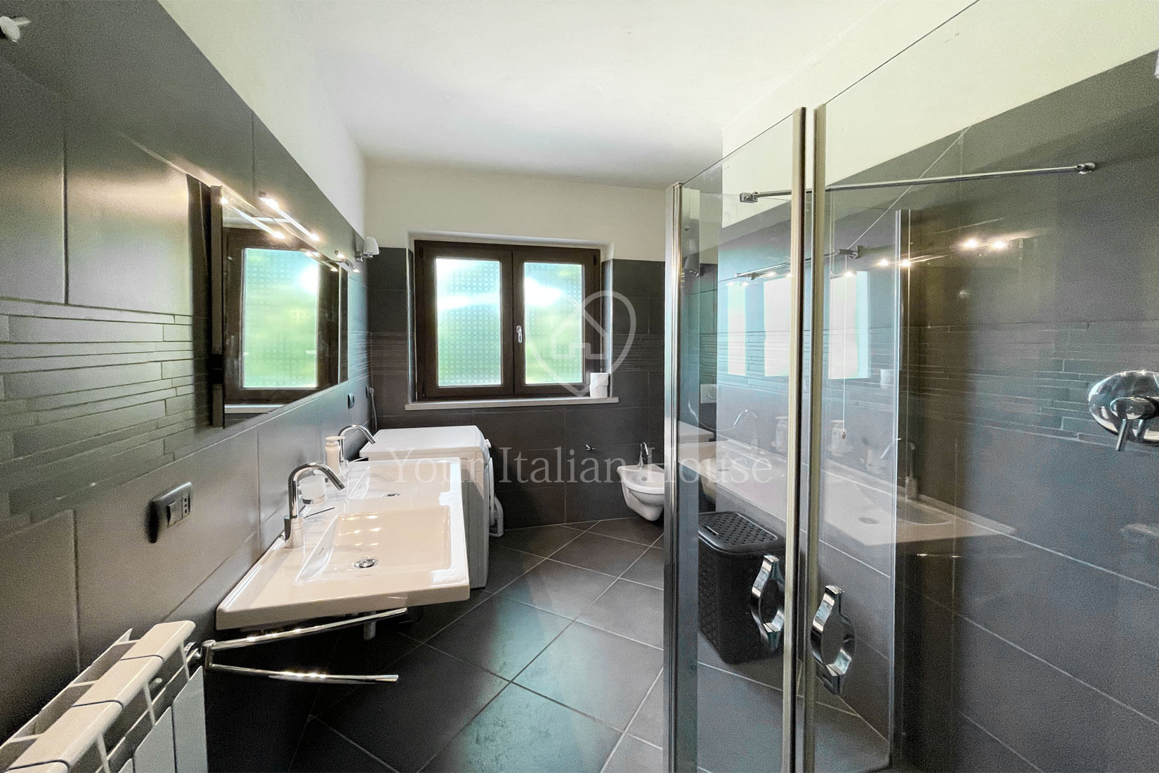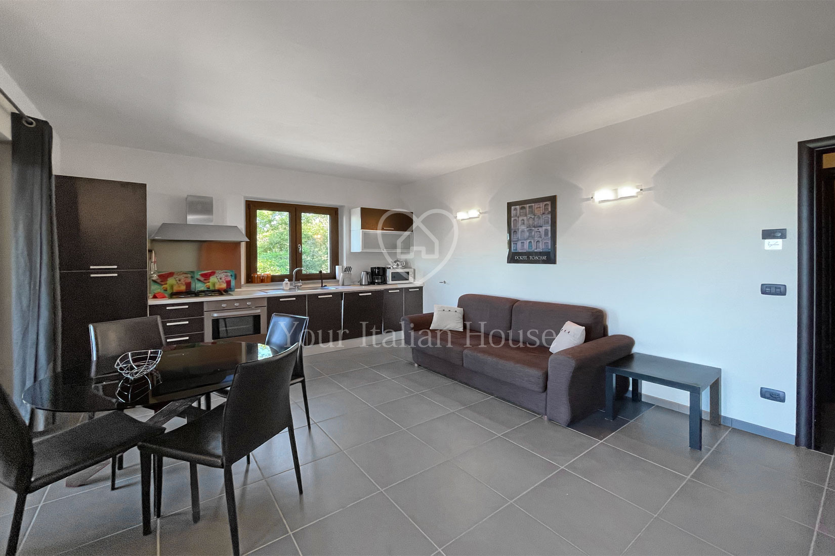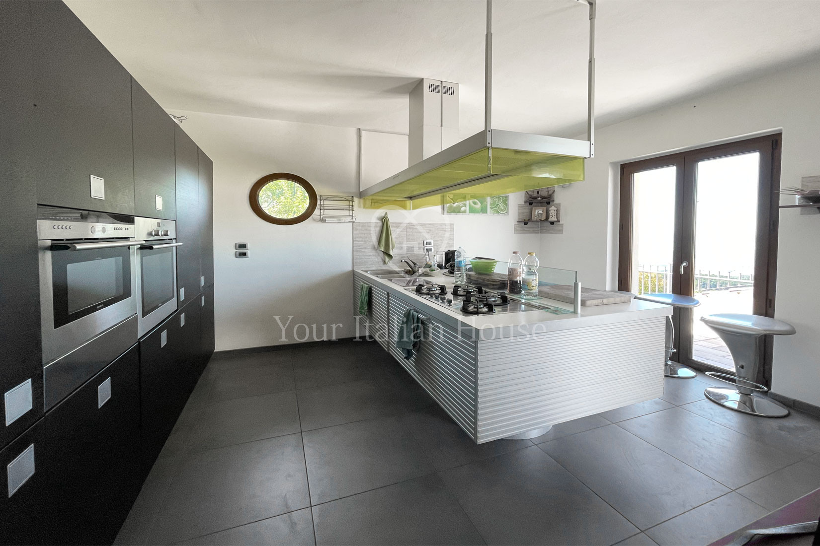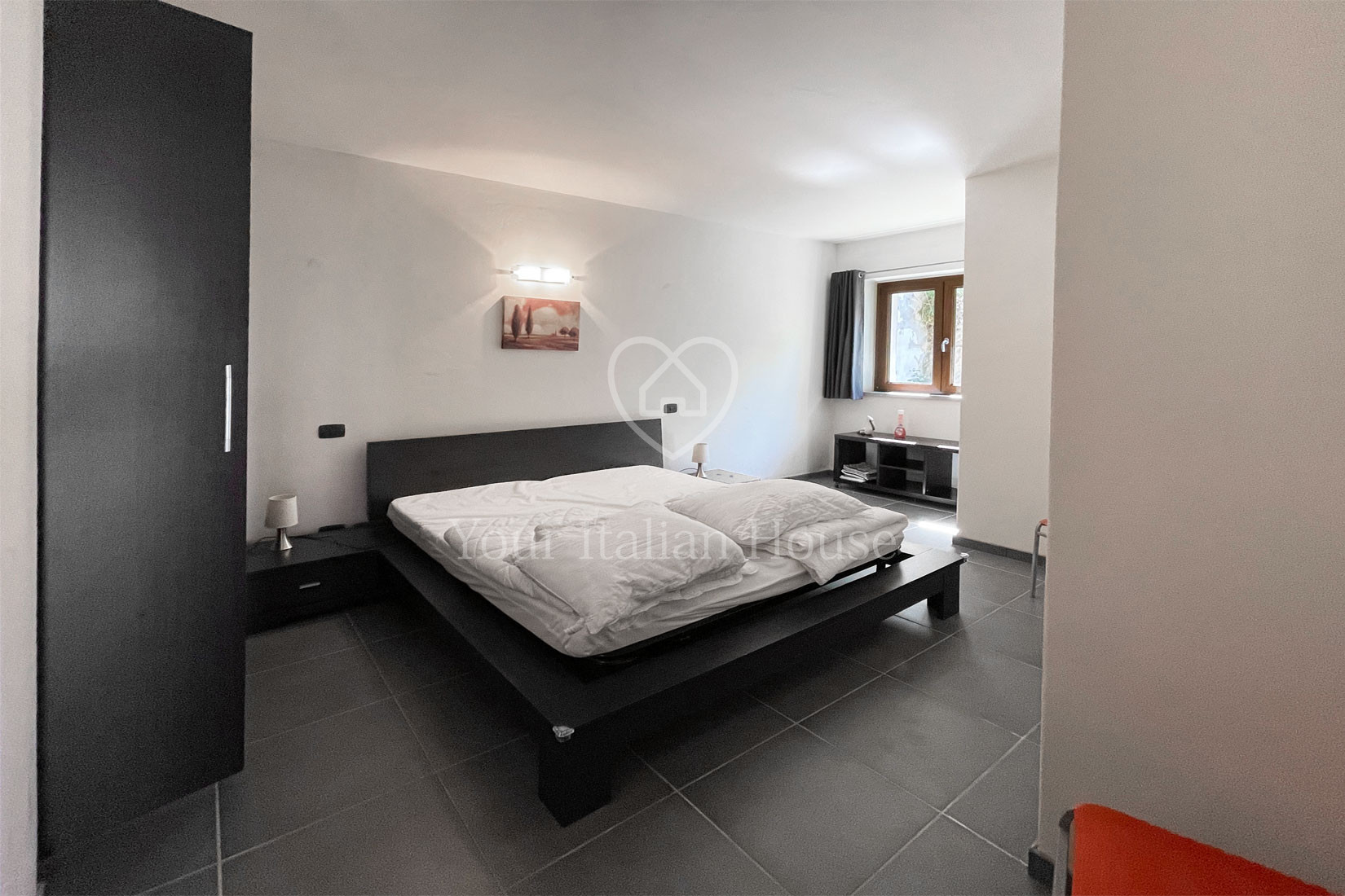 Op de begane grond vinden we het woongedeelte, bestaande uit een hal, keuken, grote en lichte woonkamer met directe toegang tot het panoramische terras met romantisch uitzicht op het meer en het 7x3 zwembad, een service toilet, een slaapkamer met en-suite badkamer en een wasruimte met externe toegang.
