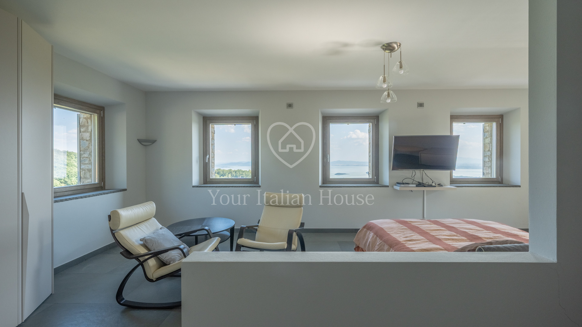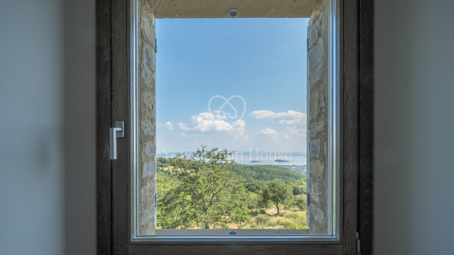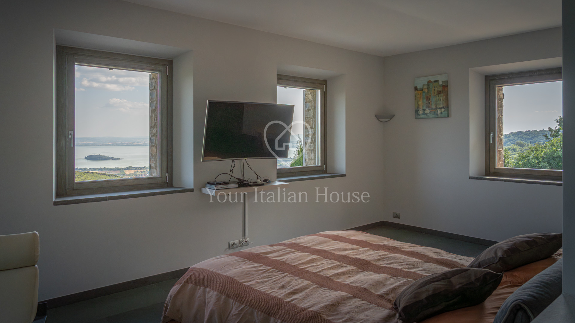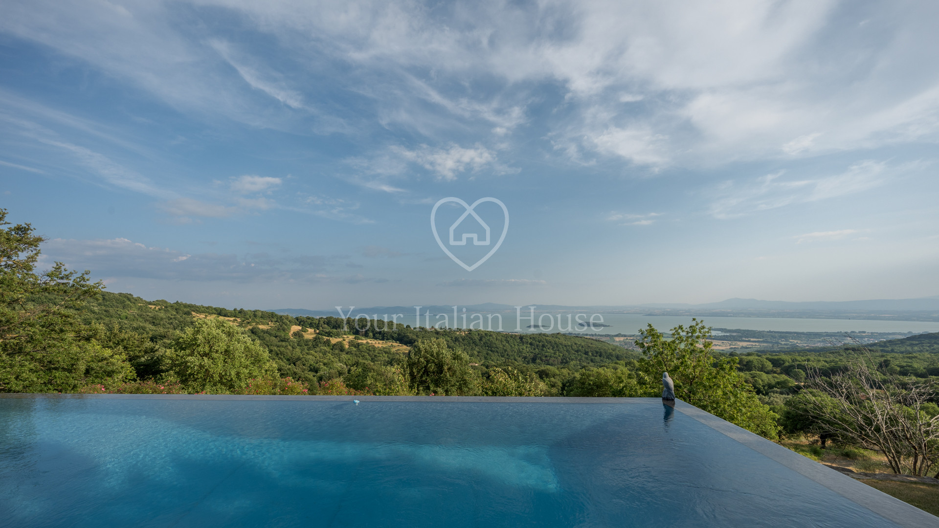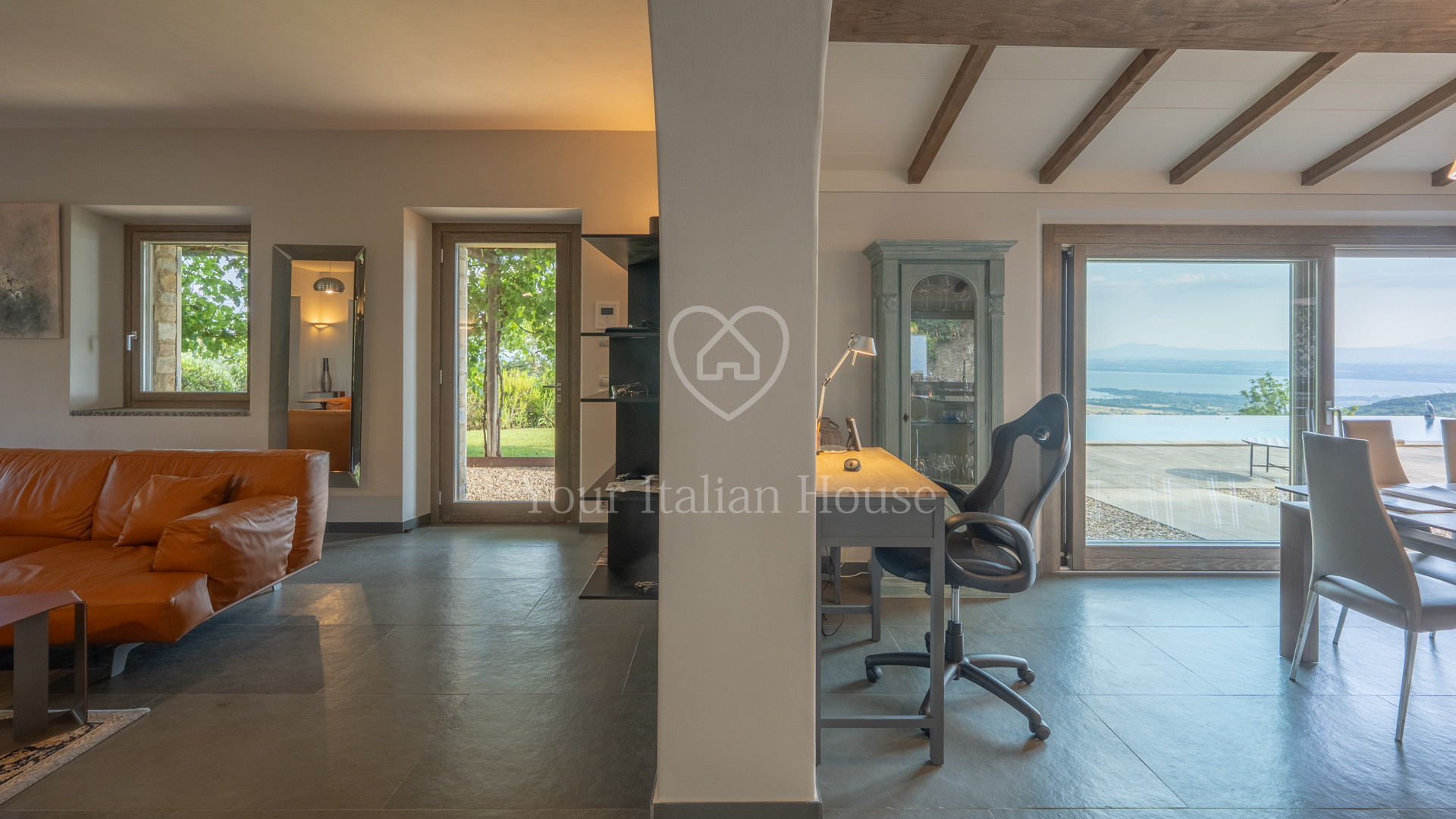 Dit prachtige pand, uniek in zijn soort en volledig gerenoveerd, bevindt zich in een schitterend omheind park van ongeveer 3.700 m² met fruitbomen en olijfbomen. Het hoogtepunt van de buitenruimte is zonder twijfel het verwarmde zwembad van 12 x 5 m, dat maximaal comfort biedt in elk seizoen. Het zwembad heeft een gelijkmatig, randloos oppervlak, wat een visueel spectaculair effect creëert en optimaal uitzicht biedt over het panoramische landschap.Op de begane grond verwelkomt de villa u met een ruime open keuken, waarin functioneel design en innovatie samenkomen. De keuken, uitgerust met hoogwaardige apparatuur en luxe afwerkingen, vormt het hart van het huis, ideaal voor gezellige momenten en culinaire hoogstandjes. Naast de keuken bevindt zich de royale woonkamer, verlicht door grote ramen. Ook op de begane grond bevindt zich een studeerkamer, ideaal voor werk of ontspanning met een goed boek. Twee slaapkamers en een badkamer maken dit niveau compleet en zorgen voor comfort en gebruiksgemak.Boven bieden twee tweepersoonsslaapkamers een privé en verfijnde sfeer, elk met een stijlvol ingerichte en-suite badkamer. Grote ramen bieden een prachtig uitzicht op het Trasimenomeer, en het ruime terras is een ideale plek om het landschap te bewonderen.De kelderverdieping herbergt een zeer ruime garage, ontworpen voor meerdere voertuigen, en biedt extra ruimte voor opslag of andere activiteiten. Deze multifunctionele ruimte is direct vanuit de woning toegankelijk.Kortom, deze villa is meer dan een huis: het is een ware woonervaring, waar modern design en natuurlijke schoonheid perfect samensmelten. De combinatie van elegante interieurs, charmante buitenruimtes en een adembenemend uitzicht op het Trasimenomeer maakt dit pand een unieke kans voor wie op zoek is naar het beste van hedendaags wonen in een exclusieve ambiance.