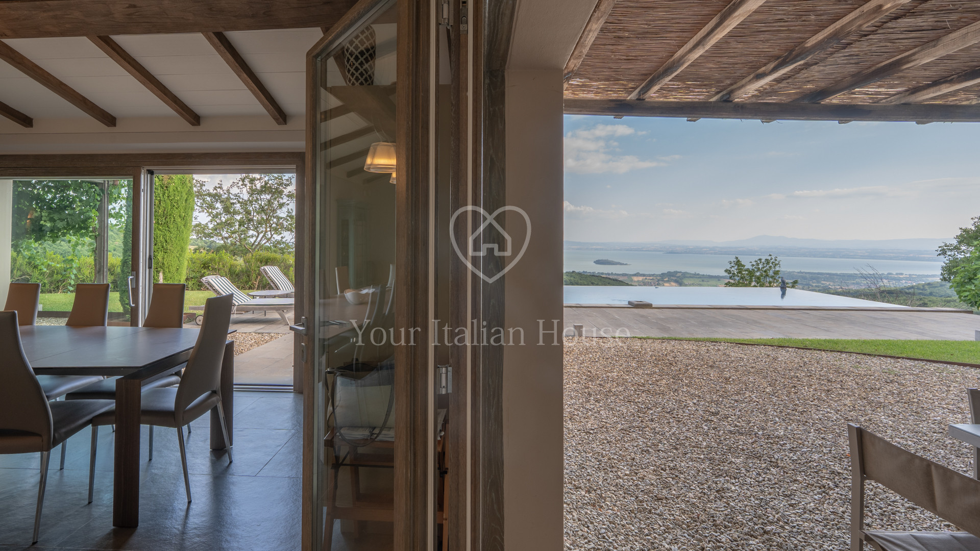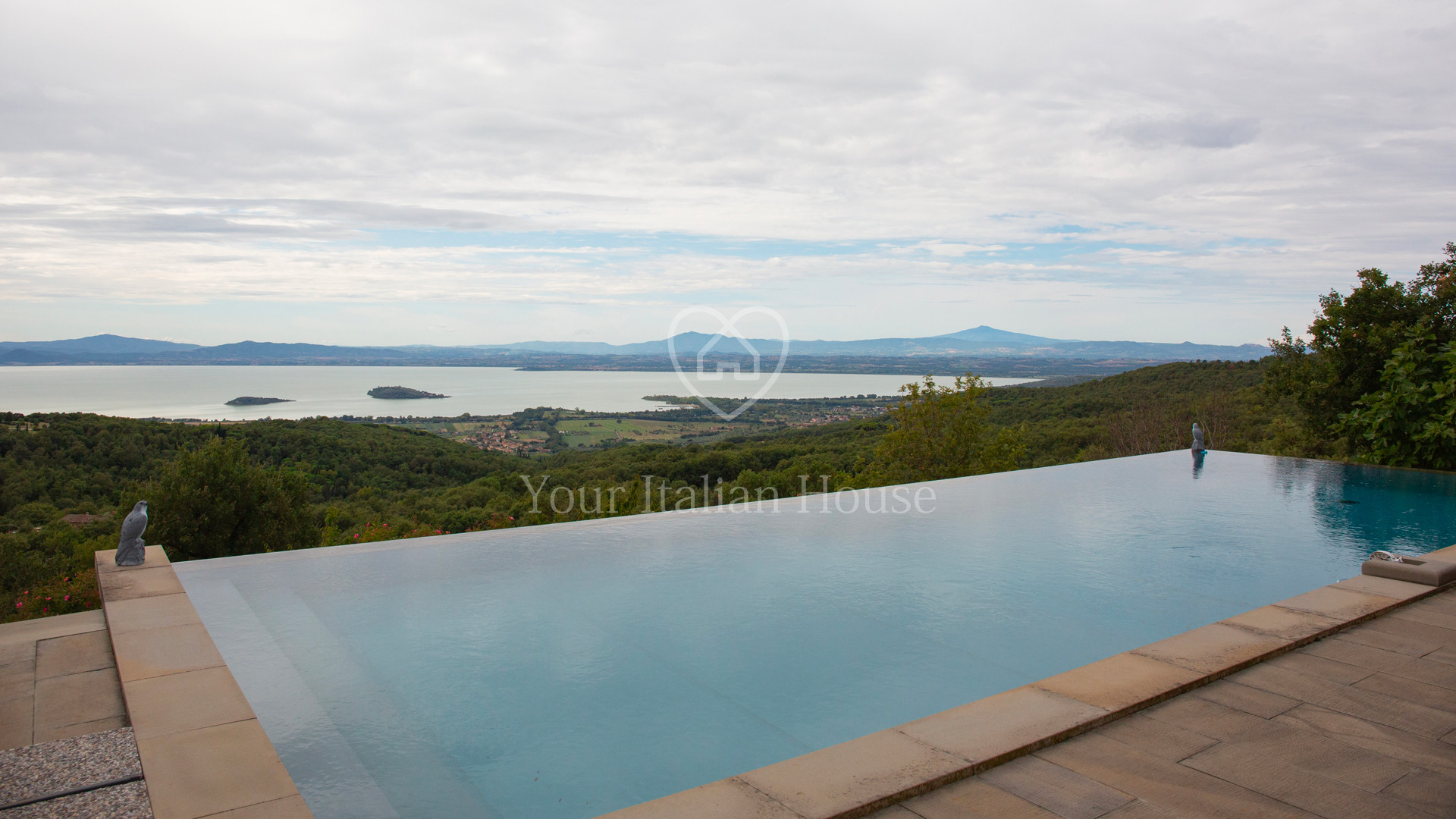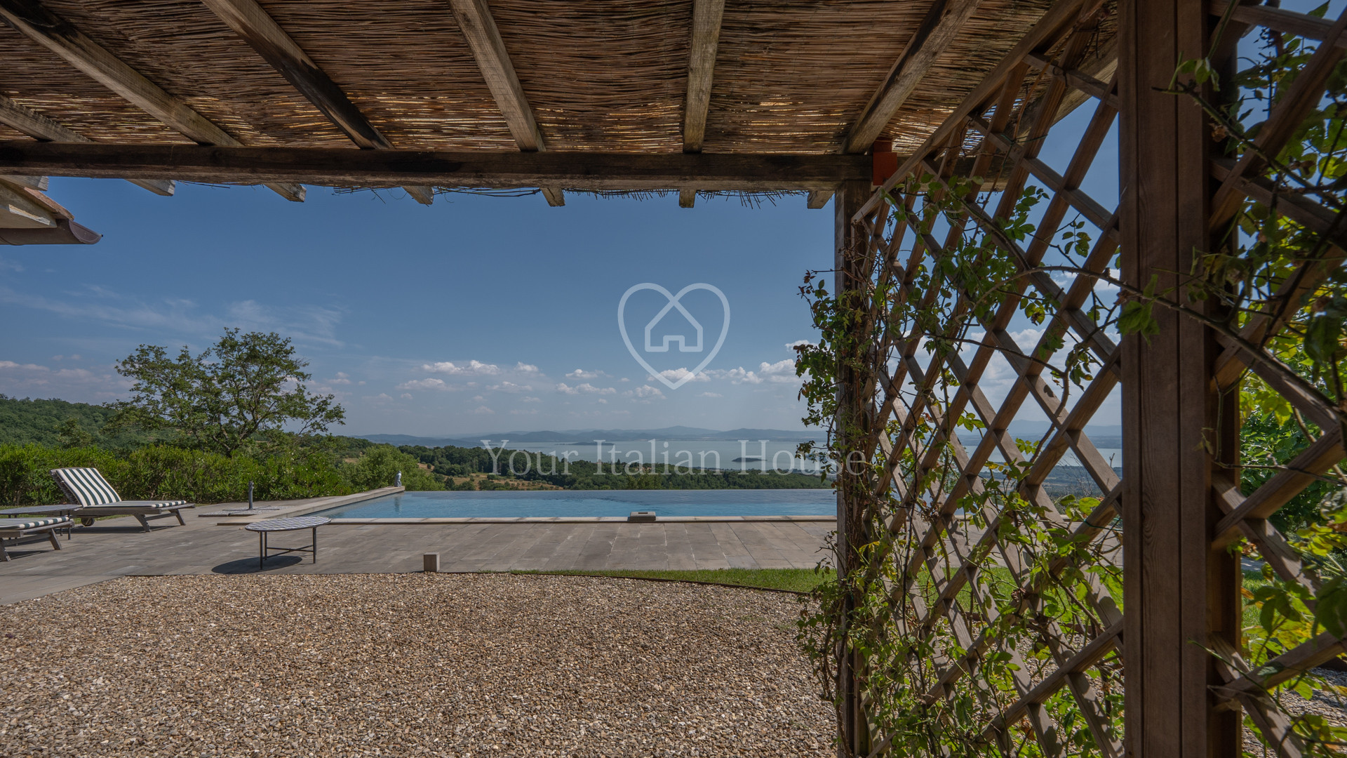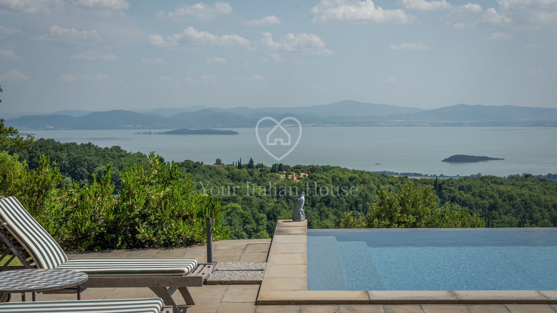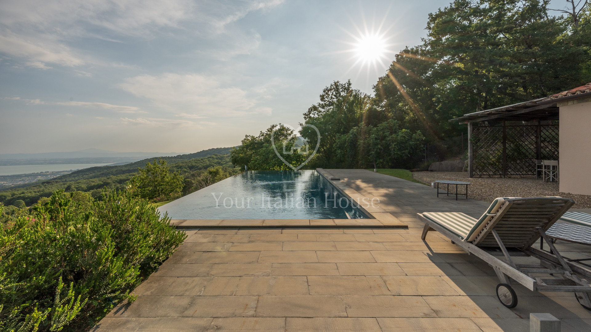 Dit prachtige pand, uniek in zijn soort en volledig gerenoveerd, bevindt zich in een schitterend omheind park van ongeveer 3.700 m² met fruitbomen en olijfbomen. Het hoogtepunt van de buitenruimte is zonder twijfel het verwarmde zwembad van 12 x 5 m, dat maximaal comfort biedt in elk seizoen. Het zwembad heeft een gelijkmatig, randloos oppervlak, wat een visueel spectaculair effect creëert en optimaal uitzicht biedt over het panoramische landschap.Op de begane grond verwelkomt de villa u met een ruime open keuken, waarin functioneel design en innovatie samenkomen. De keuken, uitgerust met hoogwaardige apparatuur en luxe afwerkingen, vormt het hart van het huis, ideaal voor gezellige momenten en culinaire hoogstandjes. Naast de keuken bevindt zich de royale woonkamer, verlicht door grote ramen. Ook op de begane grond bevindt zich een studeerkamer, ideaal voor werk of ontspanning met een goed boek. Twee slaapkamers en een badkamer maken dit niveau compleet en zorgen voor comfort en gebruiksgemak.Boven bieden twee tweepersoonsslaapkamers een privé en verfijnde sfeer, elk met een stijlvol ingerichte en-suite badkamer. Grote ramen bieden een prachtig uitzicht op het Trasimenomeer, en het ruime terras is een ideale plek om het landschap te bewonderen.De kelderverdieping herbergt een zeer ruime garage, ontworpen voor meerdere voertuigen, en biedt extra ruimte voor opslag of andere activiteiten. Deze multifunctionele ruimte is direct vanuit de woning toegankelijk.Kortom, deze villa is meer dan een huis: het is een ware woonervaring, waar modern design en natuurlijke schoonheid perfect samensmelten. De combinatie van elegante interieurs, charmante buitenruimtes en een adembenemend uitzicht op het Trasimenomeer maakt dit pand een unieke kans voor wie op zoek is naar het beste van hedendaags wonen in een exclusieve ambiance.
