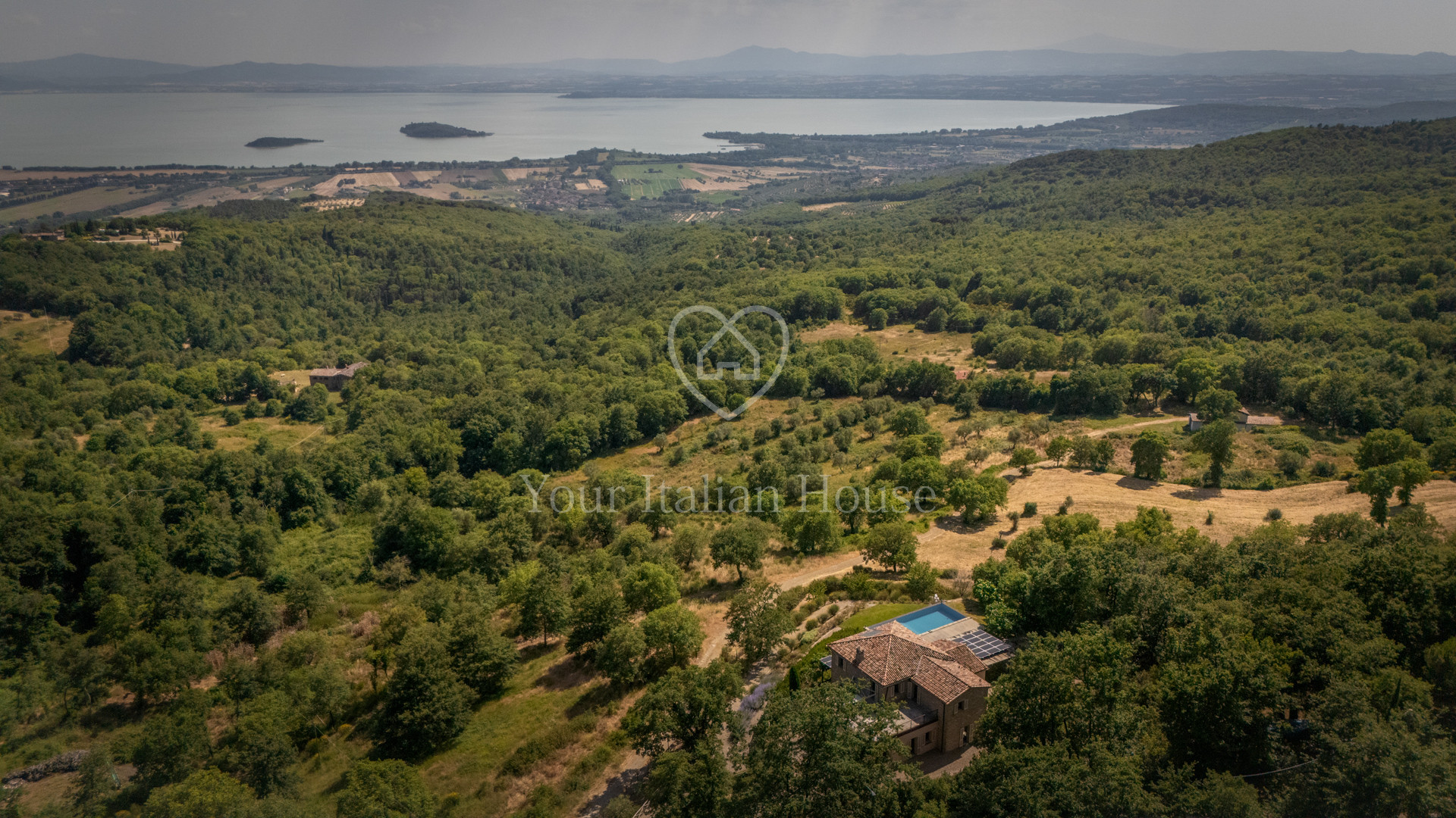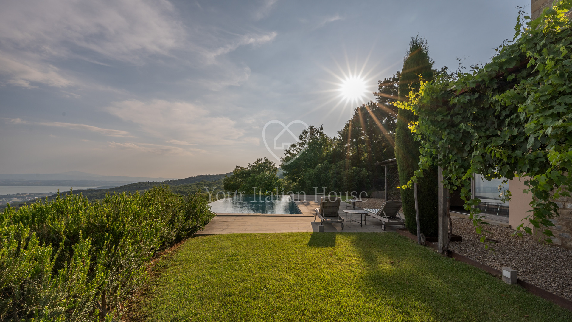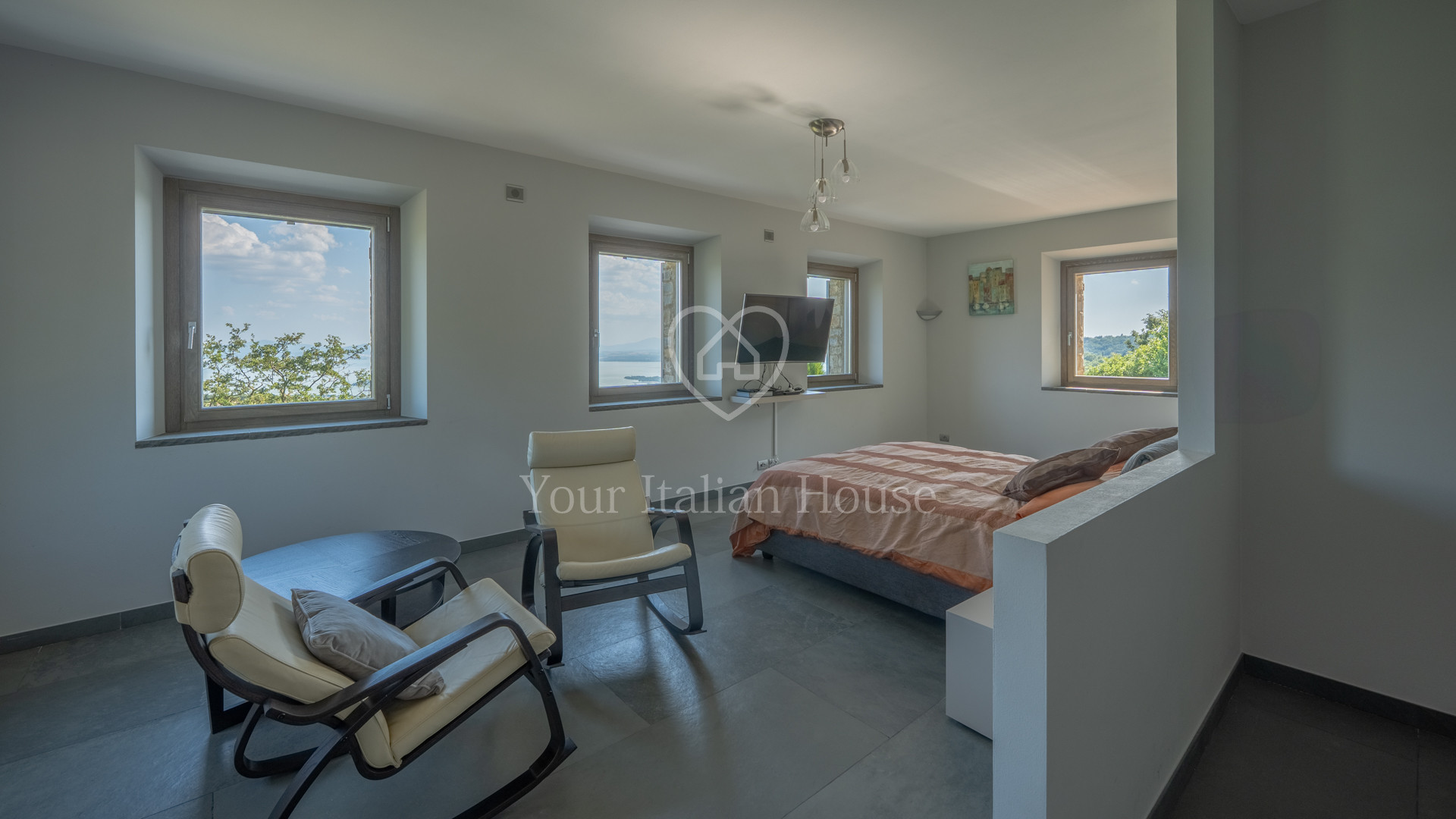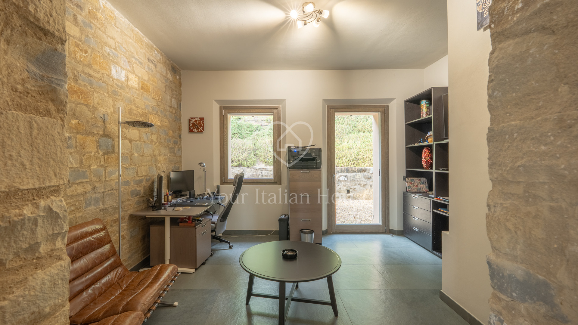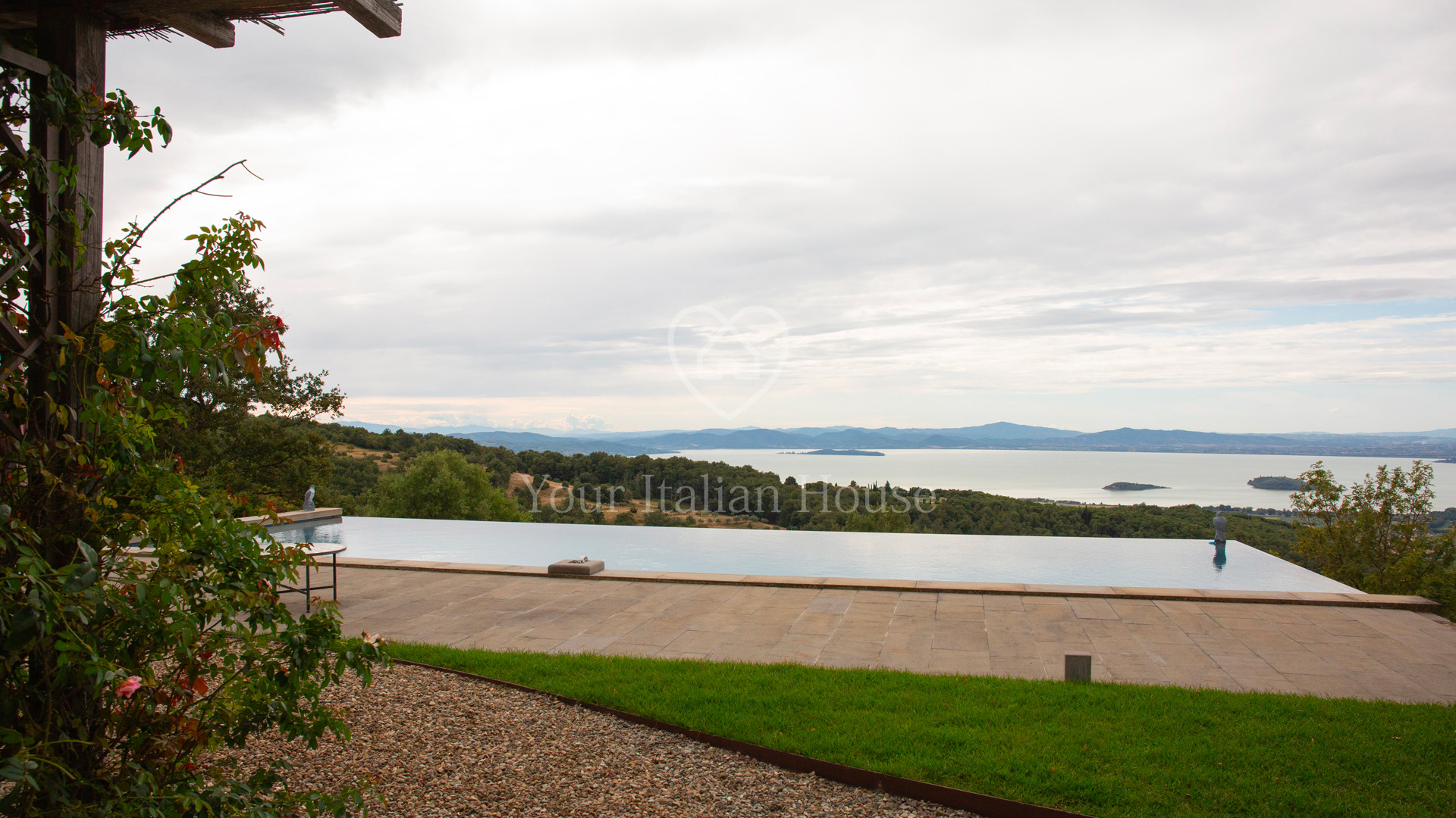Dit prachtige pand, uniek in zijn soort en volledig gerenoveerd, bevindt zich in een schitterend omheind park van ongeveer 3.700 m² met fruitbomen en olijfbomen. Het hoogtepunt van de buitenruimte is zonder twijfel het verwarmde zwembad van 12 x 5 m, dat maximaal comfort biedt in elk seizoen. Het zwembad heeft een gelijkmatig, randloos oppervlak, wat een visueel spectaculair effect creëert en optimaal uitzicht biedt over het panoramische landschap.Op de begane grond verwelkomt de villa u met een ruime open keuken, waarin functioneel design en innovatie samenkomen. De keuken, uitgerust met hoogwaardige apparatuur en luxe afwerkingen, vormt het hart van het huis, ideaal voor gezellige momenten en culinaire hoogstandjes. Naast de keuken bevindt zich de royale woonkamer, verlicht door grote ramen. Ook op de begane grond bevindt zich een studeerkamer, ideaal voor werk of ontspanning met een goed boek. Twee slaapkamers en een badkamer maken dit niveau compleet en zorgen voor comfort en gebruiksgemak.Boven bieden twee tweepersoonsslaapkamers een privé en verfijnde sfeer, elk met een stijlvol ingerichte en-suite badkamer. Grote ramen bieden een prachtig uitzicht op het Trasimenomeer, en het ruime terras is een ideale plek om het landschap te bewonderen.De kelderverdieping herbergt een zeer ruime garage, ontworpen voor meerdere voertuigen, en biedt extra ruimte voor opslag of andere activiteiten. Deze multifunctionele ruimte is direct vanuit de woning toegankelijk.Kortom, deze villa is meer dan een huis: het is een ware woonervaring, waar modern design en natuurlijke schoonheid perfect samensmelten. De combinatie van elegante interieurs, charmante buitenruimtes en een adembenemend uitzicht op het Trasimenomeer maakt dit pand een unieke kans voor wie op zoek is naar het beste van hedendaags wonen in een exclusieve ambiance.