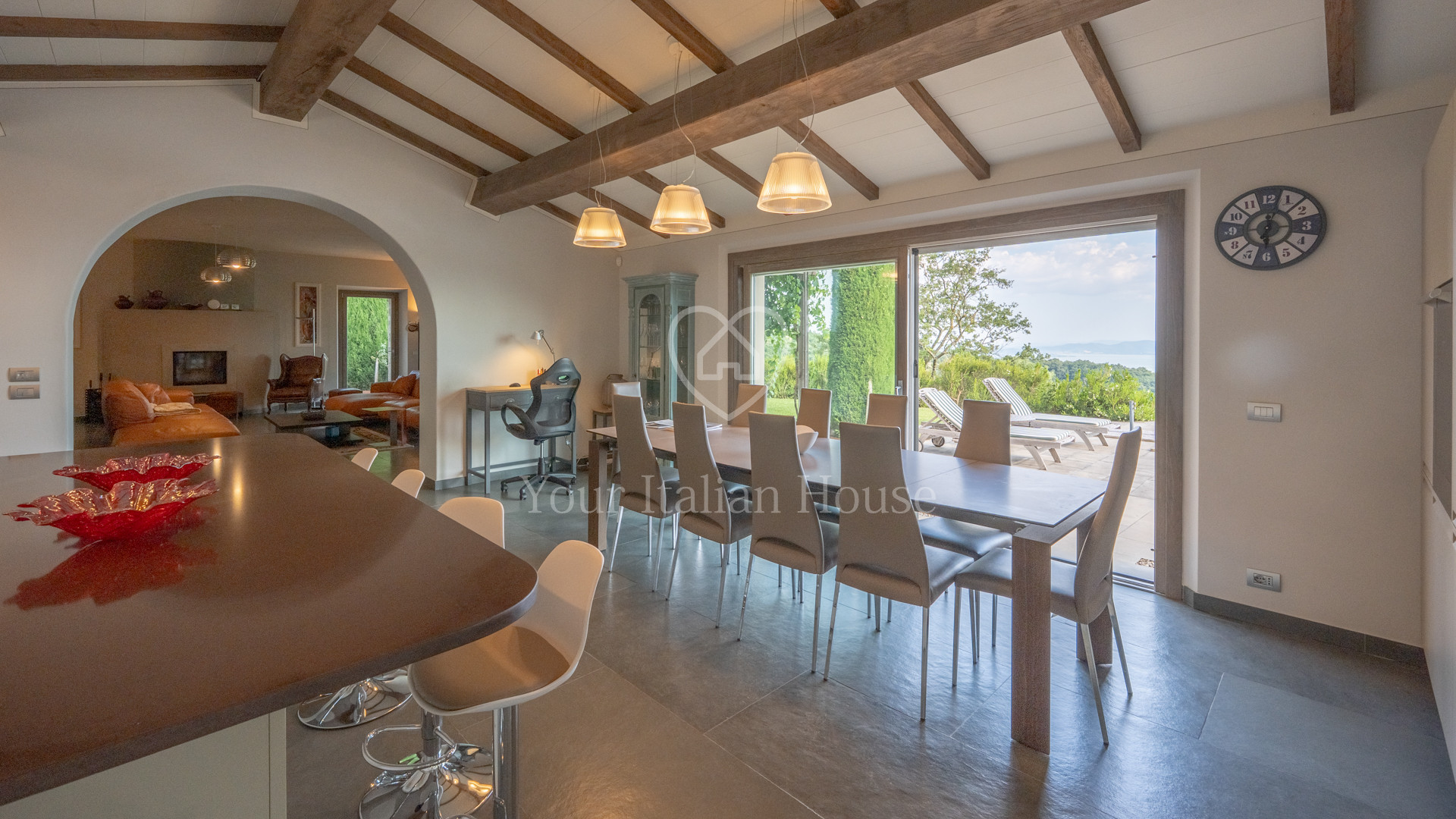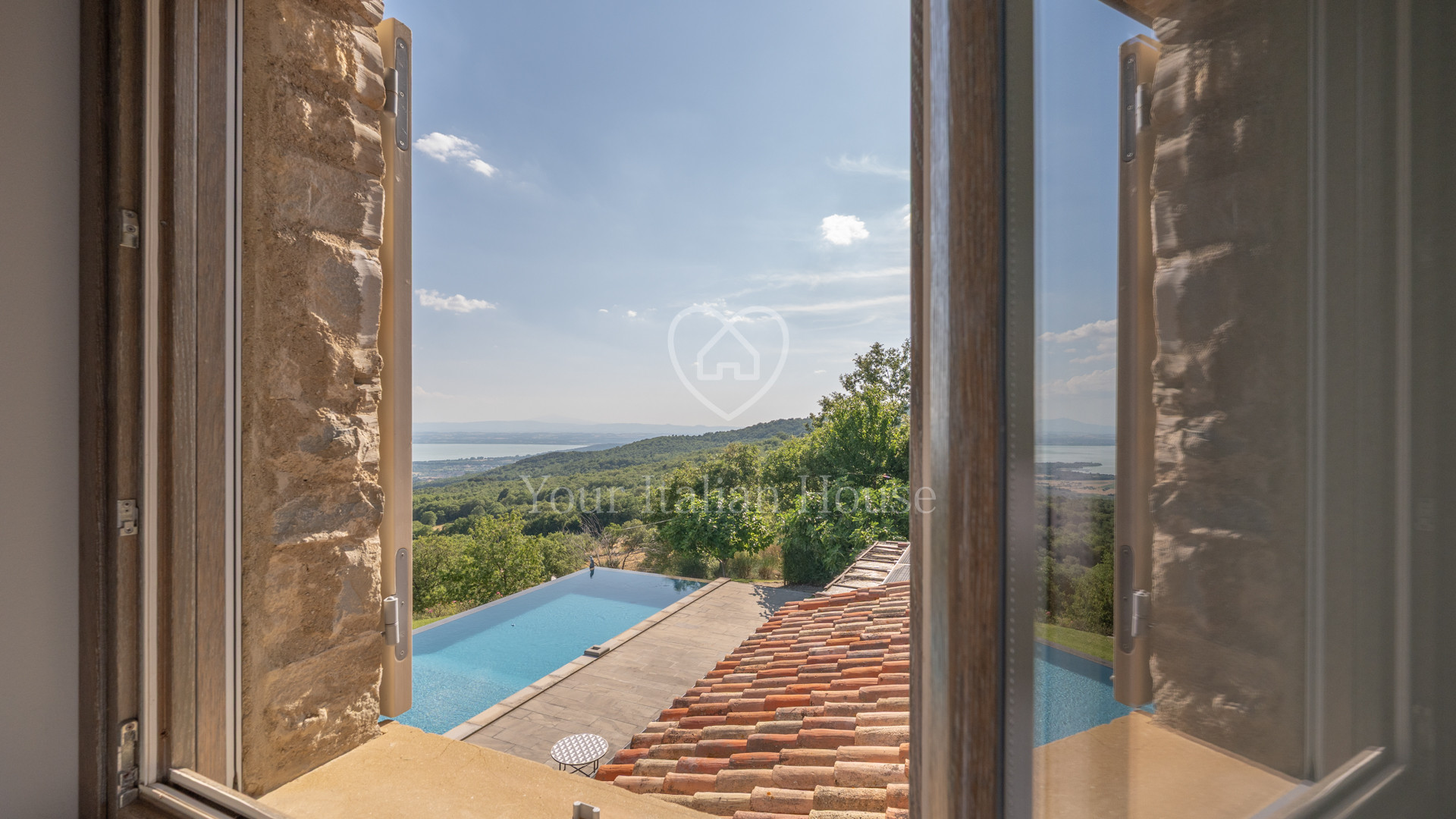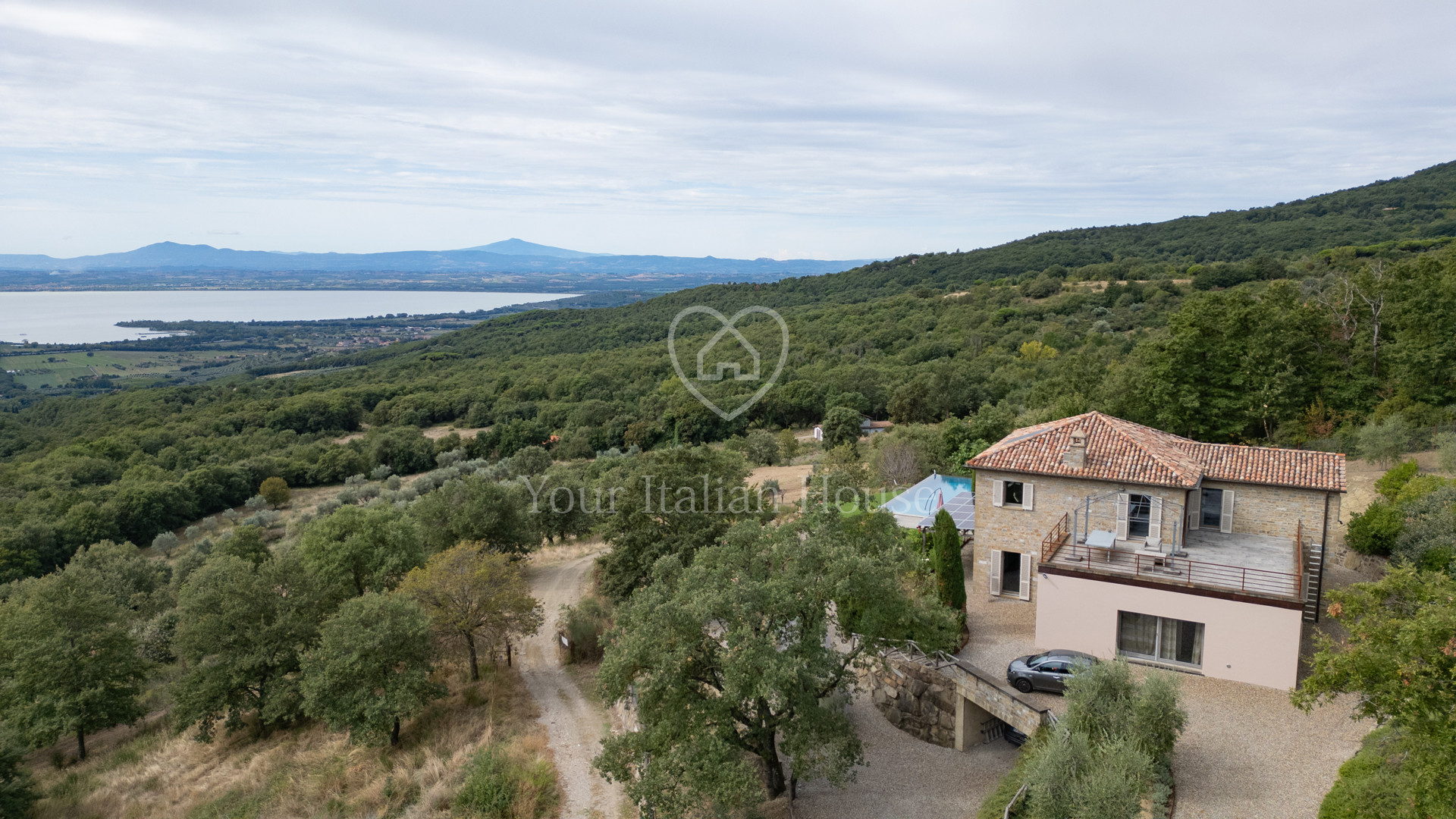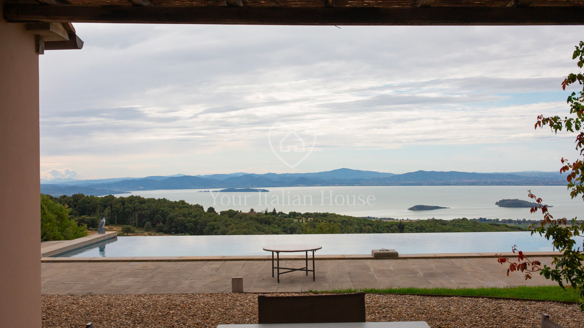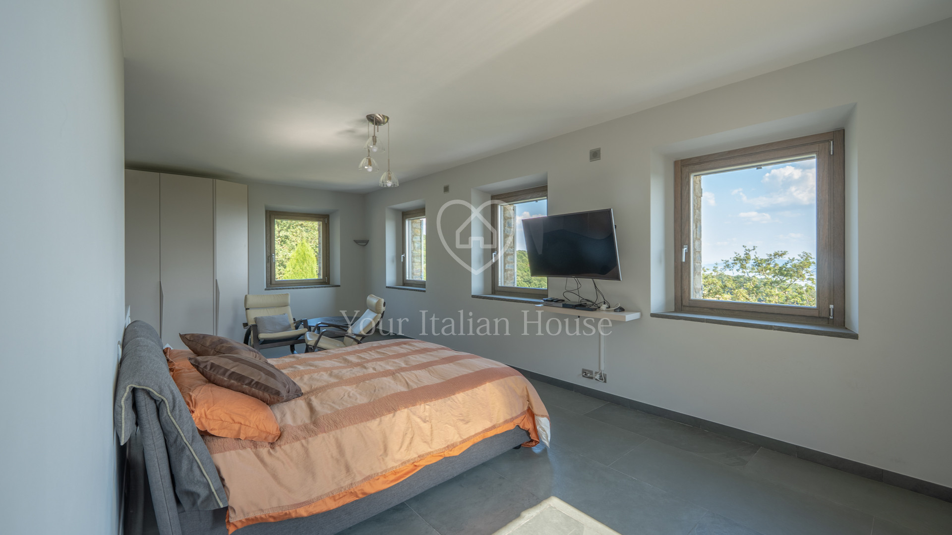 Dit prachtige pand, uniek in zijn soort en volledig gerenoveerd, bevindt zich in een schitterend omheind park van ongeveer 3.700 m² met fruitbomen en olijfbomen. Het hoogtepunt van de buitenruimte is zonder twijfel het verwarmde zwembad van 12 x 5 m, dat maximaal comfort biedt in elk seizoen. Het zwembad heeft een gelijkmatig, randloos oppervlak, wat een visueel spectaculair effect creëert en optimaal uitzicht biedt over het panoramische landschap.Op de begane grond verwelkomt de villa u met een ruime open keuken, waarin functioneel design en innovatie samenkomen. De keuken, uitgerust met hoogwaardige apparatuur en luxe afwerkingen, vormt het hart van het huis, ideaal voor gezellige momenten en culinaire hoogstandjes. Naast de keuken bevindt zich de royale woonkamer, verlicht door grote ramen. Ook op de begane grond bevindt zich een studeerkamer, ideaal voor werk of ontspanning met een goed boek. Twee slaapkamers en een badkamer maken dit niveau compleet en zorgen voor comfort en gebruiksgemak.Boven bieden twee tweepersoonsslaapkamers een privé en verfijnde sfeer, elk met een stijlvol ingerichte en-suite badkamer. Grote ramen bieden een prachtig uitzicht op het Trasimenomeer, en het ruime terras is een ideale plek om het landschap te bewonderen.De kelderverdieping herbergt een zeer ruime garage, ontworpen voor meerdere voertuigen, en biedt extra ruimte voor opslag of andere activiteiten. Deze multifunctionele ruimte is direct vanuit de woning toegankelijk.Kortom, deze villa is meer dan een huis: het is een ware woonervaring, waar modern design en natuurlijke schoonheid perfect samensmelten. De combinatie van elegante interieurs, charmante buitenruimtes en een adembenemend uitzicht op het Trasimenomeer maakt dit pand een unieke kans voor wie op zoek is naar het beste van hedendaags wonen in een exclusieve ambiance.