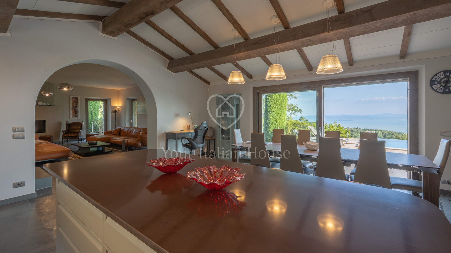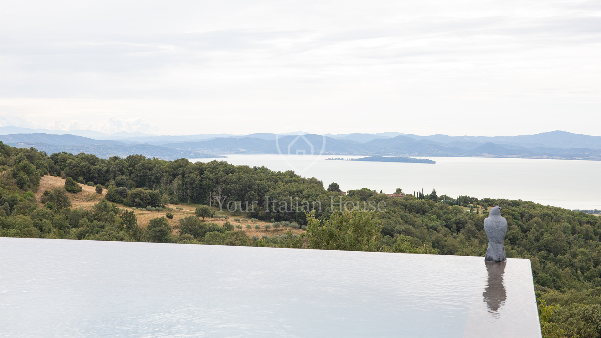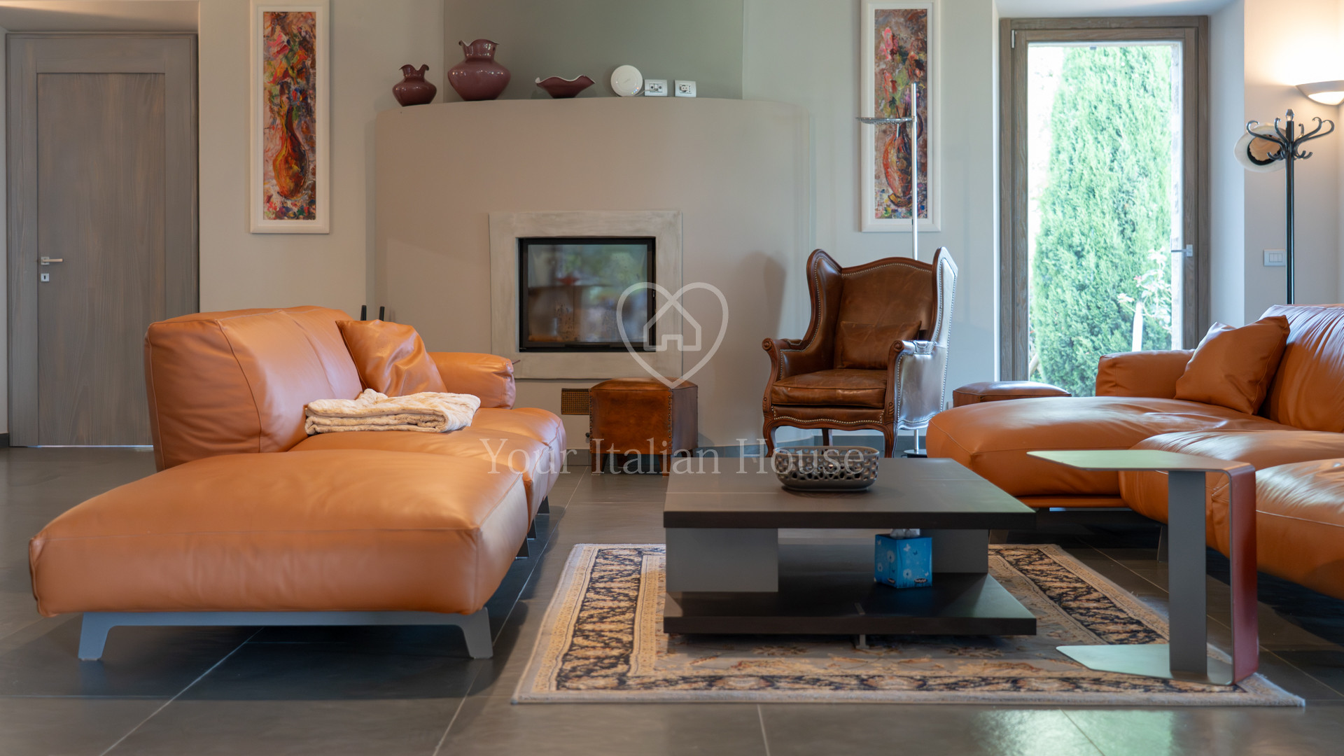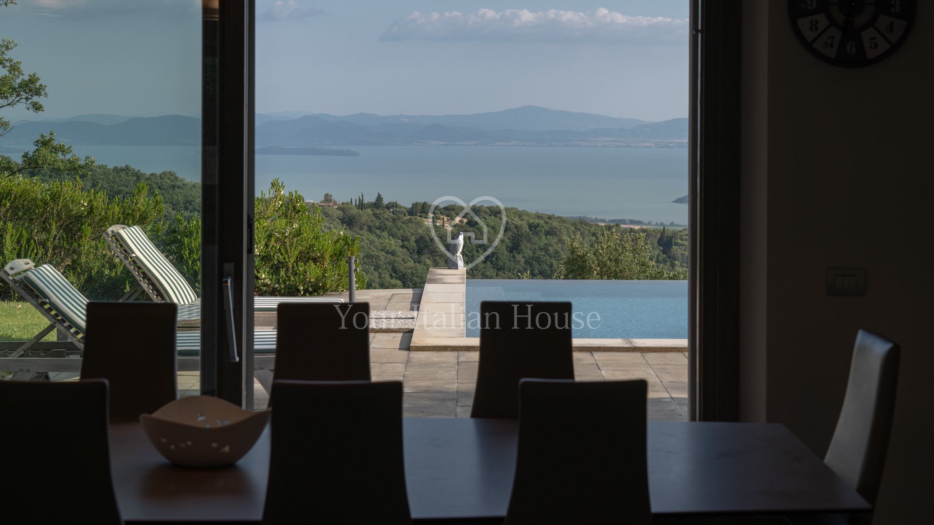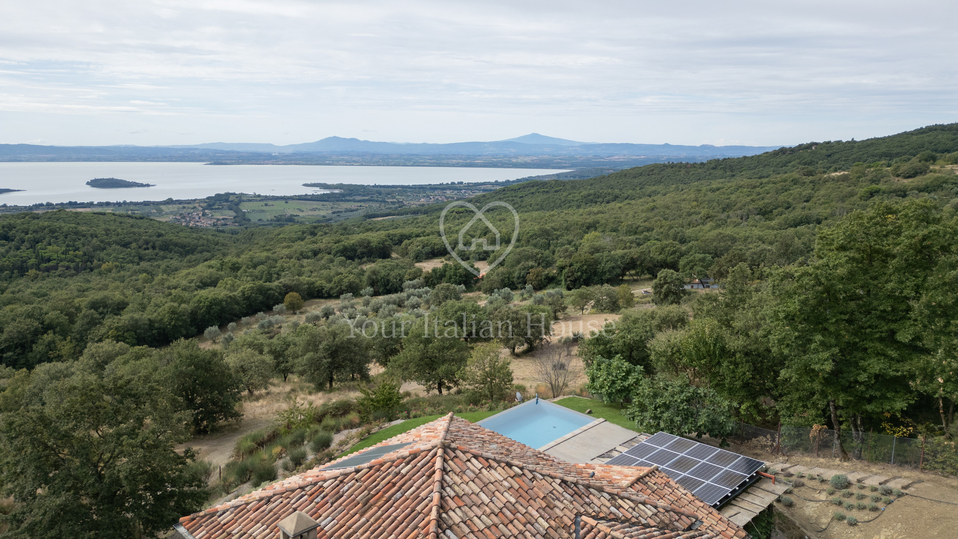 Dit prachtige pand, uniek in zijn soort en volledig gerenoveerd, bevindt zich in een schitterend omheind park van ongeveer 3.700 m² met fruitbomen en olijfbomen. Het hoogtepunt van de buitenruimte is zonder twijfel het verwarmde zwembad van 12 x 5 m, dat maximaal comfort biedt in elk seizoen. Het zwembad heeft een gelijkmatig, randloos oppervlak, wat een visueel spectaculair effect creëert en optimaal uitzicht biedt over het panoramische landschap.Op de begane grond verwelkomt de villa u met een ruime open keuken, waarin functioneel design en innovatie samenkomen. De keuken, uitgerust met hoogwaardige apparatuur en luxe afwerkingen, vormt het hart van het huis, ideaal voor gezellige momenten en culinaire hoogstandjes. Naast de keuken bevindt zich de royale woonkamer, verlicht door grote ramen. Ook op de begane grond bevindt zich een studeerkamer, ideaal voor werk of ontspanning met een goed boek. Twee slaapkamers en een badkamer maken dit niveau compleet en zorgen voor comfort en gebruiksgemak.Boven bieden twee tweepersoonsslaapkamers een privé en verfijnde sfeer, elk met een stijlvol ingerichte en-suite badkamer. Grote ramen bieden een prachtig uitzicht op het Trasimenomeer, en het ruime terras is een ideale plek om het landschap te bewonderen.De kelderverdieping herbergt een zeer ruime garage, ontworpen voor meerdere voertuigen, en biedt extra ruimte voor opslag of andere activiteiten. Deze multifunctionele ruimte is direct vanuit de woning toegankelijk.Kortom, deze villa is meer dan een huis: het is een ware woonervaring, waar modern design en natuurlijke schoonheid perfect samensmelten. De combinatie van elegante interieurs, charmante buitenruimtes en een adembenemend uitzicht op het Trasimenomeer maakt dit pand een unieke kans voor wie op zoek is naar het beste van hedendaags wonen in een exclusieve ambiance.
