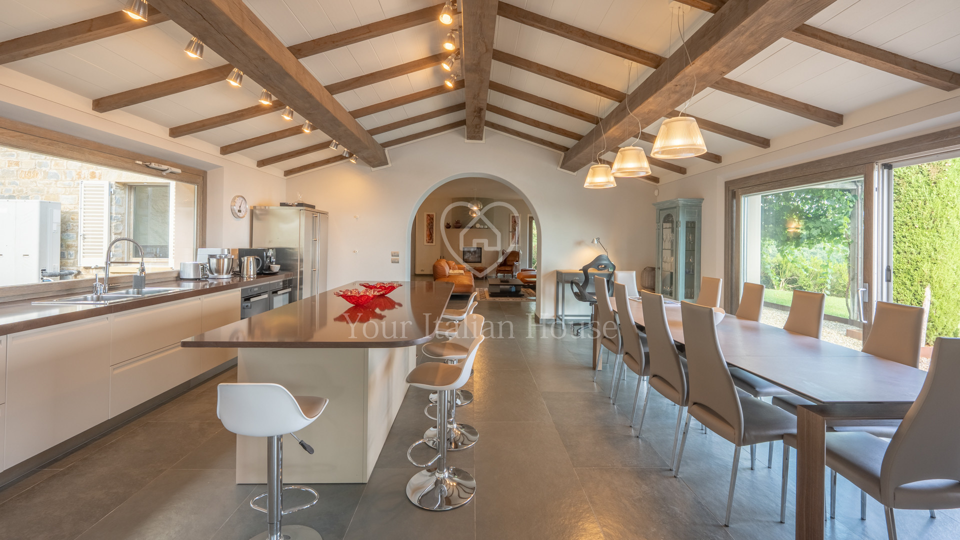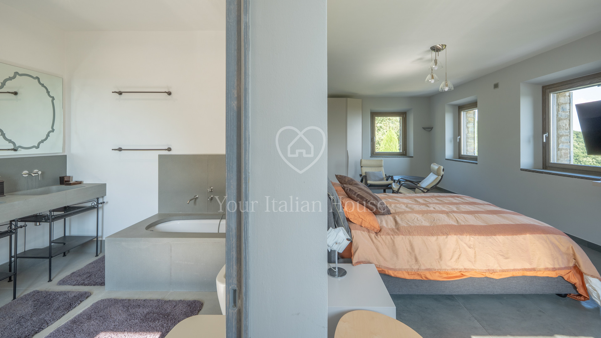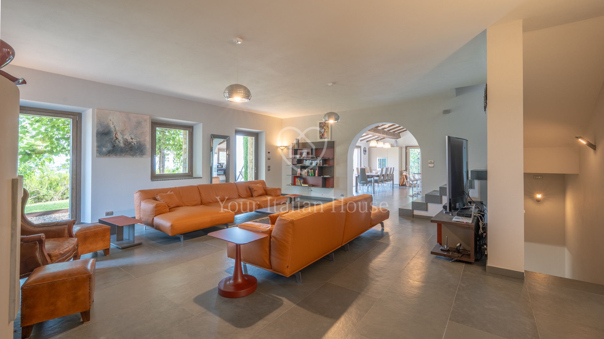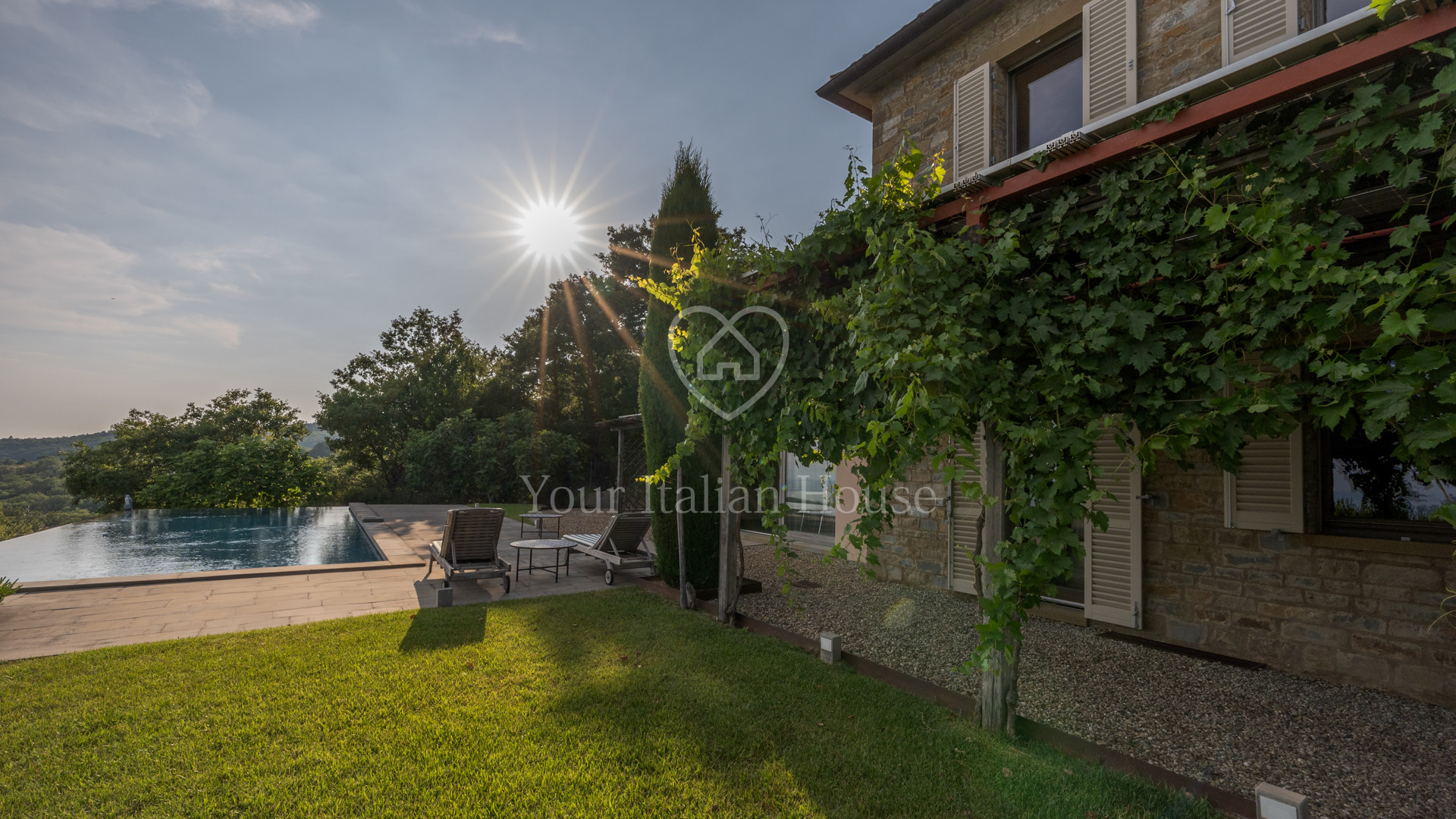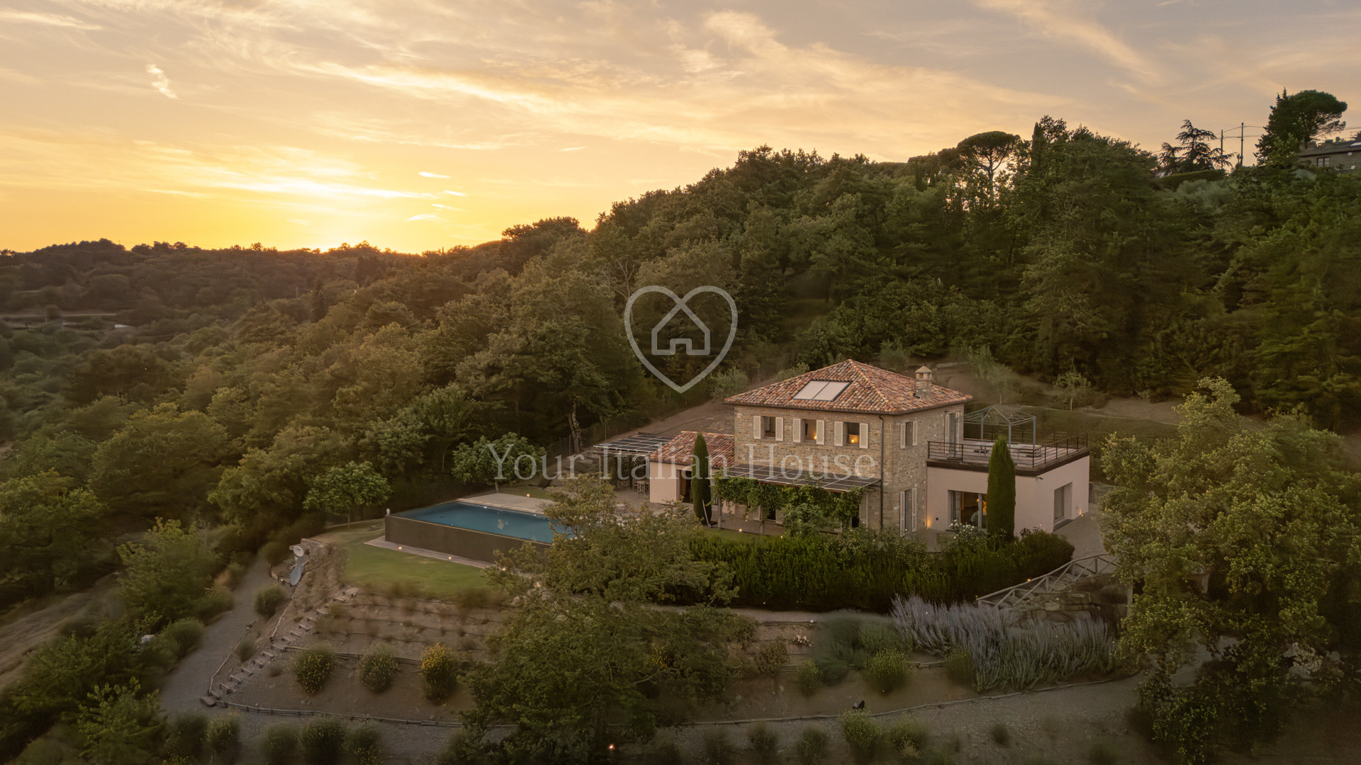 Dit prachtige pand, uniek in zijn soort en volledig gerenoveerd, bevindt zich in een schitterend omheind park van ongeveer 3.700 m² met fruitbomen en olijfbomen. Het hoogtepunt van de buitenruimte is zonder twijfel het verwarmde zwembad van 12 x 5 m, dat maximaal comfort biedt in elk seizoen. Het zwembad heeft een gelijkmatig, randloos oppervlak, wat een visueel spectaculair effect creëert en optimaal uitzicht biedt over het panoramische landschap.Op de begane grond verwelkomt de villa u met een ruime open keuken, waarin functioneel design en innovatie samenkomen. De keuken, uitgerust met hoogwaardige apparatuur en luxe afwerkingen, vormt het hart van het huis, ideaal voor gezellige momenten en culinaire hoogstandjes. Naast de keuken bevindt zich de royale woonkamer, verlicht door grote ramen. Ook op de begane grond bevindt zich een studeerkamer, ideaal voor werk of ontspanning met een goed boek. Twee slaapkamers en een badkamer maken dit niveau compleet en zorgen voor comfort en gebruiksgemak.Boven bieden twee tweepersoonsslaapkamers een privé en verfijnde sfeer, elk met een stijlvol ingerichte en-suite badkamer. Grote ramen bieden een prachtig uitzicht op het Trasimenomeer, en het ruime terras is een ideale plek om het landschap te bewonderen.De kelderverdieping herbergt een zeer ruime garage, ontworpen voor meerdere voertuigen, en biedt extra ruimte voor opslag of andere activiteiten. Deze multifunctionele ruimte is direct vanuit de woning toegankelijk.Kortom, deze villa is meer dan een huis: het is een ware woonervaring, waar modern design en natuurlijke schoonheid perfect samensmelten. De combinatie van elegante interieurs, charmante buitenruimtes en een adembenemend uitzicht op het Trasimenomeer maakt dit pand een unieke kans voor wie op zoek is naar het beste van hedendaags wonen in een exclusieve ambiance.