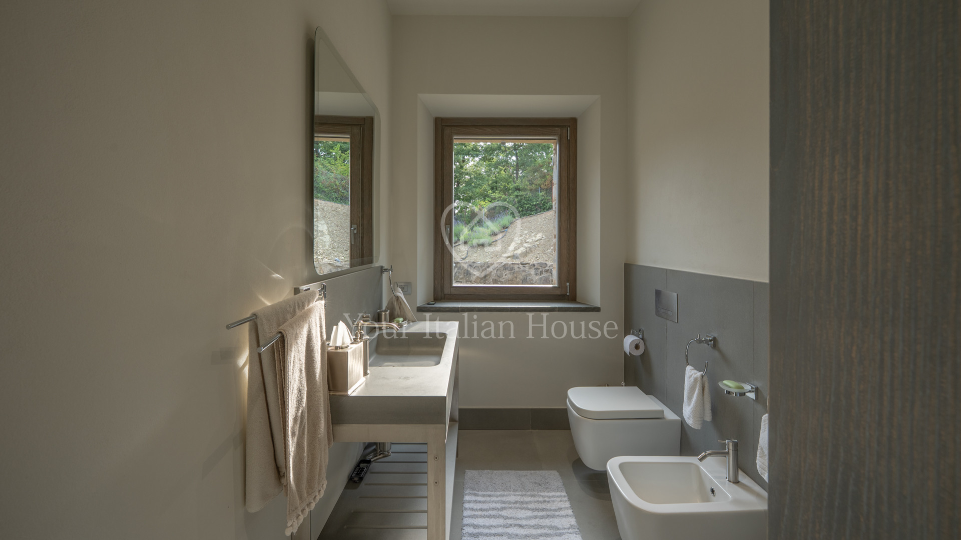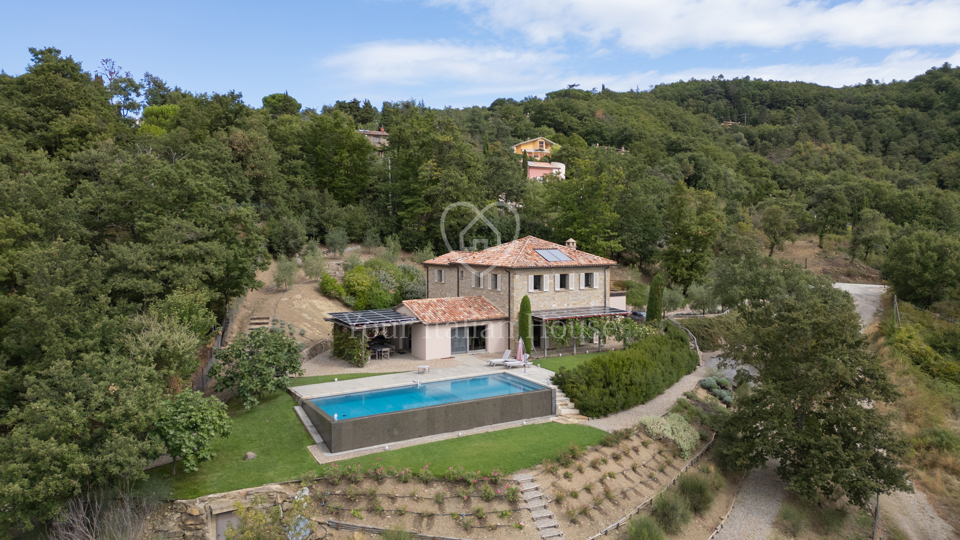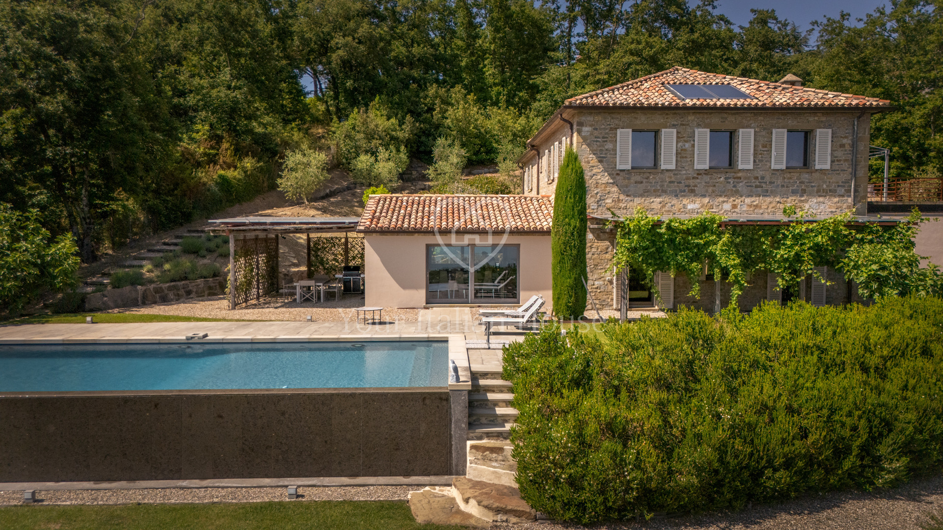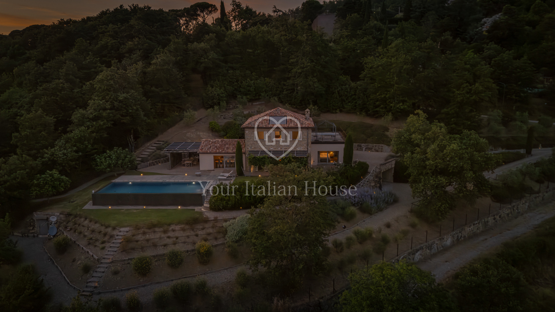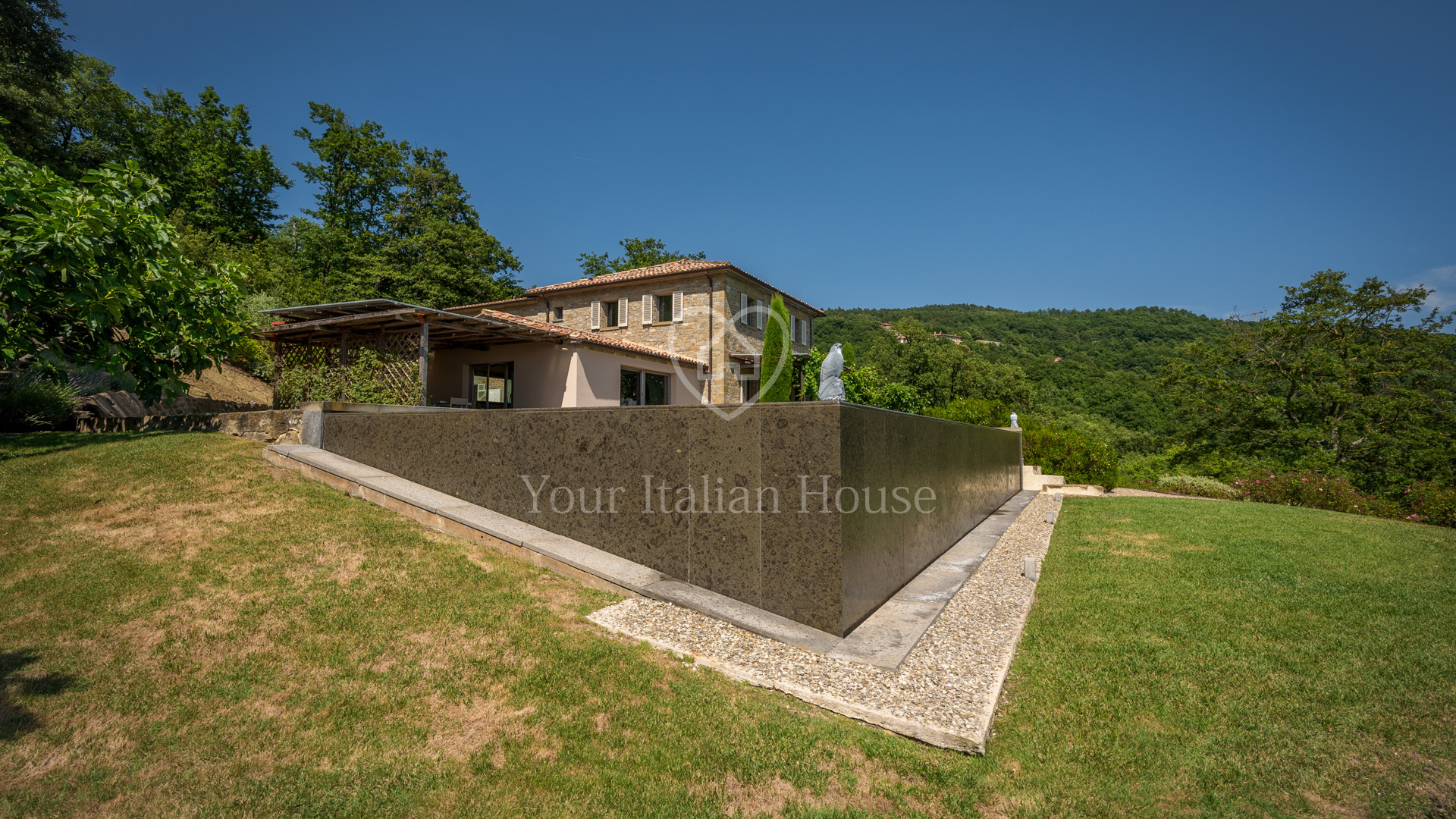 Dit prachtige pand, uniek in zijn soort en volledig gerenoveerd, bevindt zich in een schitterend omheind park van ongeveer 3.700 m² met fruitbomen en olijfbomen. Het hoogtepunt van de buitenruimte is zonder twijfel het verwarmde zwembad van 12 x 5 m, dat maximaal comfort biedt in elk seizoen. Het zwembad heeft een gelijkmatig, randloos oppervlak, wat een visueel spectaculair effect creëert en optimaal uitzicht biedt over het panoramische landschap.Op de begane grond verwelkomt de villa u met een ruime open keuken, waarin functioneel design en innovatie samenkomen. De keuken, uitgerust met hoogwaardige apparatuur en luxe afwerkingen, vormt het hart van het huis, ideaal voor gezellige momenten en culinaire hoogstandjes. Naast de keuken bevindt zich de royale woonkamer, verlicht door grote ramen. Ook op de begane grond bevindt zich een studeerkamer, ideaal voor werk of ontspanning met een goed boek. Twee slaapkamers en een badkamer maken dit niveau compleet en zorgen voor comfort en gebruiksgemak.Boven bieden twee tweepersoonsslaapkamers een privé en verfijnde sfeer, elk met een stijlvol ingerichte en-suite badkamer. Grote ramen bieden een prachtig uitzicht op het Trasimenomeer, en het ruime terras is een ideale plek om het landschap te bewonderen.De kelderverdieping herbergt een zeer ruime garage, ontworpen voor meerdere voertuigen, en biedt extra ruimte voor opslag of andere activiteiten. Deze multifunctionele ruimte is direct vanuit de woning toegankelijk.Kortom, deze villa is meer dan een huis: het is een ware woonervaring, waar modern design en natuurlijke schoonheid perfect samensmelten. De combinatie van elegante interieurs, charmante buitenruimtes en een adembenemend uitzicht op het Trasimenomeer maakt dit pand een unieke kans voor wie op zoek is naar het beste van hedendaags wonen in een exclusieve ambiance.