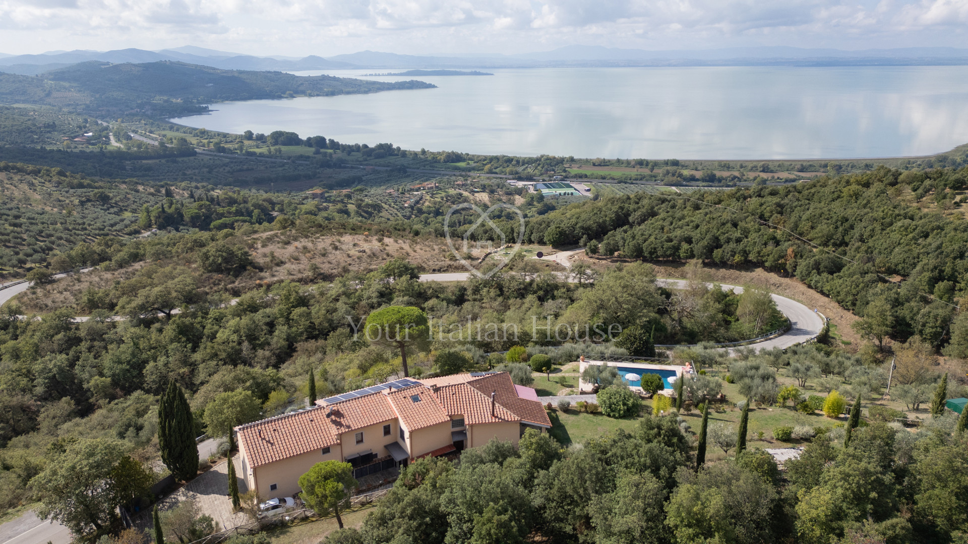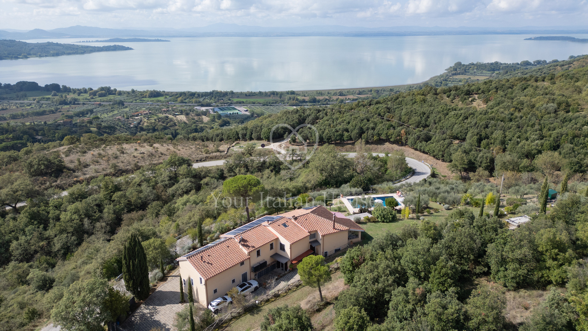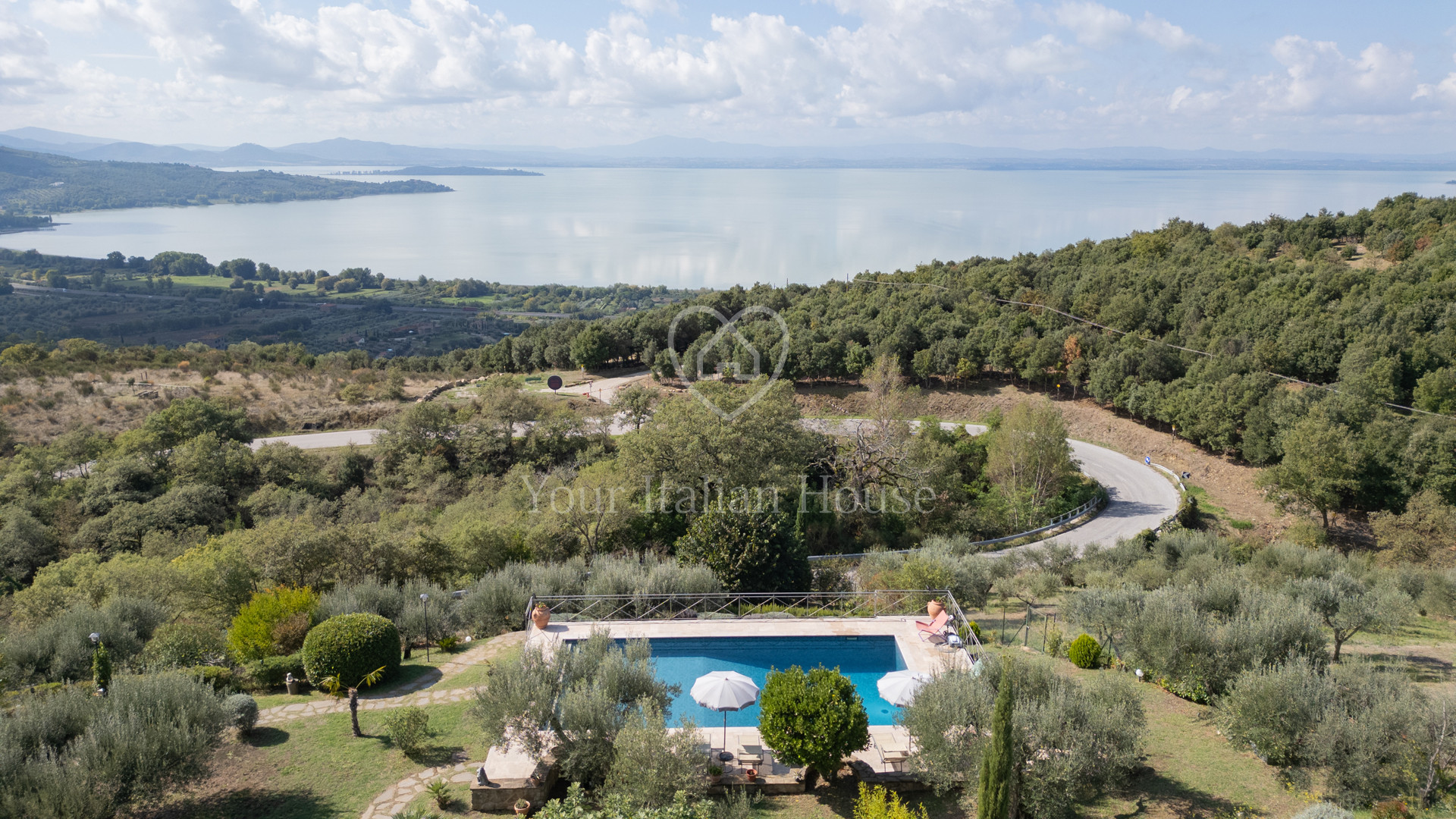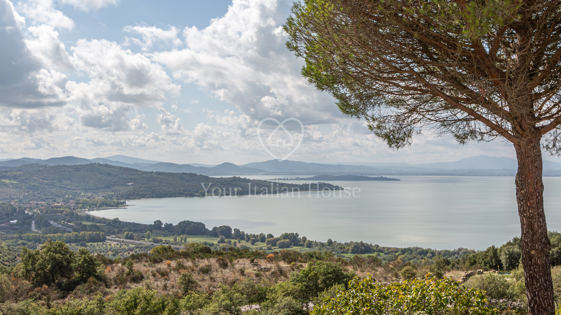 Op de groene heuvels van het meer van Trasimeno, op een panoramische positie, staat deze prachtige recent gerenoveerde villa. Het pand van ongeveer 370 m² is verticaal verdeeld in 2 wooneenheden. Het hoofdgedeelte bestaat uit een grote lichte woonkamer, een keuken met grote ramen van waaruit je het prachtige uitzicht op het meer van Trasimeno kunt bewonderen, een slaapkamer en 2 badkamers. Een interne trap leidt naar de eerste verdieping waar zich een grote woonkamer met open haard, 3 slaapkamers en 3 badkamers bevinden. Het tweede appartement, intiemer en gezelliger, bestaat op de begane grond uit een woonkamer/keuken en een verdieping en op de eerste verdieping uit twee slaapkamers met een panoramisch uitzicht op het omringende landschap en een badkamer. Om het pand compleet te maken, is er ongeveer 16.000 m² grond met ongeveer 150 olijfbomen in productie en een groene en goed onderhouden tuin die een ideale ruimte is om te ontspannen terwijl je het uitzicht op het meer bewondert. Er is ook een zwembad van 12×6.