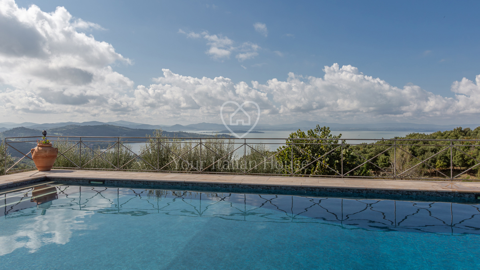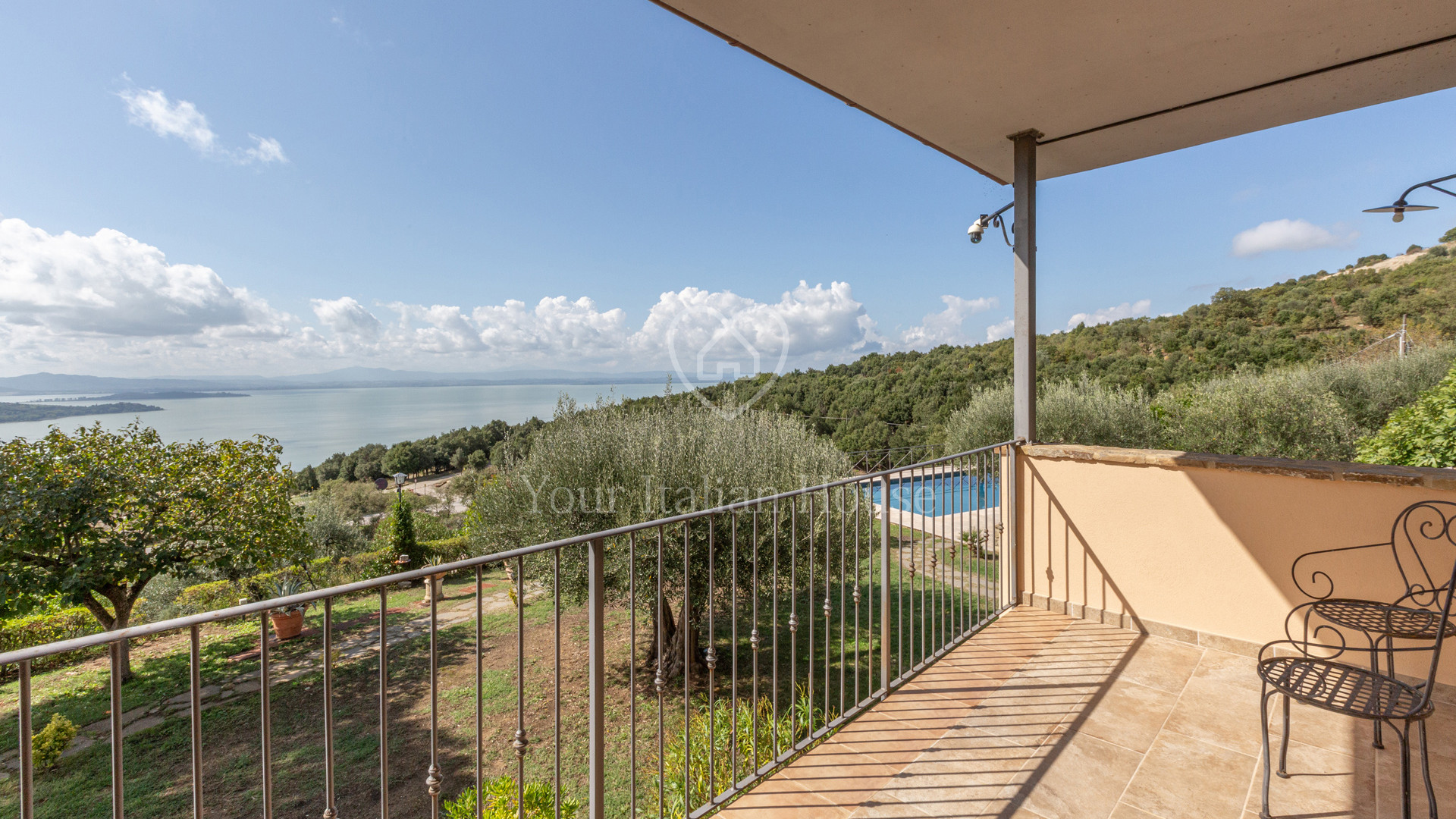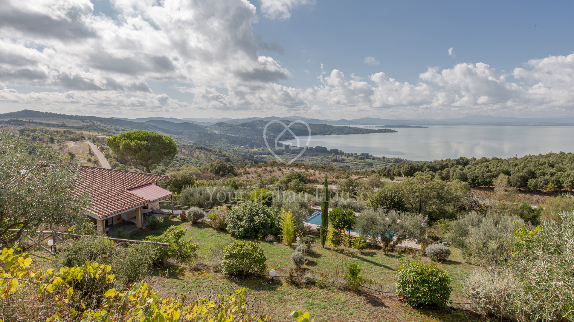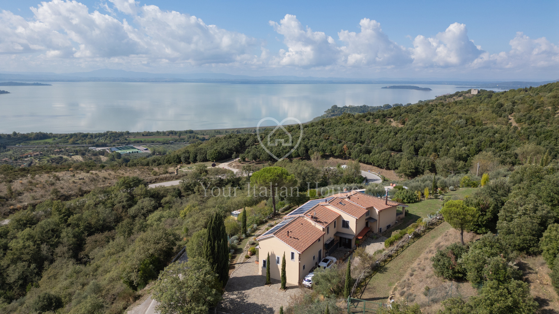 Op de groene heuvels van het meer van Trasimeno, op een panoramische positie, staat deze prachtige recent gerenoveerde villa. Het pand van ongeveer 370 m² is verticaal verdeeld in 2 wooneenheden. Het hoofdgedeelte bestaat uit een grote lichte woonkamer, een keuken met grote ramen van waaruit je het prachtige uitzicht op het meer van Trasimeno kunt bewonderen, een slaapkamer en 2 badkamers. Een interne trap leidt naar de eerste verdieping waar zich een grote woonkamer met open haard, 3 slaapkamers en 3 badkamers bevinden. Het tweede appartement, intiemer en gezelliger, bestaat op de begane grond uit een woonkamer/keuken en een verdieping en op de eerste verdieping uit twee slaapkamers met een panoramisch uitzicht op het omringende landschap en een badkamer. Om het pand compleet te maken, is er ongeveer 16.000 m² grond met ongeveer 150 olijfbomen in productie en een groene en goed onderhouden tuin die een ideale ruimte is om te ontspannen terwijl je het uitzicht op het meer bewondert. Er is ook een zwembad van 12×6.